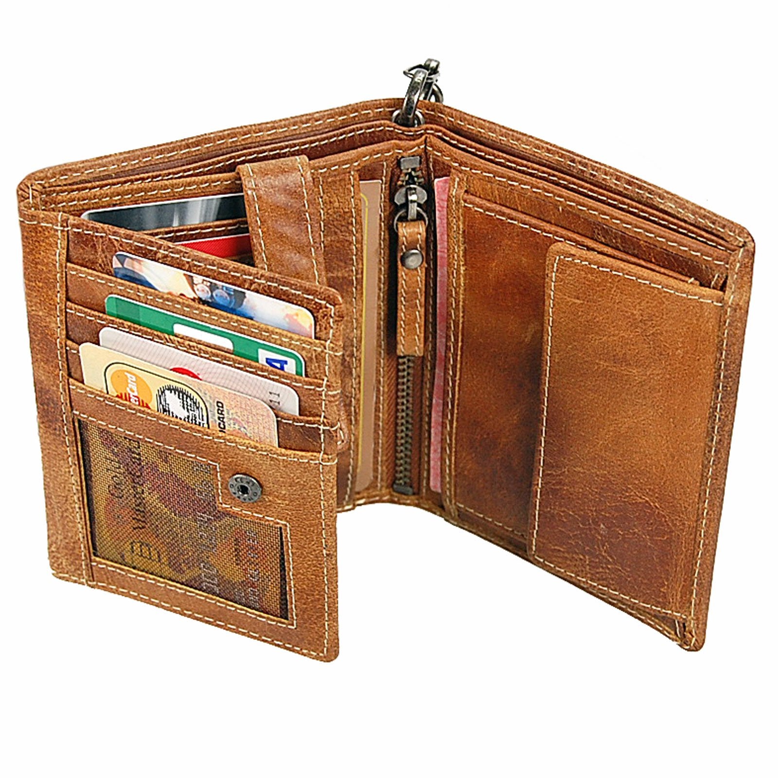 - "The center zip compartment keeps prying eyes away from your important items. The sturdy metal chain ensures that the biker wallet is securely attached. The chain wallet is made of water buffalo leather in a vintage look."]