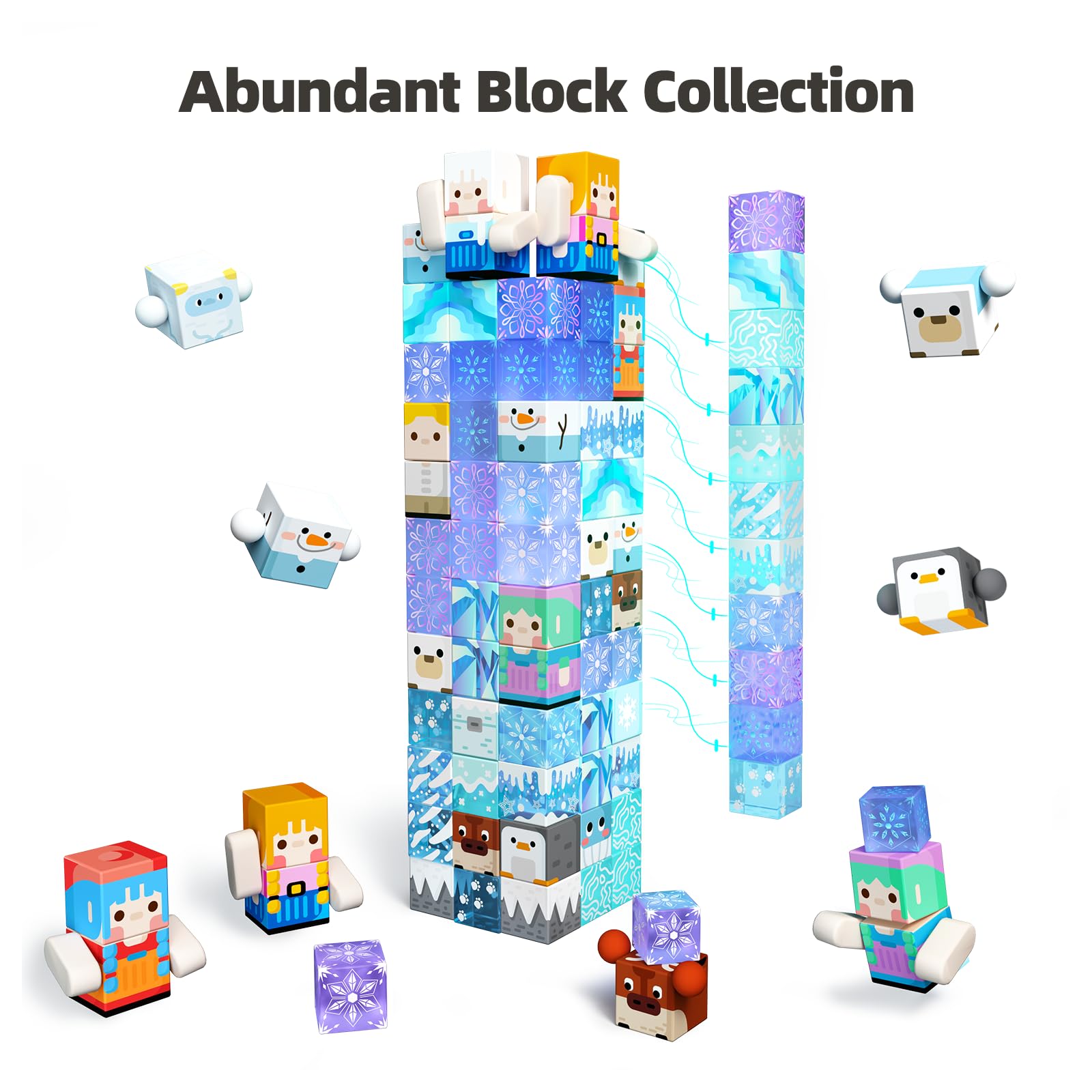 "Explore the adventure of Frozen: The Frozen themed magnetic building blocks are designed for girls aged 3 and up who love the world of Frozen; they are designed in cool colors like ice blue, silver, and white, featuring classic patterns like snow and ice crystals that allow children to immerse themselves in the world of Frozen and foster their creativity
