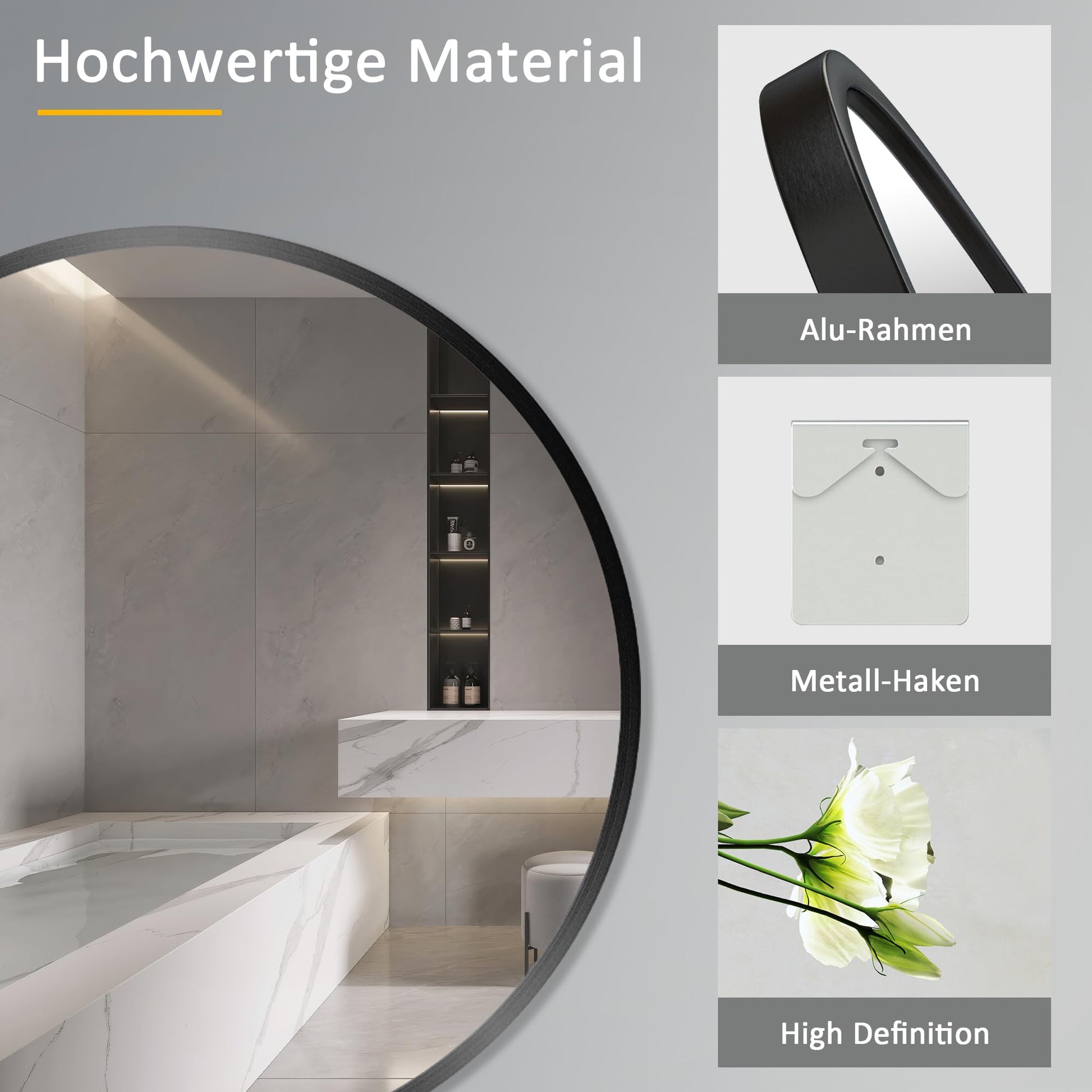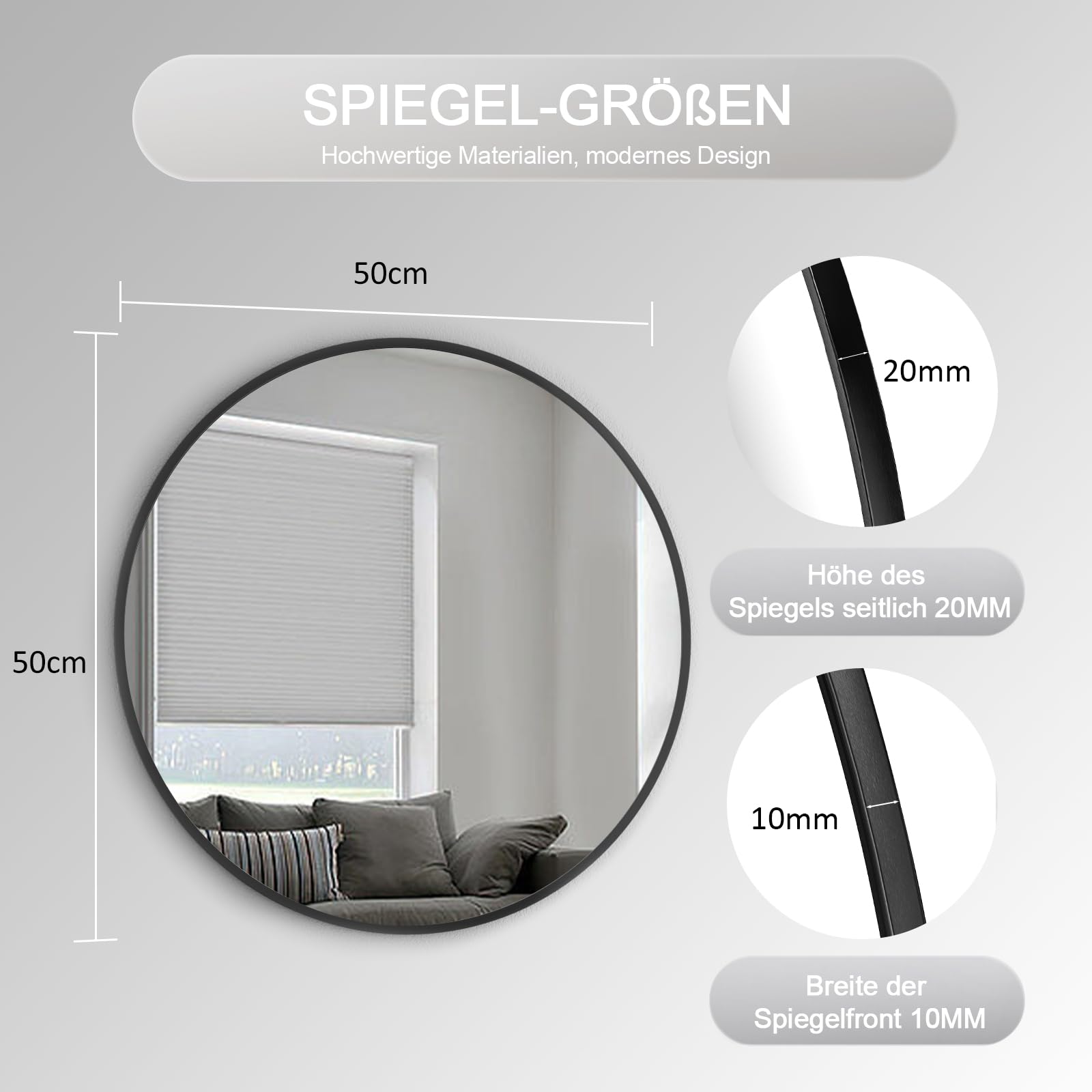 ["Round Mirror Black Size: 50 cm, The distance of the mirror from the wall: 2cm.","High-quality matte black aluminum frame. Bathroom mirror with black frame adds a touch of class, perfect for makeup, shaving, haircuts, etc.","Black mirror with minimalist design, perfect size and trendy with slim edge, truly a good choice for your newly decorated bathroom, wardrobe, hallway, basement, shower room, Scandi-style living room, powder room, above the fireplace in the foyer, etc.","5mm HD copper-free and lead-free environmentally friendly mirror. Has higher reflectivity and more corrosion-resistant coating.","Each mirror is packed in a high-quality, reinforced cardboard box to ensure smooth and undamaged delivery. If you have any questions, feel free to contact us."]