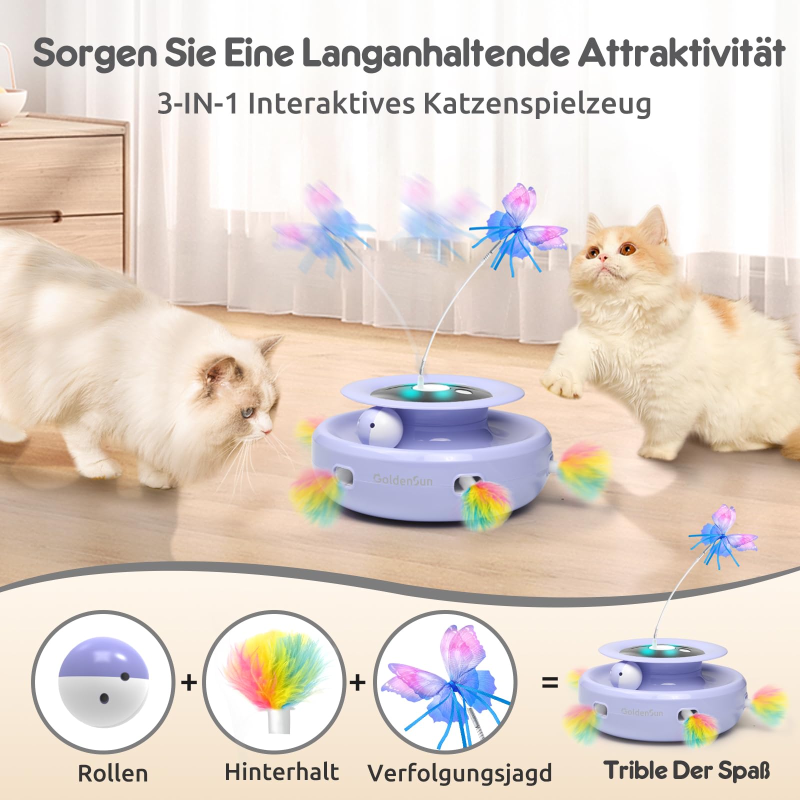 ["🎁[3-in-1 für mehr Spaß] The interactive cat toys from GoldenSun aim to stimulate cats' natural instincts: chasing, pouncing, and ambushing. The spinning balls engage your cat's senses. The random popping feather stimulates the hunting instinct. And the rotating butterfly encourages hunting. All of this entertains your cats and burns their energy!","🔋[Built-in 2000mAh Battery] High-capacity electronic cat toy. 2 hours of charging for a week of operation! No need to buy additional power - Save money!!! The 3-in-1 cat toy does not need to be connected to the charger for operation, so you can take it anywhere without worrying about cables.","😻[Safe Handmade Fabric Butterflies on Amazon Debut] GoldenSun's butterfly cat toy is made of fabric instead of plastic. No sharp edges or hard plastic parts that could harm your cat's eyes and nose. The butterfly has two modes: it spins continuously and the vibration mode provides short spins that really get the cats moving.","🐾[Durable ABS Material] The entire toy is made of ABS material. The ball track is smooth and sturdy to ensure the safety of your cat's paws. The toy's surface is designed without holes to prevent the cat's claws from getting caught. Entertaining and ensuring the safety of cats at the same time.","⏱️[Timer Function and Smart Mode] GoldenSun's automatic cat toy activates every 3 hours for 10/12 minutes and automatically switches to standby mode. Cats can enjoy the toy while you're away at work. Automatic shutdown in dark environment in the 4th mode (dim light) to ensure a deep sleep for you and your cat.","😻 [Reliable 18-Month Warranty] If you have any concerns, please contact us and we will provide a satisfactory solution within 16 hours."]