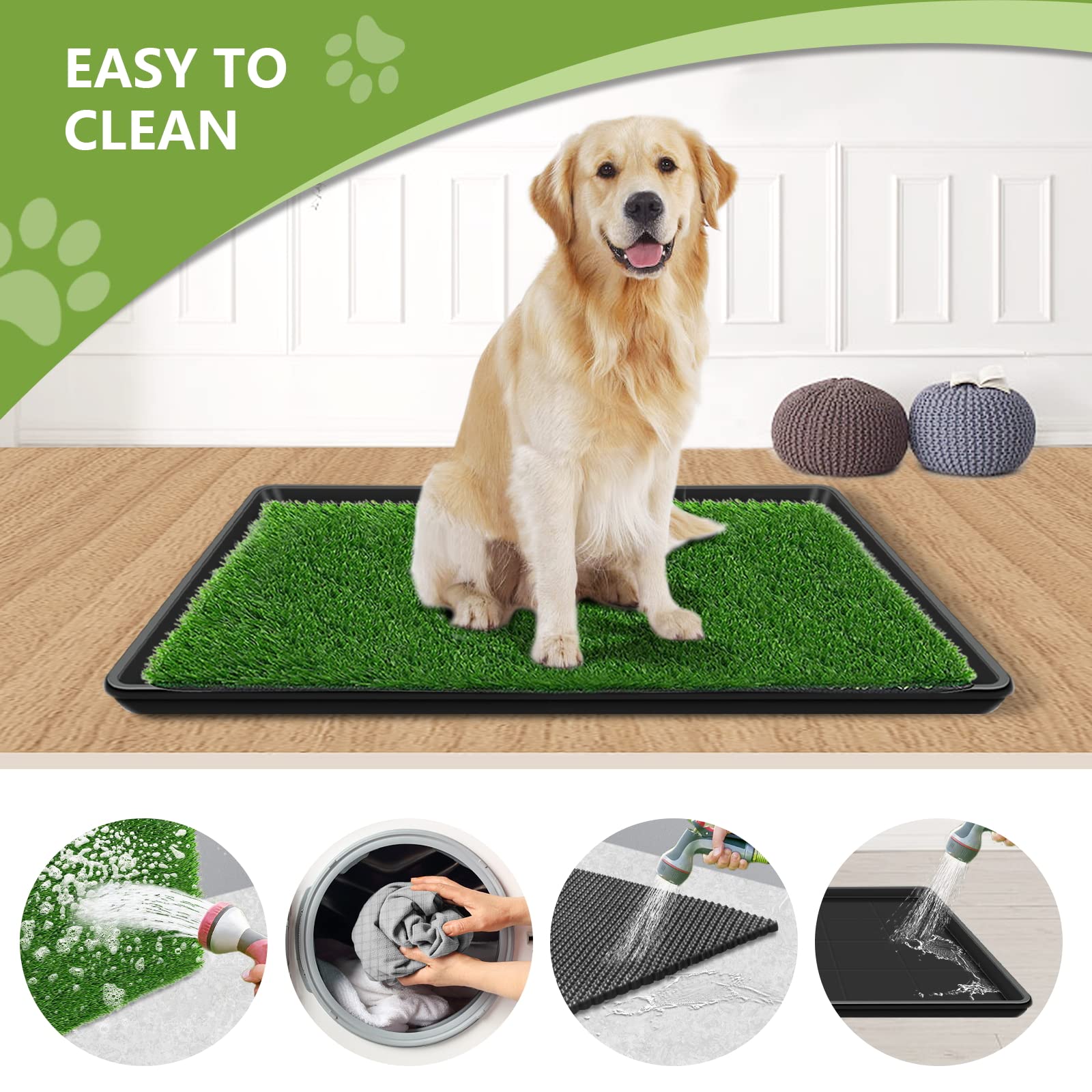 ["4-Layer System"] 2 pieces of artificial turf + washable pee pad + collection tray + large tray Artificial turf for dogs is soft and lush. Washable pet training pads absorb urine quickly and control odors. The collection tray prevents urine from accumulating and does not leave stains on your pet's paws. Trays keep your floors clean. You won't experience messy cleaning.