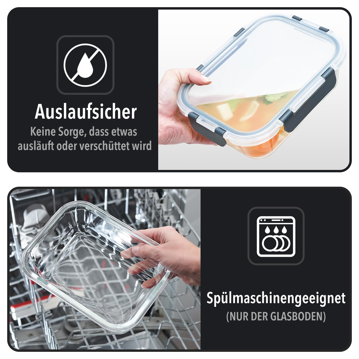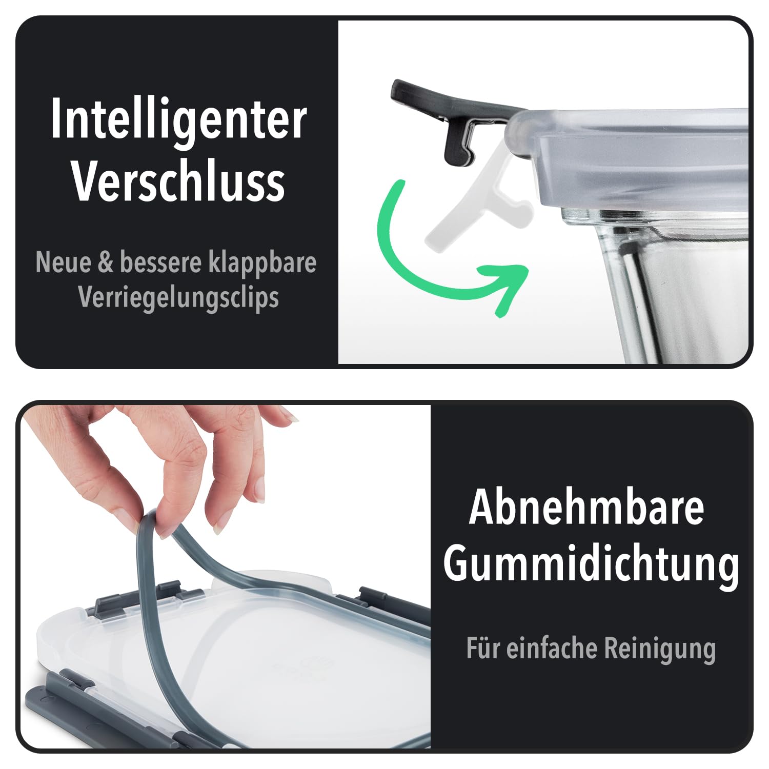Airtight, leakproof & space-saving stackable - Our food storage containers glass with lids close securely thanks to BPA-free click locks and silicone seals 100% airtight and waterproof - no more spilled food. The glass bowls with lids are stackable and nestable - ideal for small kitchens.