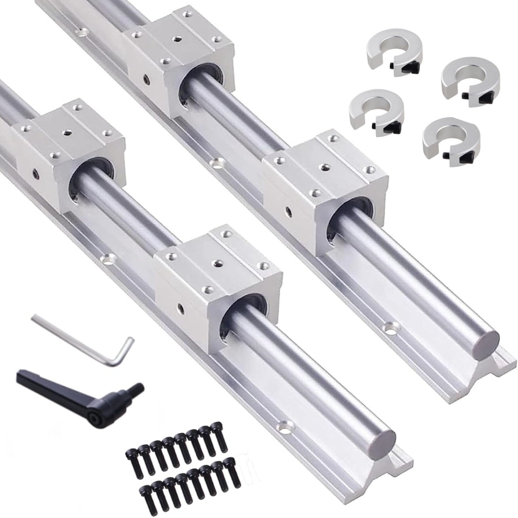 ["SBR linear guide rail set: SBR20-31.5 in. linear motion guide rail includes 2 pieces of 31.5 in. long SBR20 guide rails, 4 x SBR20UU slide blocks, 4 x SBR20 rail stoppers, 1 x locking handle, 16 pieces of M6x20 screws for connecting the slide bearing blocks and plates as accessories, and 1 x wrench.", "Wide application: The linear guide rail is commonly used in automation machines such as CNC milling machines, lathes, machine tools, bending machines, laser welding machines, etc. It is also suitable for large gear devices like industrial robots.", "Product advantages: The linear guide rail is a complete sliding unit system that can be securely clamped with high accuracy by simply tightening. It can move smoothly without deviation, minimal wear, and low noise due to its high precision and durability.", "High-quality steel material: Linear rails for CNC parts are made of carbon steel. The linear bearing is made of high-quality bearing steel. The product's surface is chrome-plated, beautiful and rust-resistant, more durable and has high hardness.", "Simple installation: Aluminum alloy support rails with pre-drilled holes are easy to install. The linear optical axis made of stainless steel can control the linear movement of the bearing. This product is easy to install and requires no maintenance."]