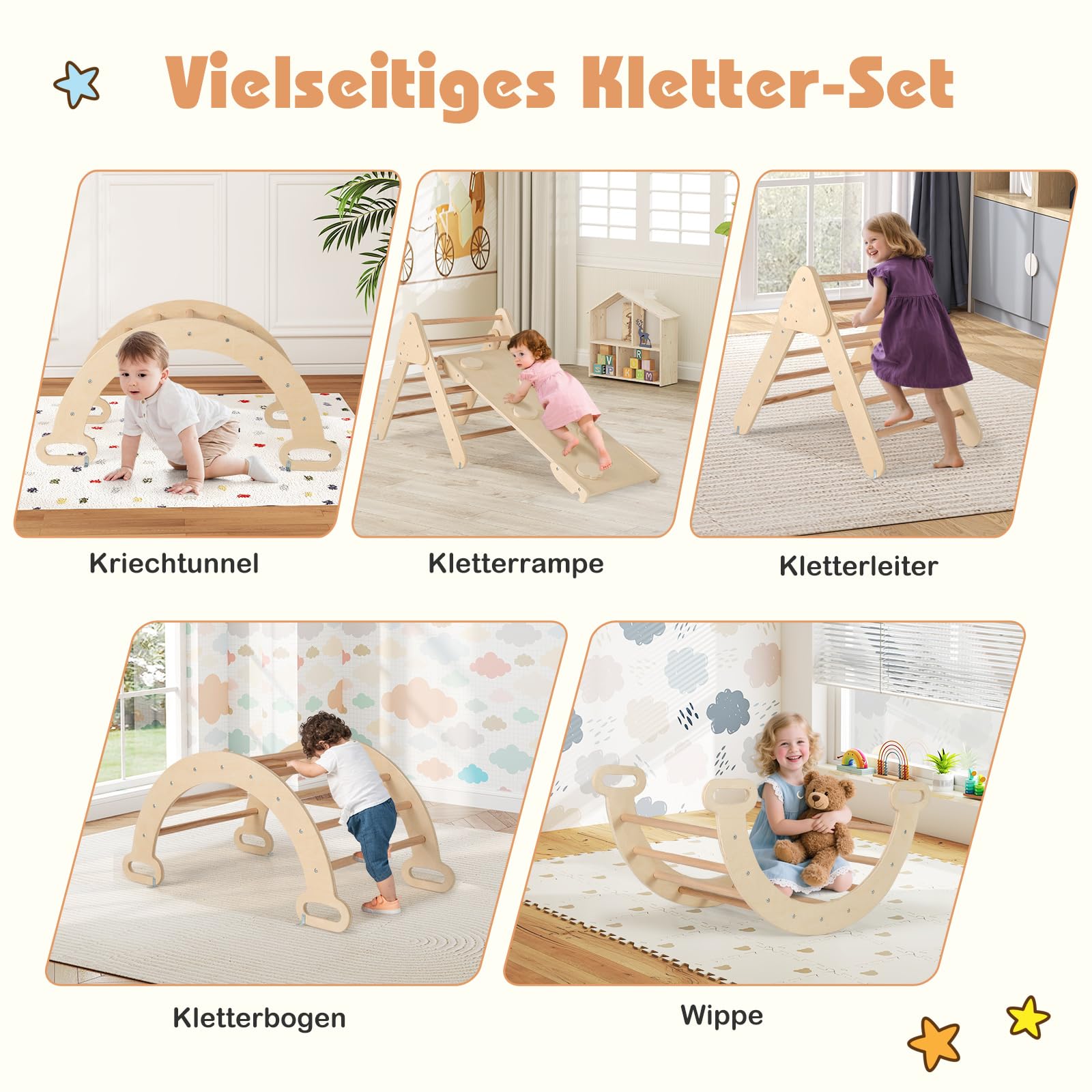 ["✨Different combinations: This climbing gear set consists of three different parts that can serve as a slide, climbing triangle, climbing ramp, climbing arch, or rocking arch. It plays an important role in teaching children at an early age skills such as crawling, sliding, and climbing. Even better, the adjustable height ladder allows you to freely choose the difficulty level to accommodate different age groups.","✨Extra sturdy and safe structure: With stable triangular and arch support structures, this climbing triangle toy set provides security against wobbling and collapse. A solid screw connection also ensures stability of the overall structure. The combined climbing frame is also safe enough for children to crawl on, as it is securely locked in place.","✨Discover more fun play possibilities: The climbing triangle set comes with a 2-in-1 reversible ramp, with one side completely smooth for sliding, while the other side is equipped with 5 child-friendly handles to serve as a climbing wall. Additionally, the arch toy is not only a climbing arch, but also a rocking arch. This toy set offers endless possibilities and ensures hours of fun!","✨Premium material and well-crafted: Made of solid beech wood poles and exquisitely crafted by hand, this climbing triangle set will stand the test of time. The splinter-free surface and rounded corners effectively protect the delicate skin of children. Furthermore, the healthy water-based paint ensures a reliable user experience.","✨Accompany your child's growth: This is a great toy to keep children active, helping them develop balance skills, inspire creativity, improve body coordination, build self-confidence, and reduce screen time. It is suitable from the age of 1 year as a birthday or holiday gift. A great addition for home, daycare, early learning center, or amusement park!"]