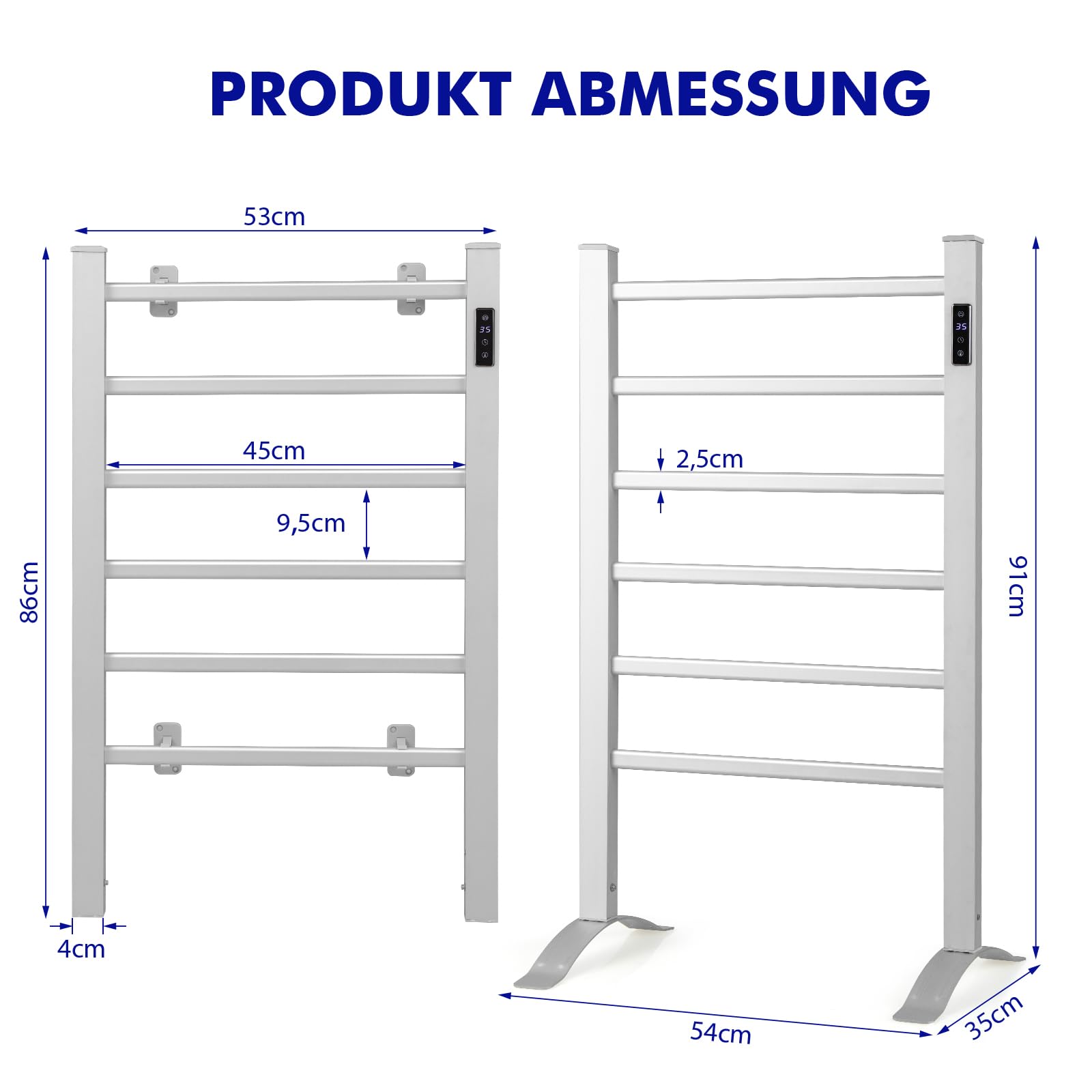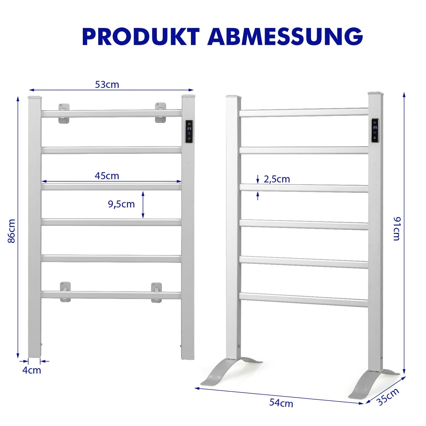 Two installation methods: This towel warmer can be mounted on the wall or equipped with two support feet attached to the bottom, allowing the towel rack to stand on the floor."