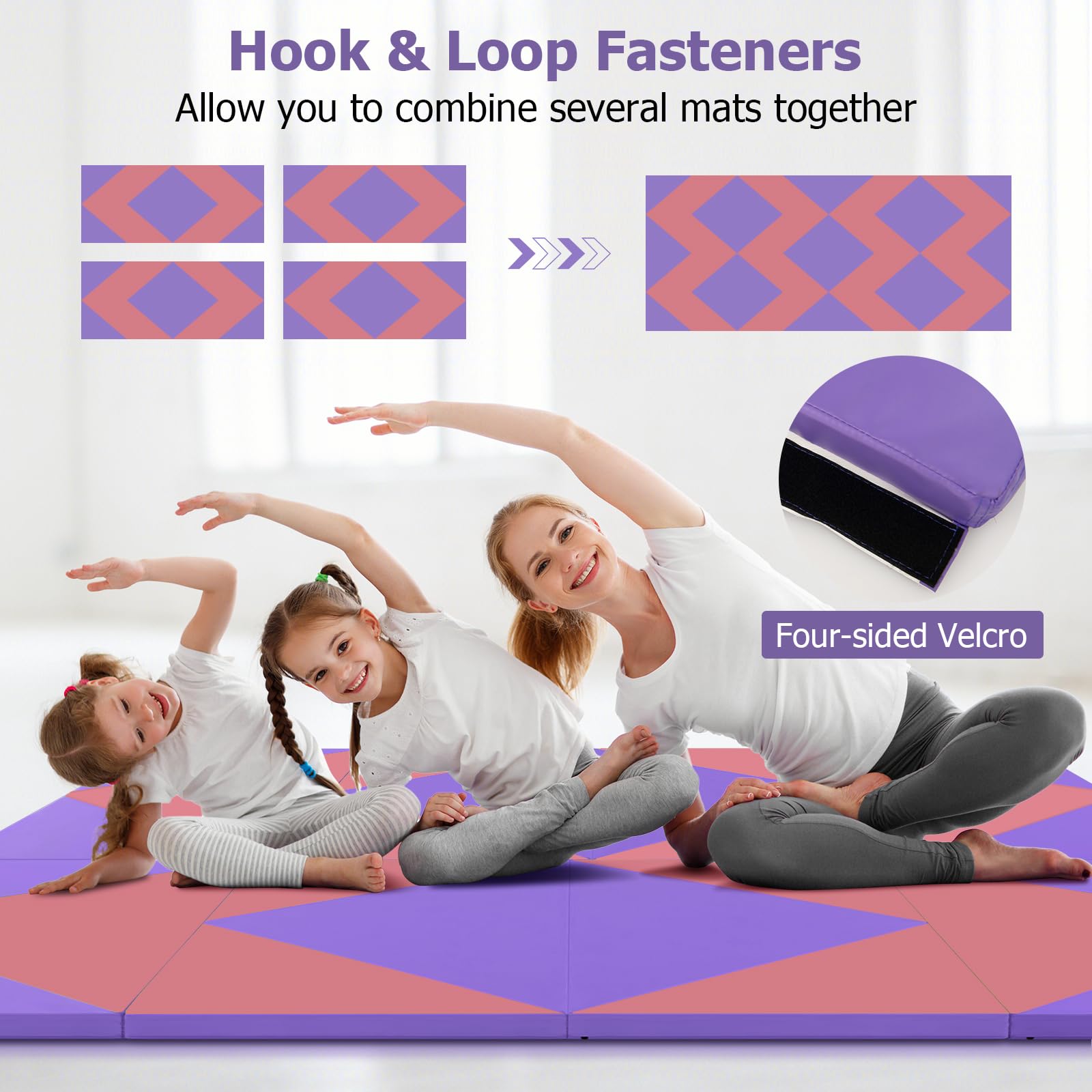 GOPLUS Folding Gym Mat, 240×117×5cm, Soft Floor Exercise Mat with 2 handles & Velcro Straps, suitable for Gymnastics, Yoga, and Play, Fitness Mat for Home (Pink + Purple)