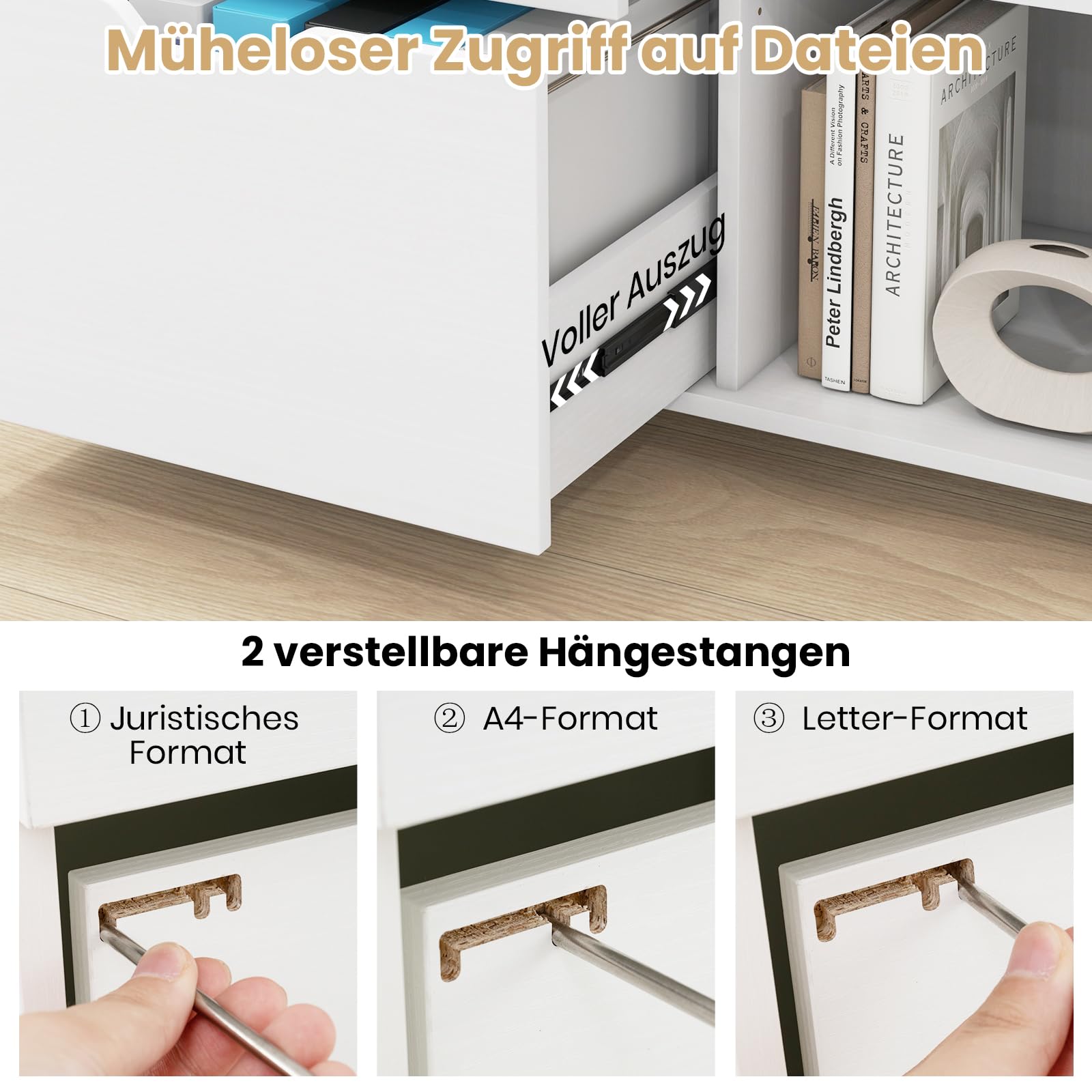 "Adjustable File Organization: The file drawer equipped with 2 adjustable hanging rails accommodates A4, Legal, and Letter sizes for modern professionals who demand organization in their workspace.",