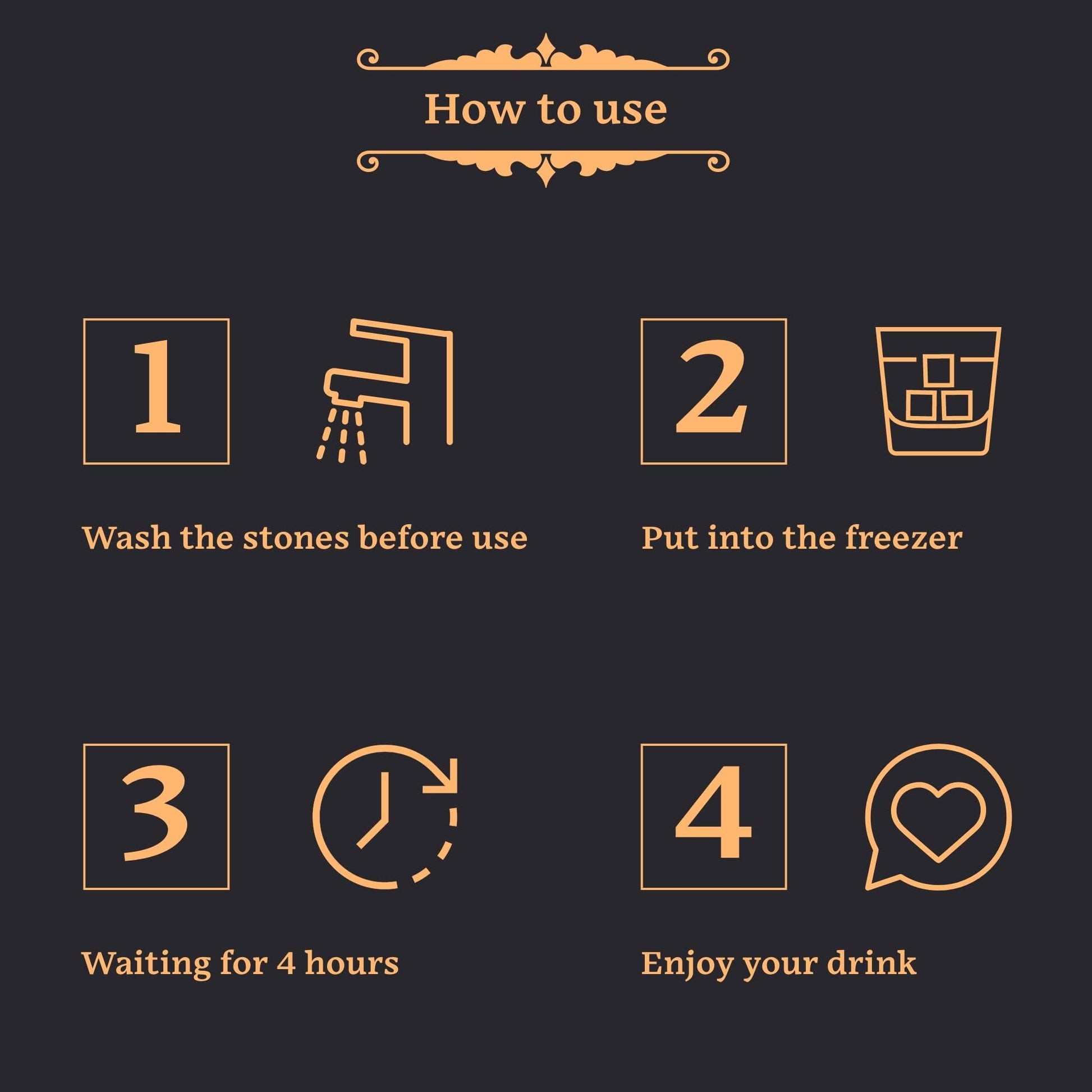 ["Pure Enjoyment - With the flavorless and reusable whiskey stones, you can enjoy the drink from the first to the last sip. The rounded edges prevent scratching of the glasses and the velvet bag is perfect for storing and cooling the whiskey stones.","100% stainless steel in gold look - Stainless steel cools faster than stone. Wash the stones, place them in the freezer for 4 hours, and enjoy the chilled drink with 100% authentic taste","High-quality Whisky Set - The set includes 6 gold whiskey stones, stainless steel tongs, and a velvet bag for cooling and storing the stones. All of this comes in a high-quality wooden gift box, which protects the set and allows for perfect storage","Versatile - Our whisky stones not only cool whisky, but also rum, gin, vodka, or soft drinks up to 20ml optimally. The cooling stones are perfect for all drinks that should stay cool without diluting at the same time","Perfect Gift - Our cooling stones set is sure to stand out and is the perfect choice for your loved ones for special occasions like Christmas, Father's Day, and even weddings. Whatever the occasion, the set ensures a unique gift."]