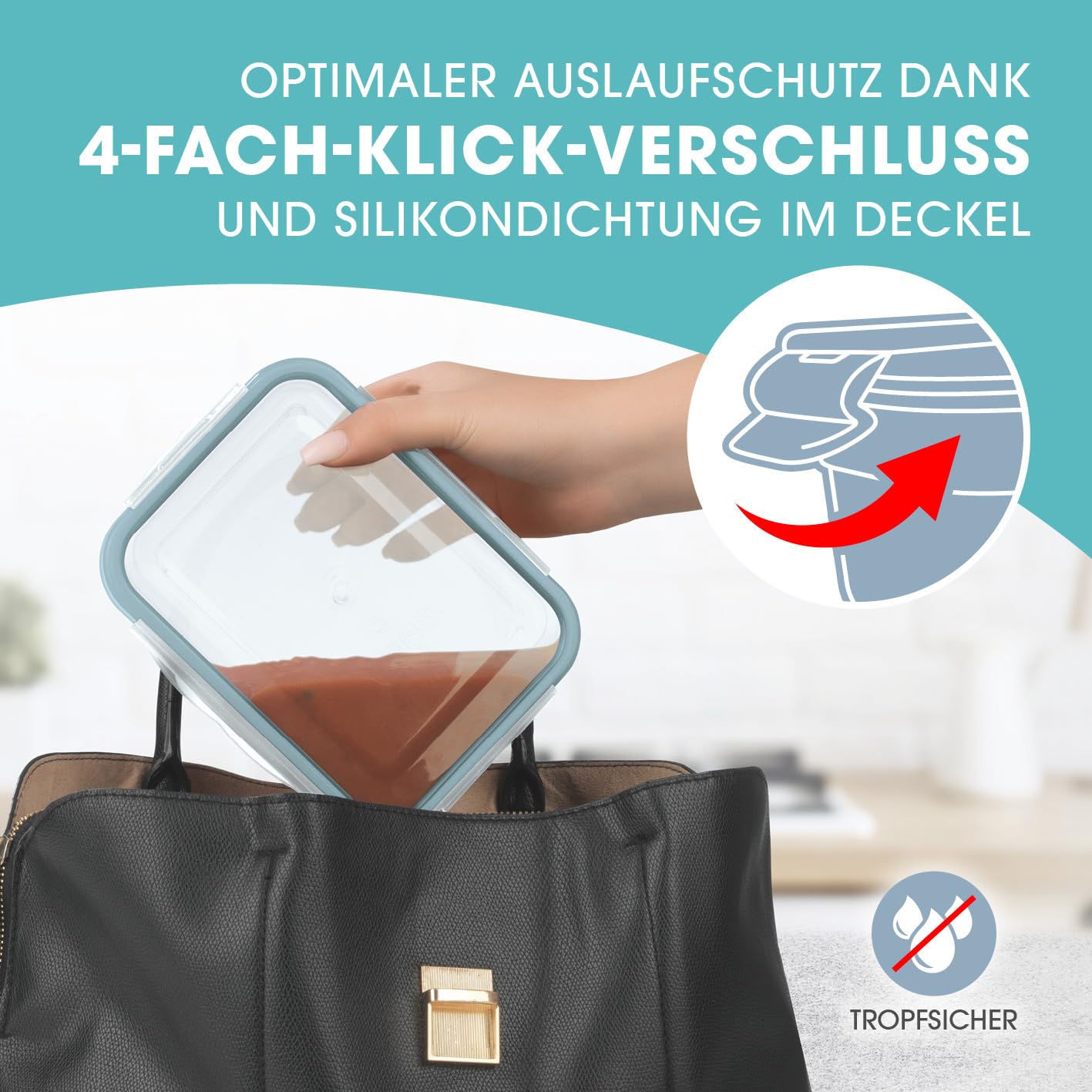 "QUALITY - The elegant GOURMETmaxx glass containers with lids made of durable borosilicate glass come with a BPA-free plastic lid with a 4-click system and a silicone sealing ring to seal drip-proof and airtight.",