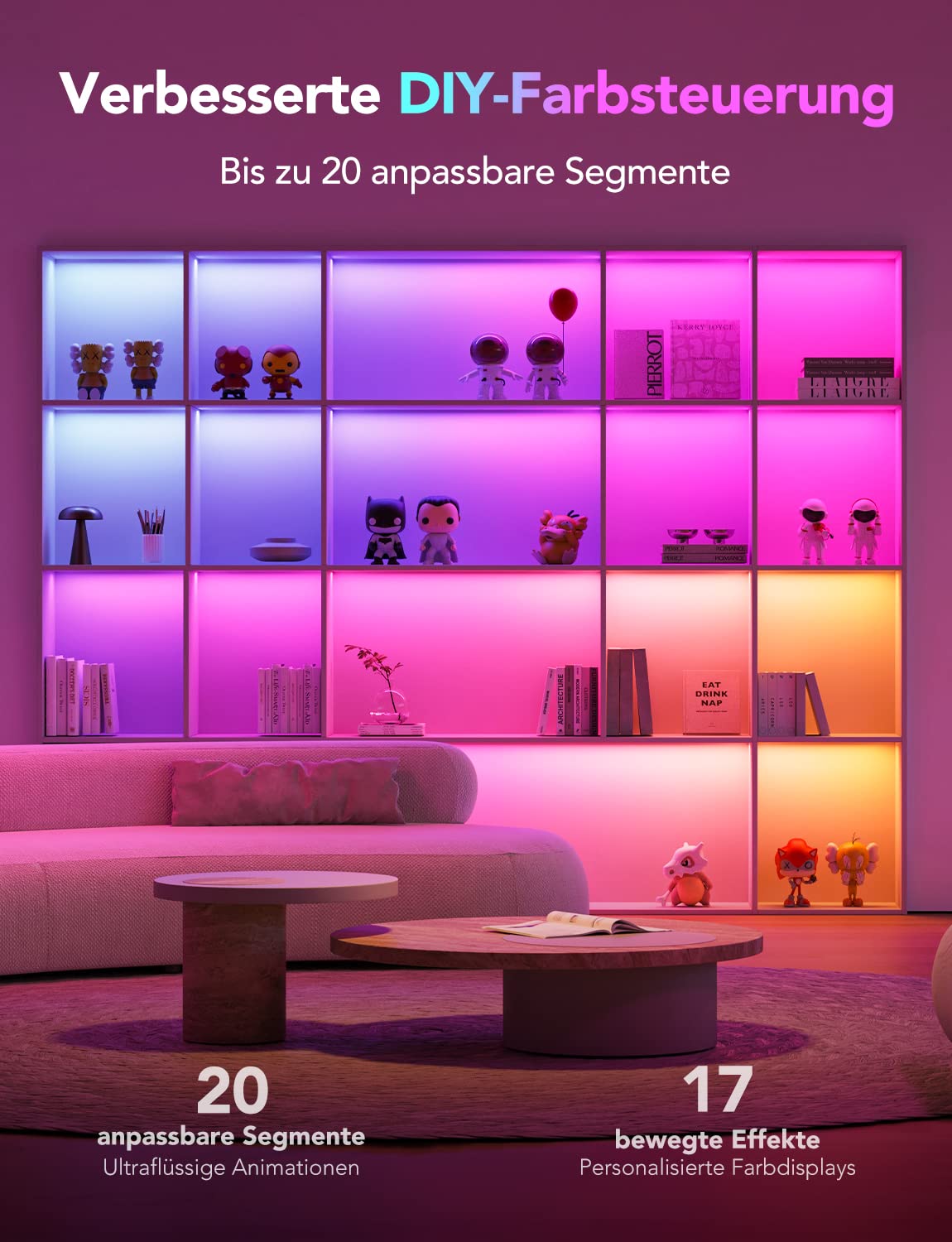 ["First Govee Light that supports Matter: The LED strip works with all certified smart home platforms, including HomeKit, Alexa, Google Assistant, etc. Control the smart LED Strip Light with voice commands for a better and smarter ecological experience.","4-in-1 RGBIC Technology: Govee RGBIC LED Strip adopts independent IC control to display multiple colors simultaneously on one LED light strip. The upgraded 4-in-1 chipset shows more natural colors, higher lumen brightness, and richer color performance. Ideal for decorating your furniture such as cabinets, TVs, and gaming desks.","Brighter than ever: With 60 LEDs/m, Govee M1 has a higher density than most RGBIC LED Strip Lights. The Govee M1 LED Strip Lights deliver more than seven times the lumen brightness of other LED strips, creating a stronger atmosphere under your couch or bed.","More DIY modes: Govee Home App allows control of LED strips with 20 customizable segments for personalized color displays and ultra-smooth light effects, as well as 17 animation effects to unleash your creativity.","Music modes: With a built-in microphone in the control box, this Lightstrip can synchronize sounds with other Govee Lightstrips. Watch in awe as the rest of your Govee LED Strips flow to the beats and rhythms of your playlists simultaneously.","Voice control: Supports voice control through Alexa and Google Assistant via Wi-Fi for hands-free control of your RGBIC LED Strip Light M1, allowing you to fully focus on your entertainment. Choose from over 200 scene modes for a slightly enhanced atmosphere."]