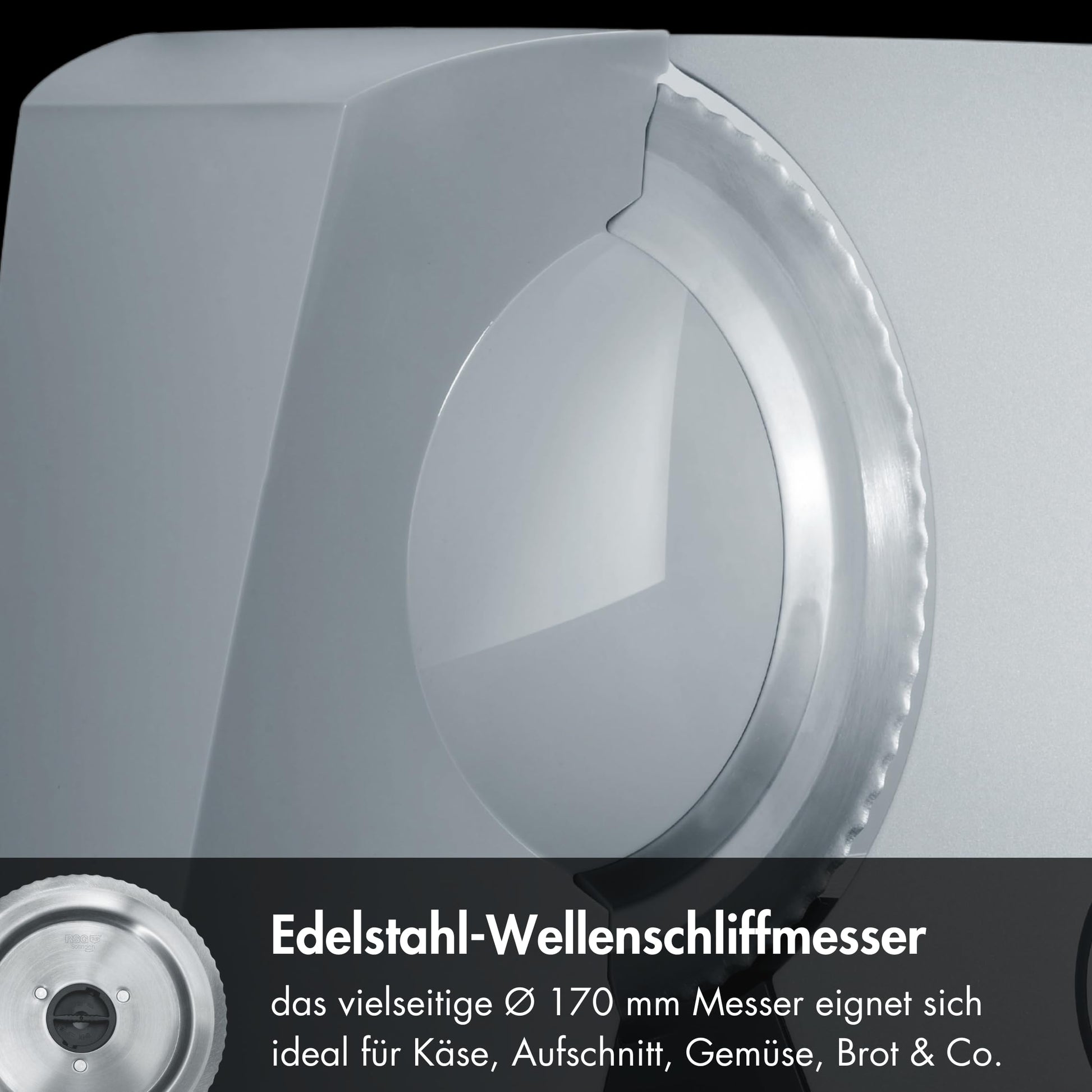 ["Compact metal machine, Made in Germany", "Corrugated stainless steel blade Ø 170 mm with knife cover plate", "Safety lock: For secure knife removal and easy cleaning", "Stepless thickness adjustment from 0-20 mm", "Stable and smooth slide with child safety lock", "Eco-Power-Motion motor, 40 - 170 watts"]