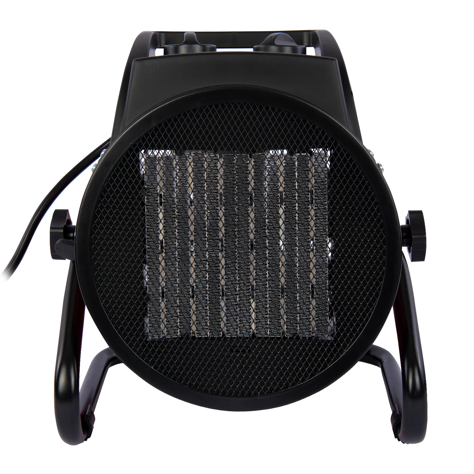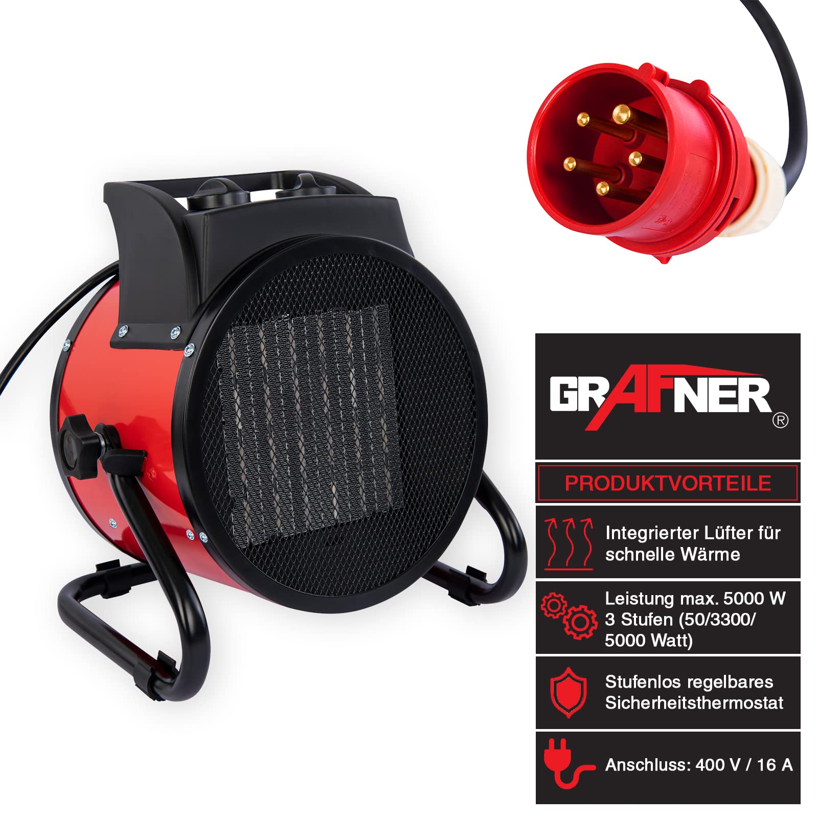 ["POWERFUL & CONTROLLABLE: Our powerful 400V electric heater with a power of 5 kW and ceramic heating element (PTC) is ideal for quick and efficient heating of large areas such as workshops, halls, barns, containers, construction sites, and more. The heating power can be conveniently selected via the controller on the housing (FAN / 3300 / 5000 watts). The sturdy fan provides uniform heat distribution and allows for a cool breeze in the summer.","WITH THERMOSTAT: The integrated thermostat allows the activation temperature to be easily selected and the room temperature to be accurately determined: As soon as the ambient temperature falls below the preset value, the heater switches on automatically - once the ambient temperature has risen by approximately 5°C above the set value, the heating device switches off again.","VERSATILE & HEALTHY: The PTC heating element (ceramic) not only ensures efficient heating: Since no oxygen is required for heat generation, no condensates are produced - this is very allergy-friendly and helpful for drying damp walls, e.g. in the basement. Since electricity is used for heat generation, there are no exhaust gases or combustion residues - thus, the heater can be used in environments where the use of oil or gas heaters is not possible.","ROBUST & SAFE: The sturdy metal housing with the massive handle allows for easy transport and worry-free storage. Even under adverse conditions, reliable heat supply is guaranteed at all times. The integrated overheat protection prevents heat buildup and ensures safe operation.","DETAILS: Electric turbo heater with PTC heating element (ceramic) | Voltage: 400V - 50Hz - 16A fused | Power: 5 kW (5000 watts) | 3 levels (fan / 3300 / 5000 watts | Power connection: CEE 16 A, 5-pole | Noise level: 55dB | Dimensions: 25 x 28 x 25 cm | with integrated fan for uniform and fast heat distribution | automatic thermostat | exhaust and condensate-free heat generation | adjustable fan head"]