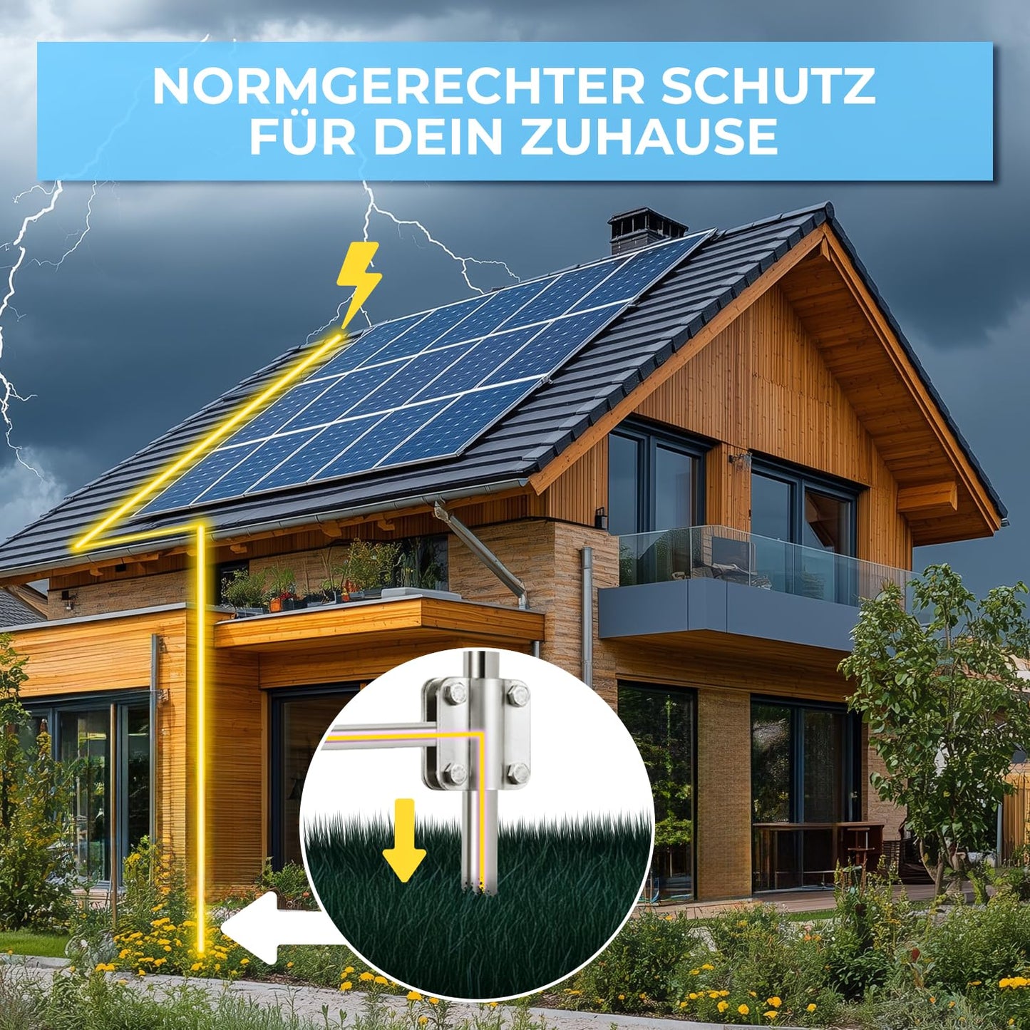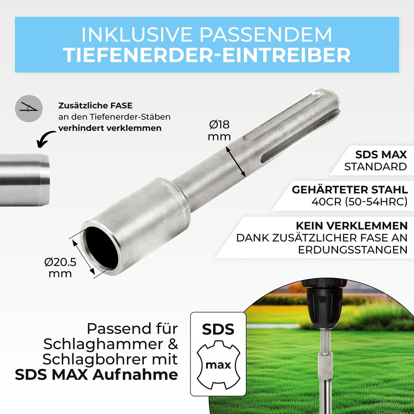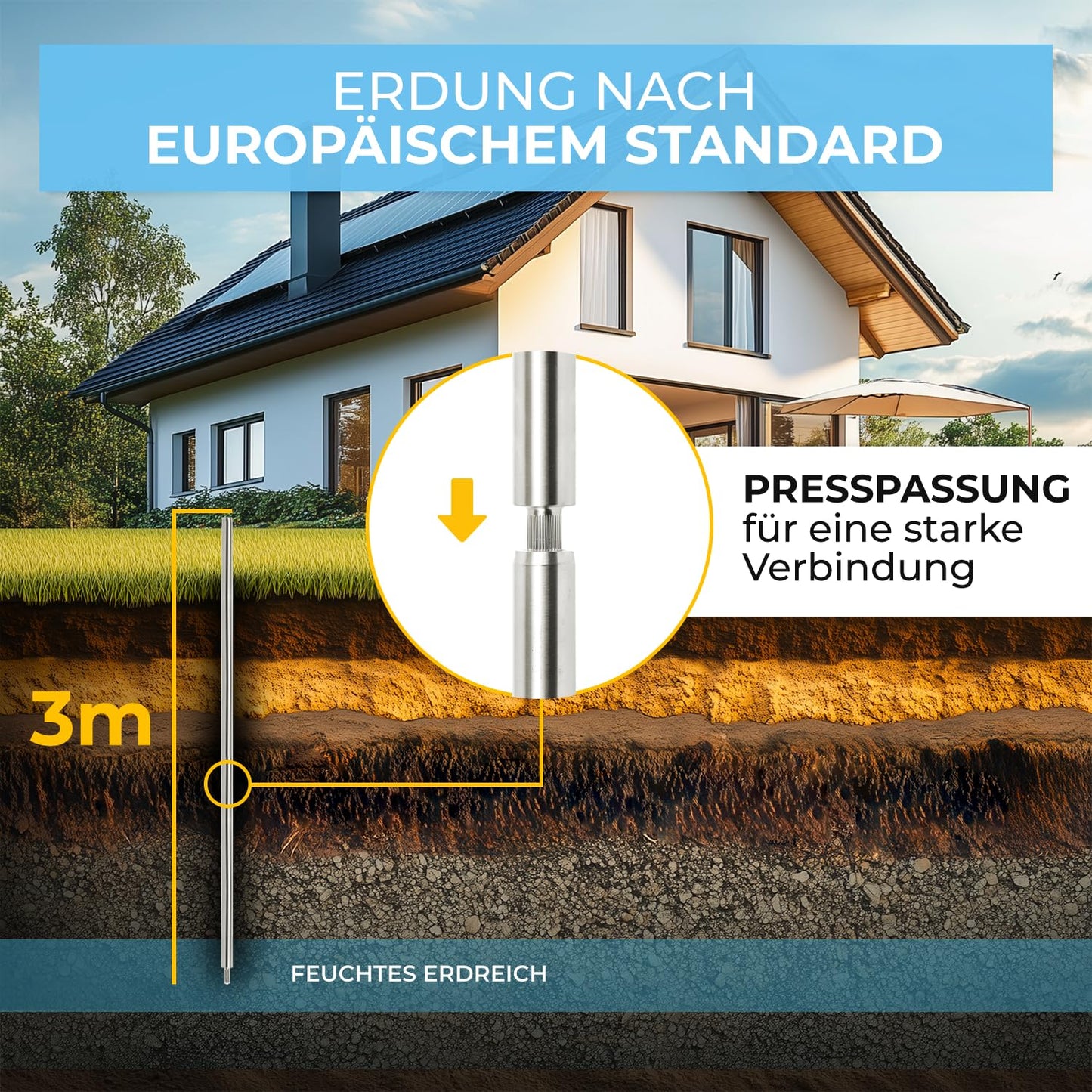 ["HIGH QUALITY STAINLESS STEEL - Made of durable V4A stainless steel (1.4401/AISI 316), rustproof and corrosion resistant - According to standard DIN EN 62561-2. For permanent and compliant grounding","EFFECTIVE PROTECTION - The perfect ground anchor set for reliable grounding and protection of your buildings, PV system, and electrical installations. Also suitable for retrofitting as equipotential bonding in old buildings","COMPLETE SET - 3x 3.28ft grounding spikes. Including SDS-Max driver and connection clamp for easy and fast installation. Suitable for grounding tape up to 1.65 inches and grounding wire from 0.24 inches diameter","FOR PROFESSIONALS AND DIY ENTHUSIASTS - Perfect for electricians, craftsmen, and DIY enthusiasts with high standards. Suitable as a ground rod for balcony solar panels and electric fences or as a ground nail for lightning rods","EASY TO USE - Precisely crafted connections ensure maximum stability of the grounding set. The included SDS-Max driver ensures quick and easy installation"]