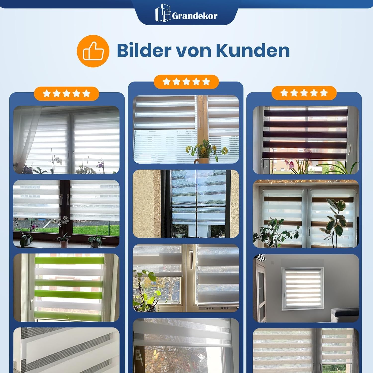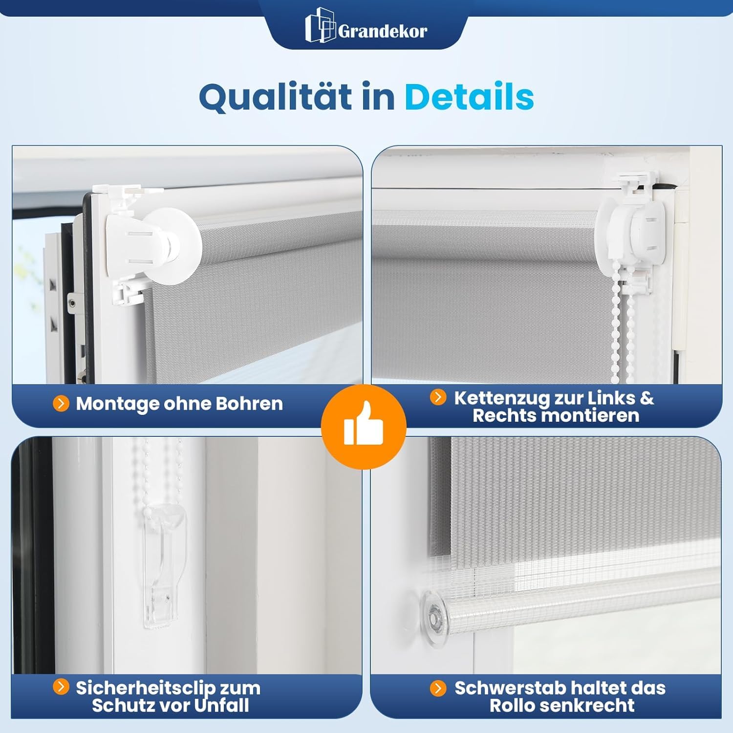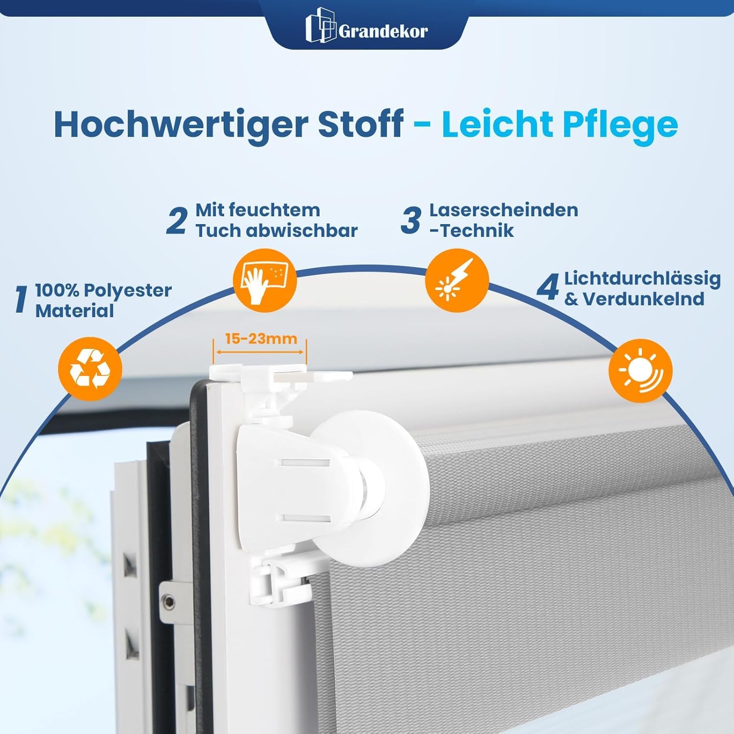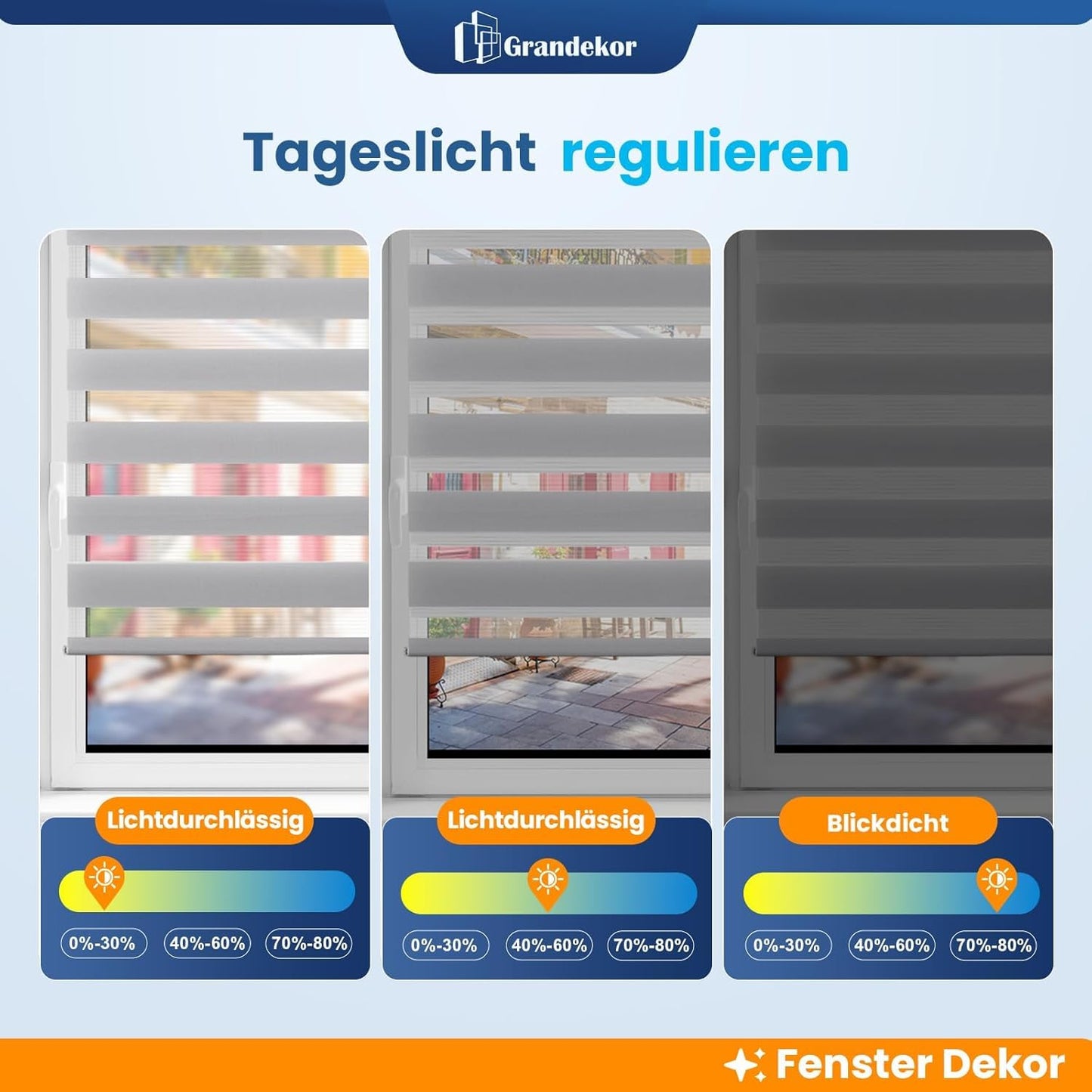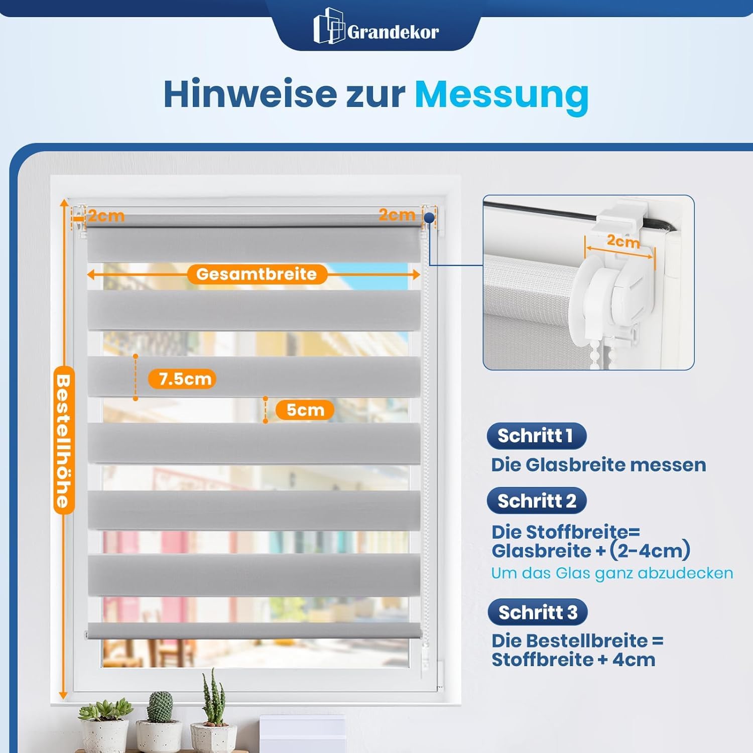 ["Easy to install & easy to maintain dual roller blinds】Easy installation without drilling. You can either use the included clamp fix system on the window frame, or attach it directly to the window recess or wall/ceiling with the included drilling materials. For maintenance, we recommend vacuuming with a furniture brush or crevice nozzle, or wiping with a damp cloth.","【Curious looks stay outside!】The light-permeable clamp fix dual roller blind without drilling consists of two fabric panels that run parallel and have alternating opaque and transparent stripes. You can adjust the position of the stripes individually and continuously. This gives you the option to either look outside or adjust the window roller blinds for indoors so that the window area is completely covered.","【Easy to operate roller blind without drilling】Thanks to the pull chain, the roller blind is continuously adjustable, from semi-permeable to opaque. The pull chain for operating the clamp fix dual roller blinds can be mounted on both sides so that it is always on the desired side. Make your use of the window roller blinds indoors without drilling even more comfortable.","【What size should I order?】The fabric width of the window roller blind is approximately 4-5 cm narrower than the total width ("ordering width"). For example, if your window size is 80 cm wide, we recommend ordering the dual roller blind with a width of 85 cm. The roller blind is suitable for window frames with a rebate thickness of 1.5 to 2.3 cm (not suitable for skylights!).","【Size compatible】The window roller blinds are backwards compatible. The 150cm roller blind is suitable for all windows with a height of 150cm and below. If the dual roller blind in the matching height is not available, you can purchase a larger roller blind. The excess length can be easily rolled up.","【Versatile uses throughout the house!】The clamp fix duo roller blind is suitable for all types of rooms: office, bedroom, living room, bathroom, and children's room, as well as for balcony and patio doors. Even in damp rooms, the dual roller blind without drilling is not a problem. Due to the easy installation without drilling, you give your windows a modern and appealing look, combined with simple and reliable technology."]