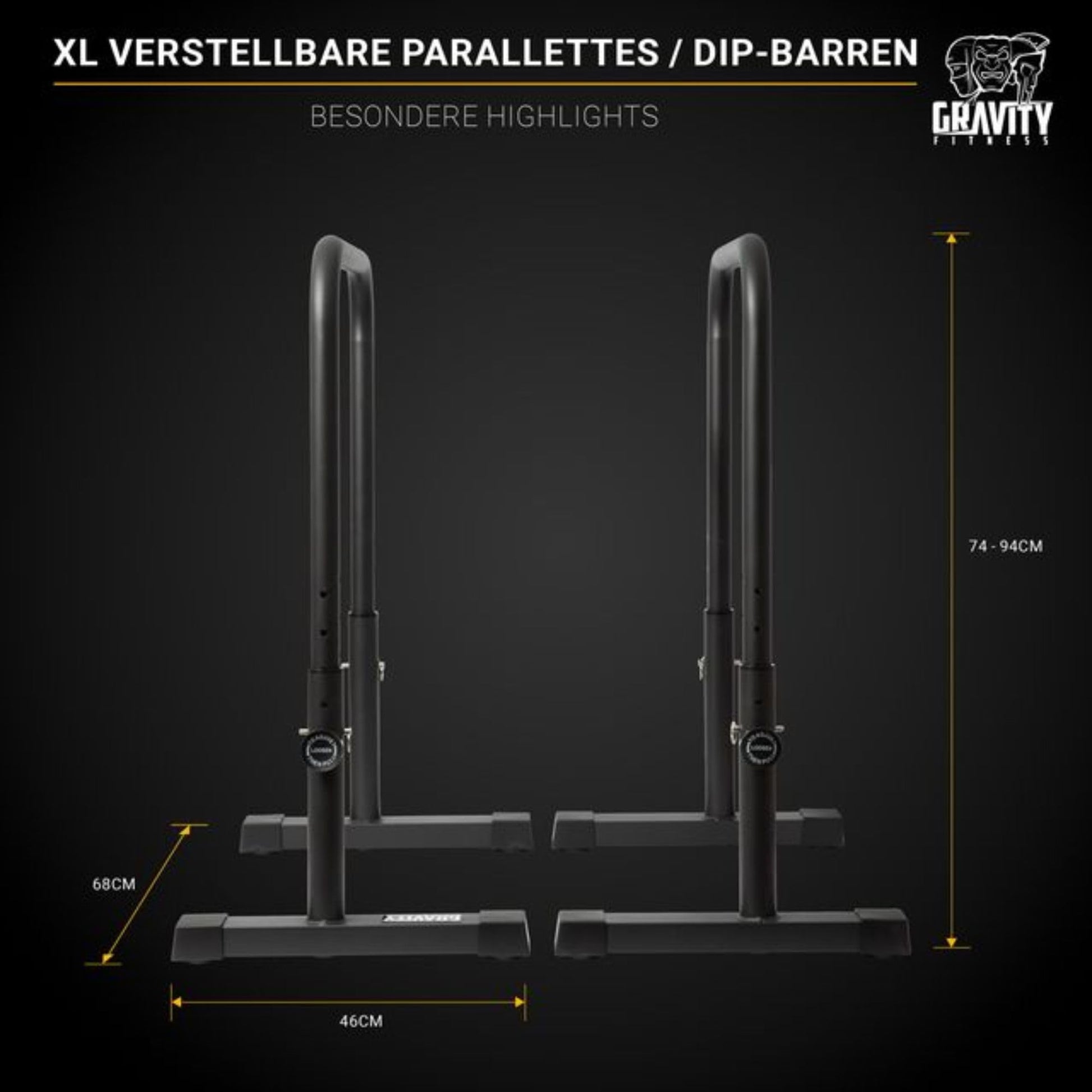 ["Product features and benefits: Designed for Calisthenics, bodyweight training & gymnastics - build strength, stability & control with the adjustable Gravity Fitness Dip Bars XL.","Adjustable & Ergonomic: 8-level height adjustment (29-37 inches), 38 mm handles for a secure grip - perfect for all body sizes, exercises & home gym setups.","Sturdy & Durable: Robust 60x40mm steel feet provide a secure base - ideal for dynamic movements and intense strength training or gymnastics exercises.","Mobile & Versatile: Weighs only 12 kg - easy to transport, perfect for training in the park, at home or in the studio - your portable fitness station anywhere.","Includes Training App: Free access to the Gravity Fitness App with over 1,000 videos, structured programs, and an active Calisthenics community."]