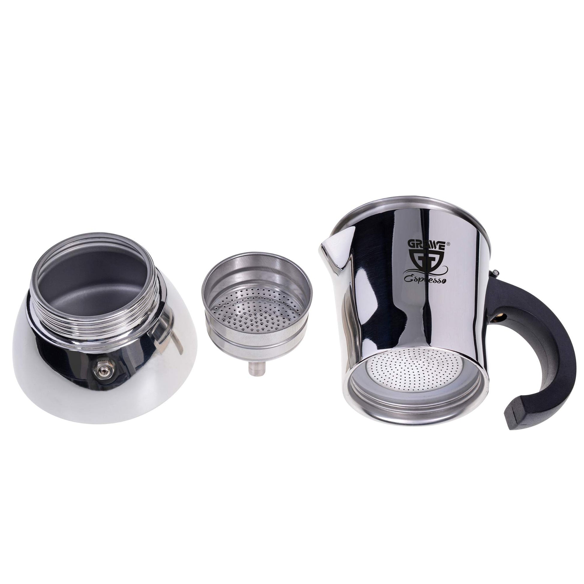 ["GRÄWE Stainless Steel Espresso Maker (0% Aluminum), Capacity approx. 6.76 fl oz or 4 espresso cups, Total height: approx. 6.5 inches, Diameter of base plate: approx. 3.94 inches, Weight: approx. 1.23 lbs, Induction suitable espresso pot", "The stainless steel espresso pot is dishwasher safe and easy to clean. The espresso maker consists of an upper and lower part that can be easily unscrewed for cleaning. Suitable for all stovetops", "Prepare typical Italian coffee in the espresso maker: Pour hot water into the boiler and fill the upper part with coffee. After just a few minutes on the stove, you will enjoy delicious coffee", "Thanks to the classic brewing process from the boiler through the pipe, the GRÄWE espresso maker extracts the maximum aroma from the ground coffee beans. With the espresso pot, every cup becomes a taste experience", "Experience the GRÄWE moment of enjoyment. Whether as a hobby cook or professional chef, you will find a wide selection of elegant kitchen utensils with us. Our traditional brand stands for high product quality and attention to detail"]