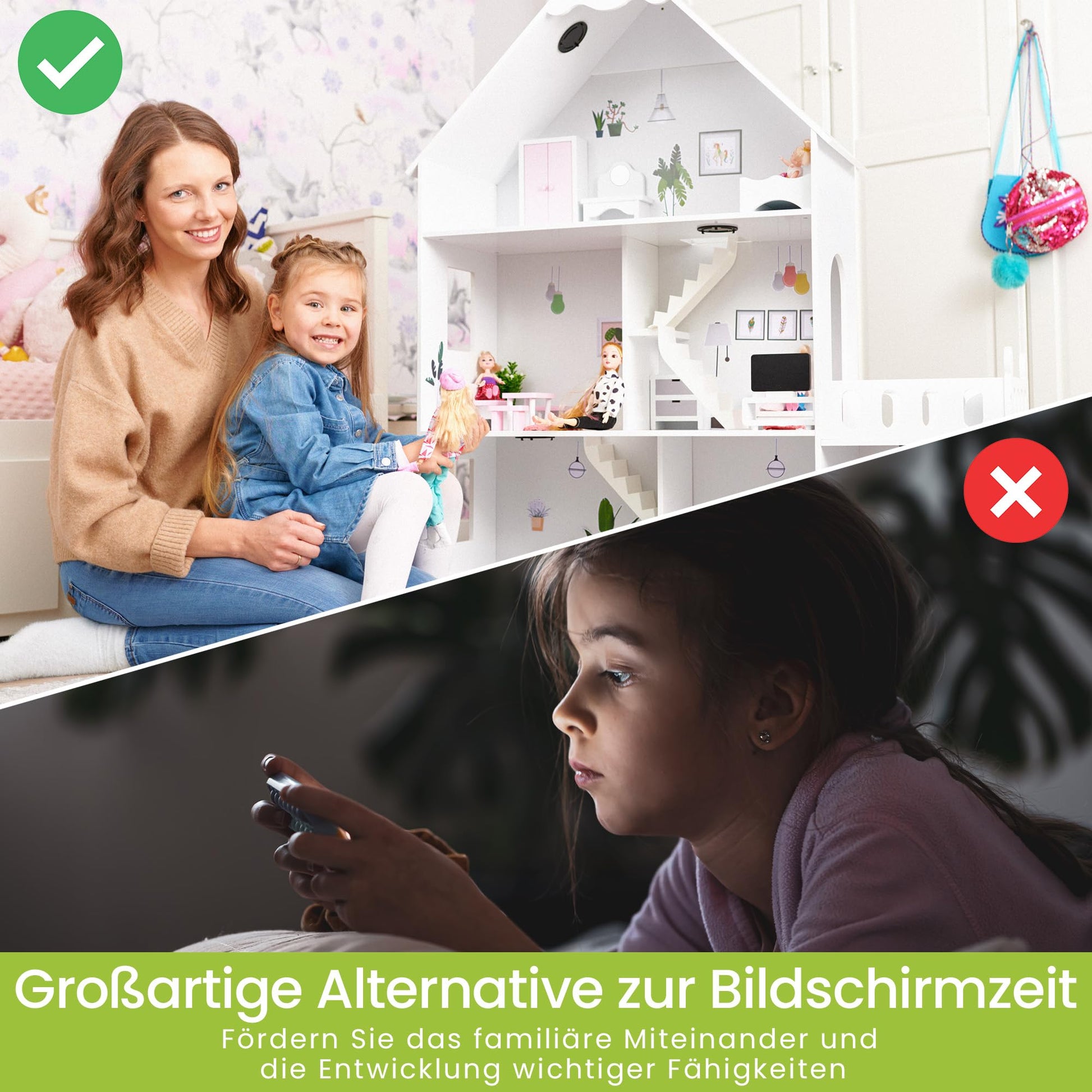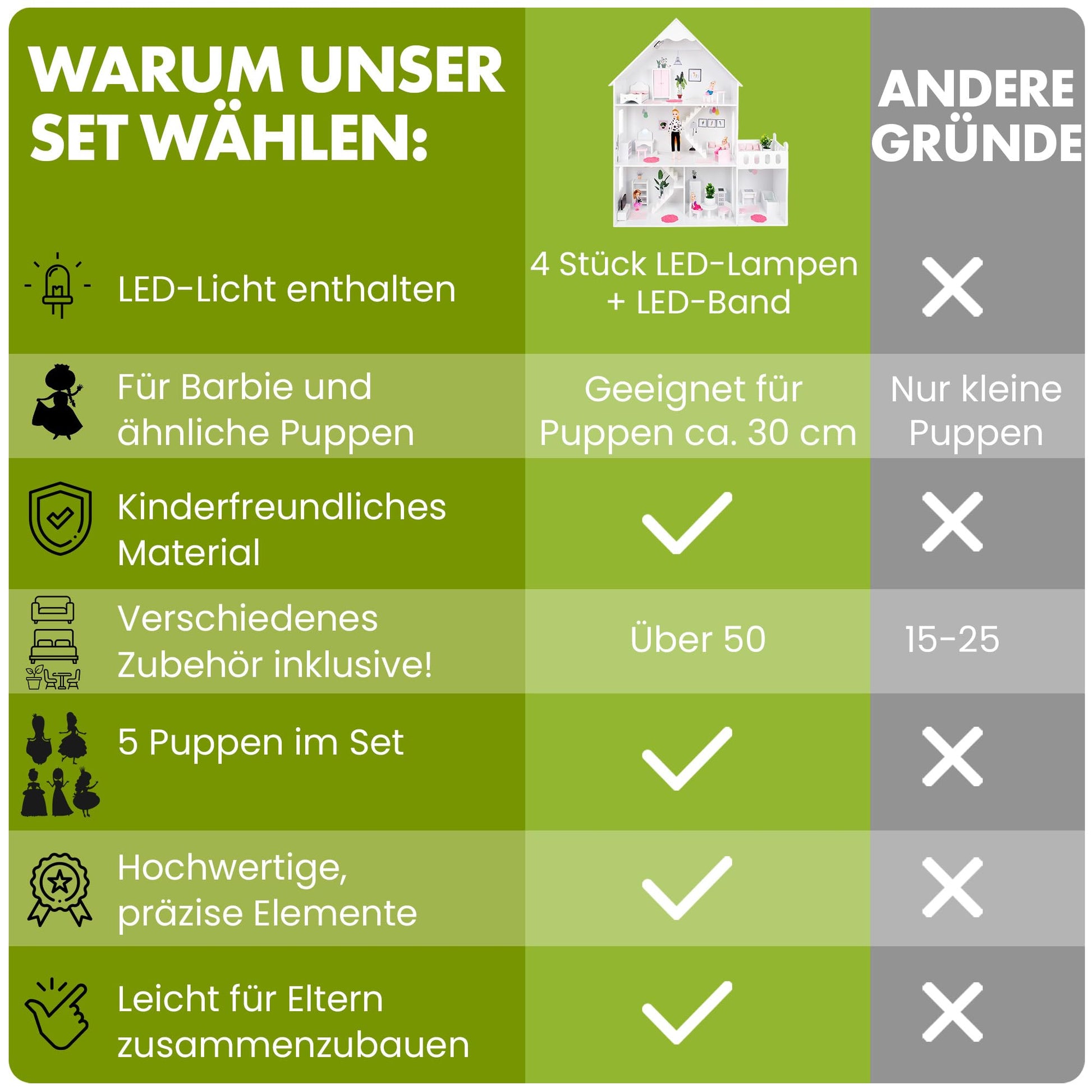 Green Series Wooden Dollhouse XXL - 3 floors with LED light & 57 accessories - For 30 cm fashion dolls (Barbie size) - 118 cm tall, 7 rooms