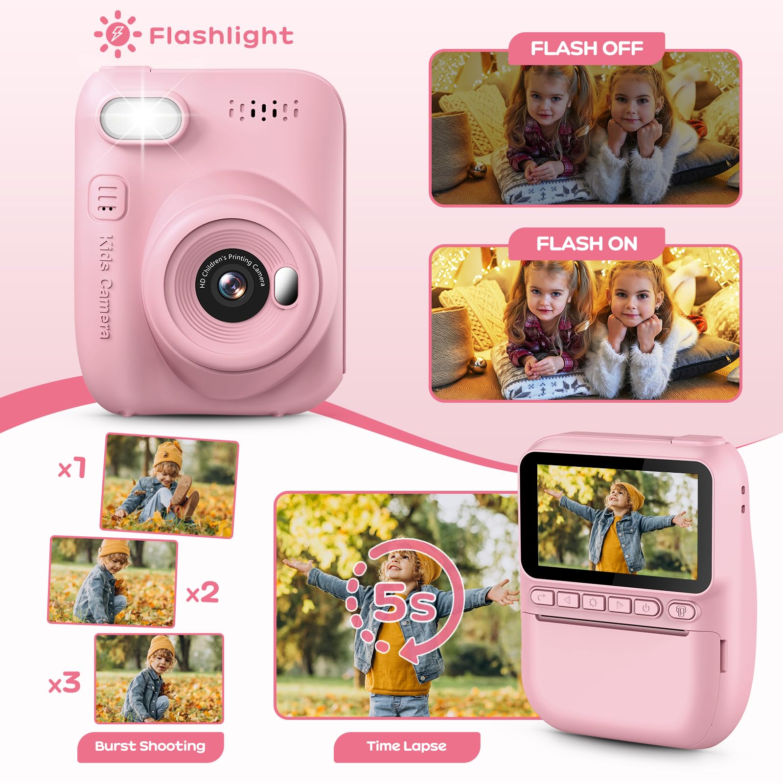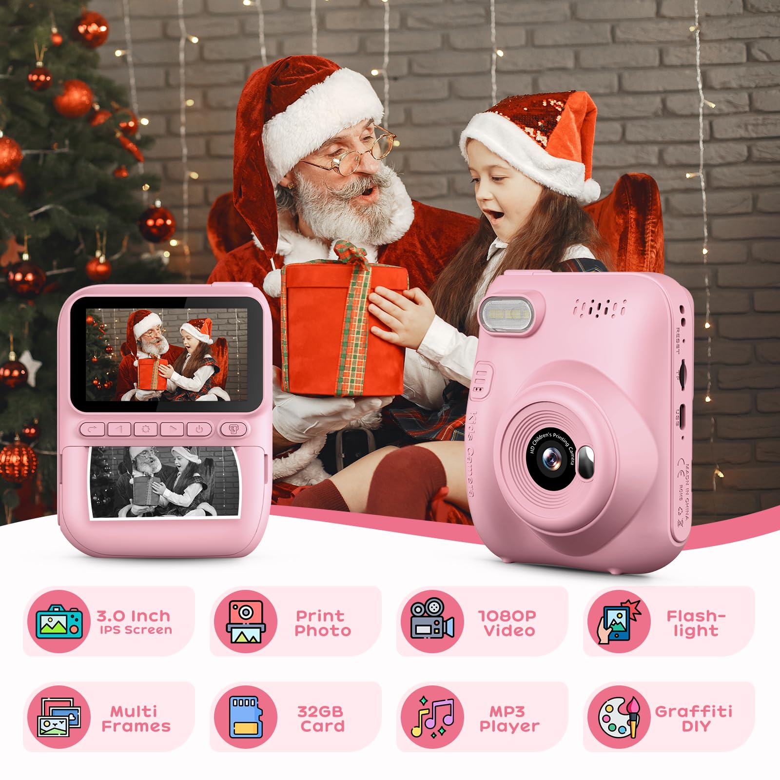 GREENKINDER Instant Camera for Kids, 14MP 3.0 Inch Screen Kids Camera Instant Camera with 32G Card, Printing Paper & Colored Pens, 1080P Kids Camera Instant Print, 3-12 Years