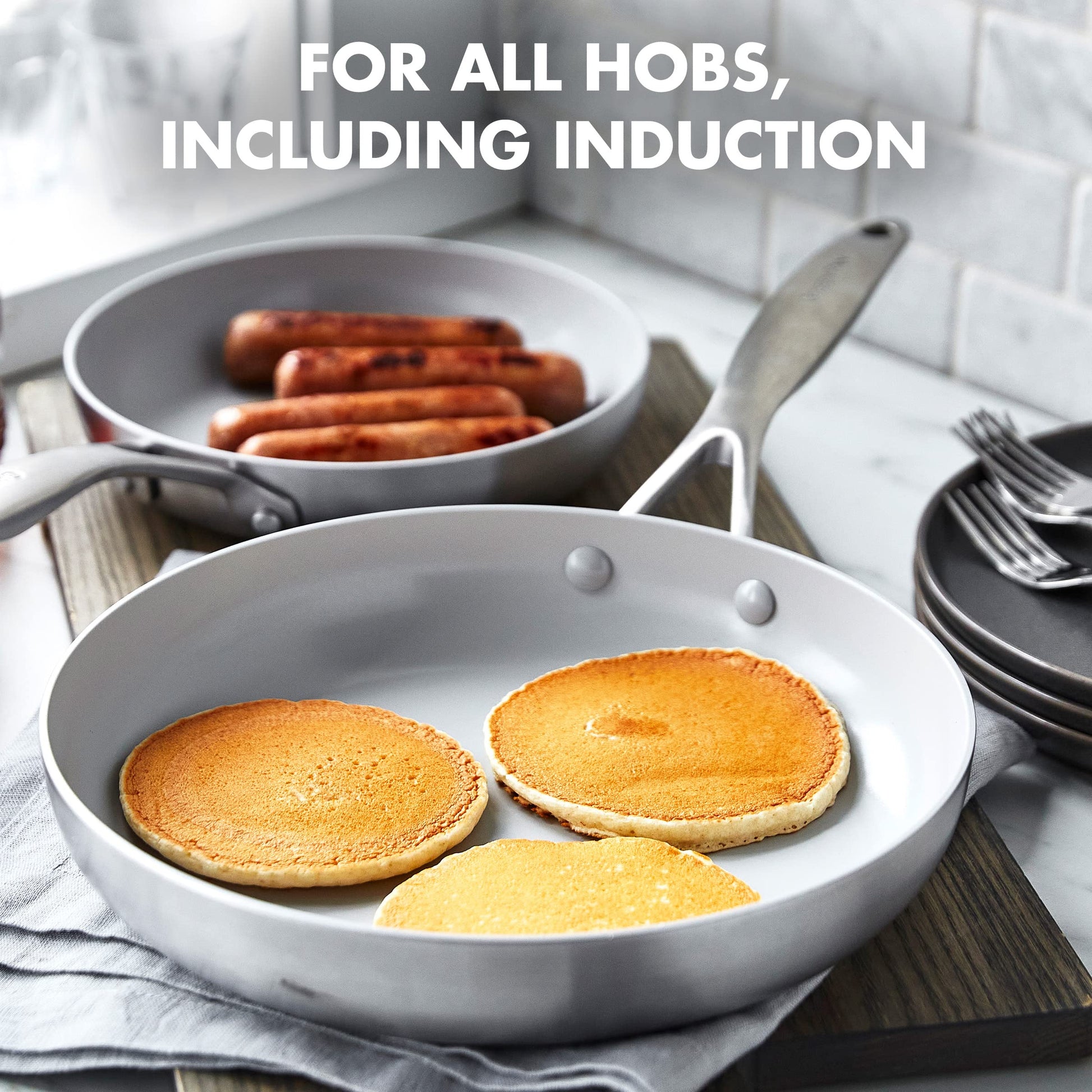 ["COOKWARE SET INCLUDES: 10" frying pan and 12" frying pan","CUTTING-EDGE CERAMIC NONSTICK: GreenPan's diamond-infused, metal utensil-safe ceramic nonstick coating offers remarkable durability, even heating, and effortless cleaning","TOXIN-FREE: Our signature ceramic nonstick coating is free of PFAS, PFOA, lead, or cadmium","3-LAYER STAINLESS STEEL CONSTRUCTION: Two layers of stainless steel with a full aluminum core for quick and even heat distribution","EVERSHINE TECHNOLOGY: ensures the three-ply stainless steel construction shines for years and resists discoloration","ERGONOMIC HANDLE: Designed to stay cool on the stovetop, and riveted for added strength and stability","OVEN SAFE: Oven and broiler safe up to 600°F","INDUCTION COMPATIBLE: Suitable for all cooktops, including induction","EASY CLEANUP: Pans wipe clean easily and are dishwasher safe for stubborn messes"]
