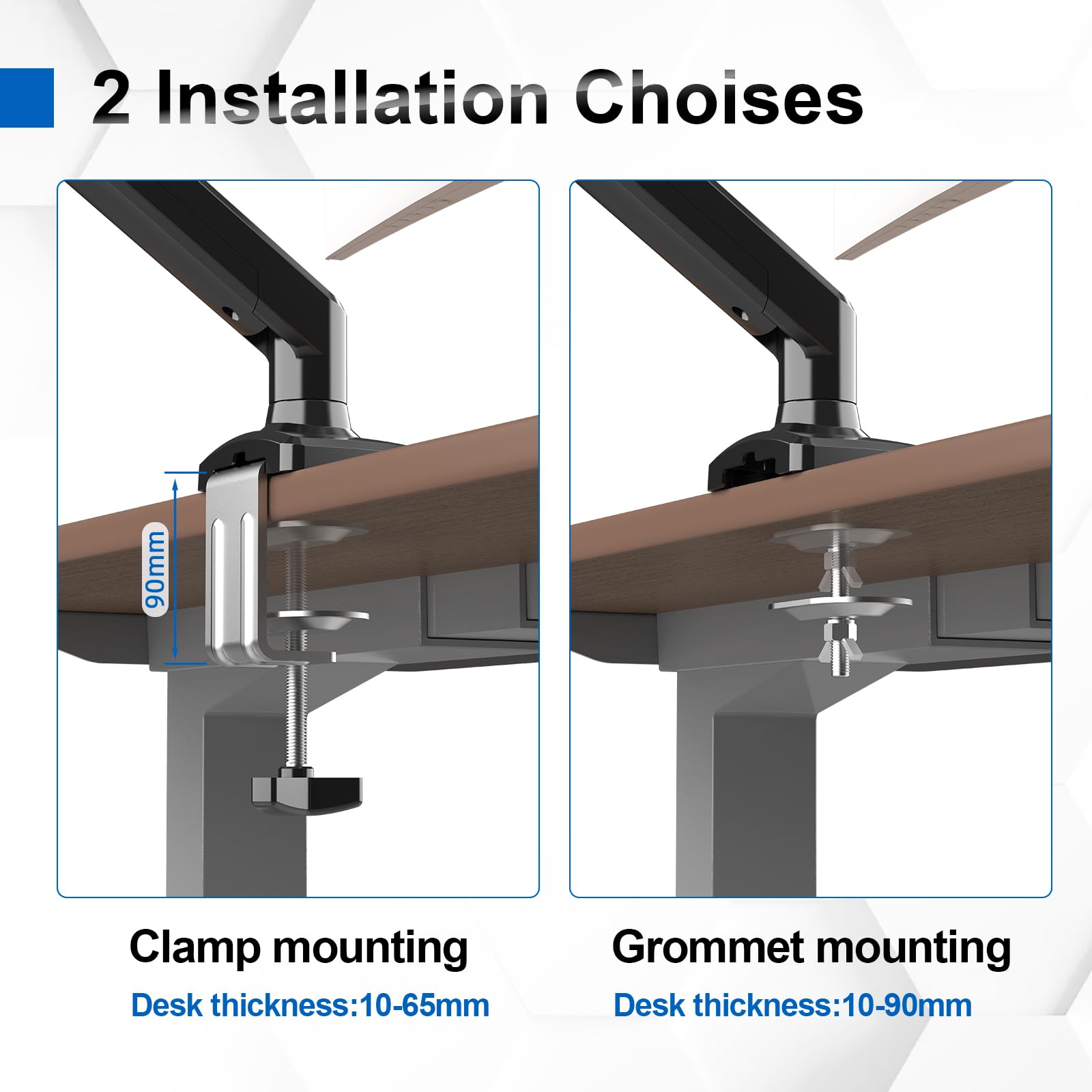 "Two Installation Methods: 2 installation methods, C-clamp and desktop hole installation, desktop support strength up to 80 mm, suitable for various desktops, securely attach the screen where you need it."