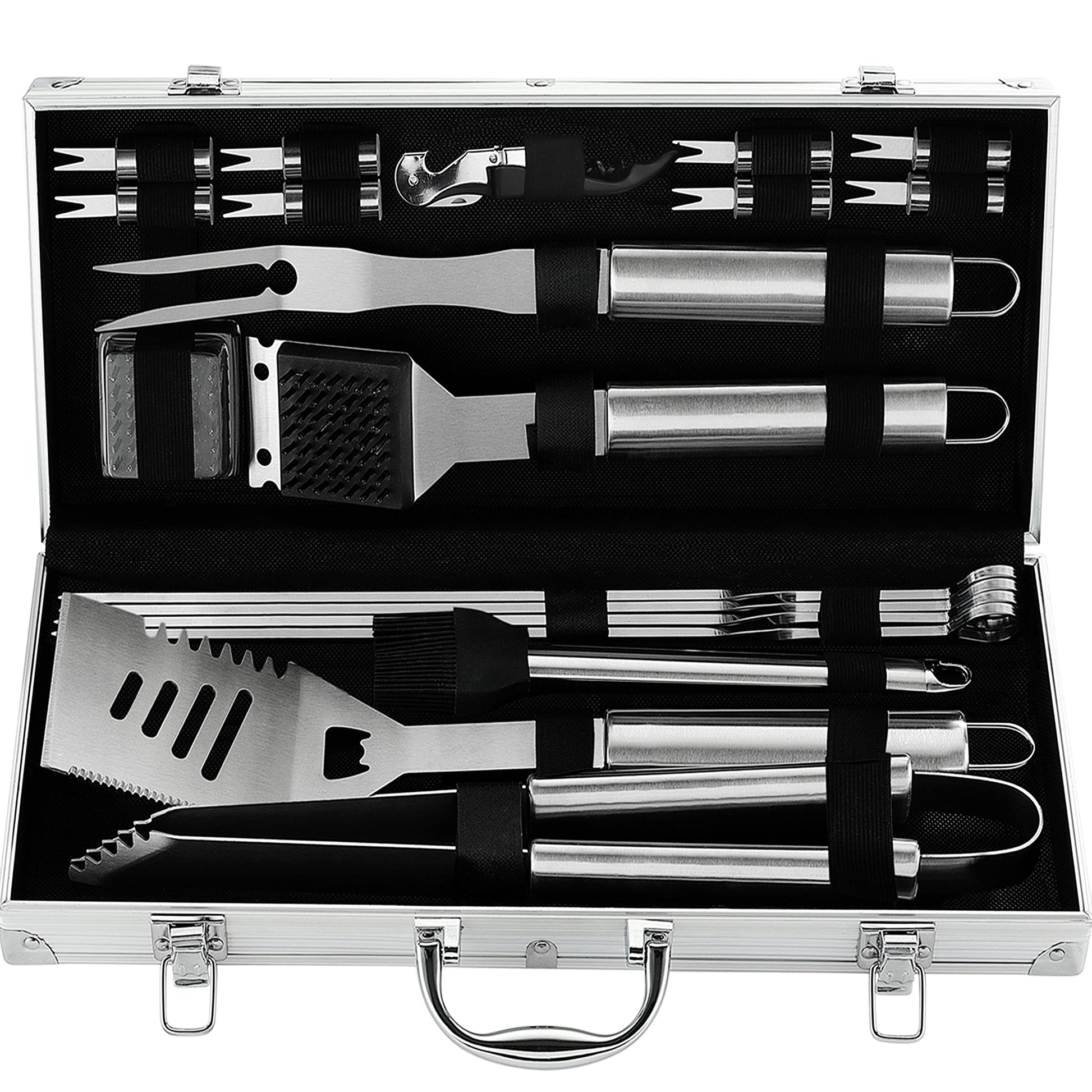 "The most complete grill set - 20PCS grill accessory set consisting of 1 grill spatula, 1 fork, 1 basting brush, 1 grill brush, 1 interchangeable grill head brush, 1 tongs, 8 corn holders, 4 grill utensil skewers, 1 aluminum case. This is a complete and professional grill set that includes almost everything for grilling.