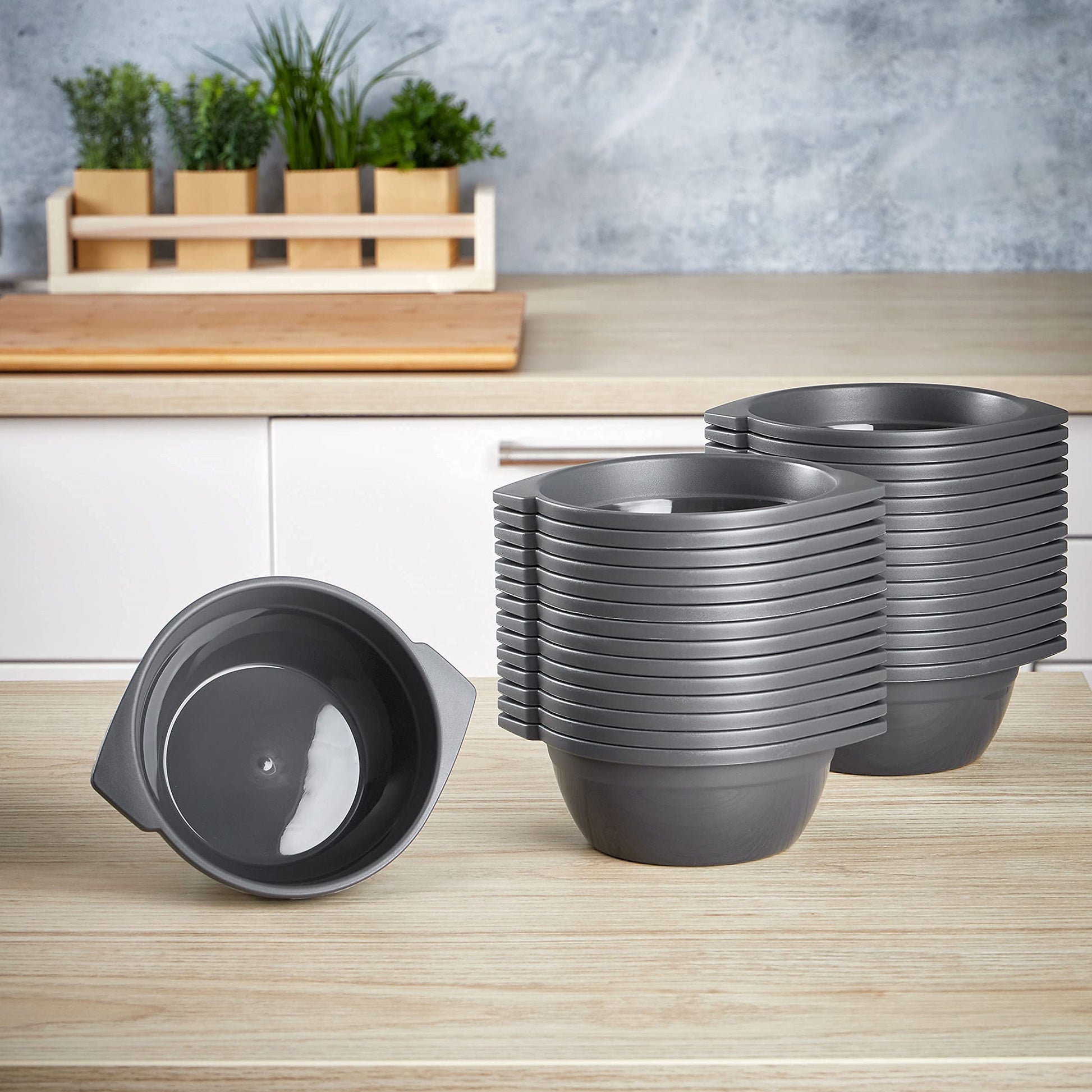 "Contents – Includes 30x anthracite-colored bowls made of high-quality plastic. These bowls are reusable, dishwasher-safe, stackable, and 100% recyclable."
