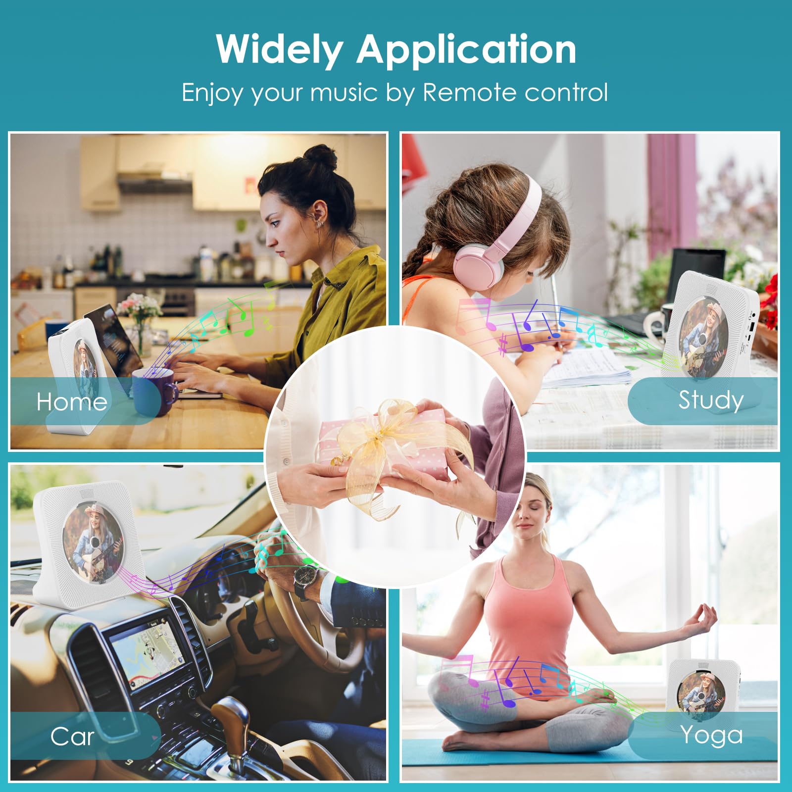 ["Multifunctional CD Player: The portable Bluetooth CD player features 6 playback modes, such as CD playback mode, Bluetooth mode, USB mode, AUX mode, LINE mode, and FM radio mode. The CD player supports multiple CD formats - CD, CD-R, CD-RW, MP3, WMA. It can be set as a sleep timer to end playback. The home music CD player also supports USB and FM radio with a frequency of 76-108.0 MHz. You can enjoy music via radio, CD, U-disk, mobile phone.","4000mAh Rechargeable CD Player: Gueray desktop CD player with 4000mAh rechargeable battery, you don't need to use AA batteries or plug into power while using, bringing you a better music experience. It needs 5-6 hours to fully charge and can support 4-6 hours of playtime after fully charged. You can listen to your favorite CDs while taking it anywhere.","Bluetooth CD Player with HIFI Speaker: This Bluetooth CD player has two built-in HIFI stereo speakers that allow you to share your music with your family and friends. Additionally, a headphone jack provides more privacy. With the latest Bluetooth 5.0 technology, as a Bluetooth transmitter and receiver, you can connect it to your mobile phone, tablet, headphones, or other Bluetooth device.","Desktop CD Player with Remote Control: The home music CD player is equipped with a CD dust cover that prevents children or pets from inadvertently touching it. The disc CD player boombox could stand on the table, equipped with a remote control (AAA batteries not included). You can use it in the living room, bedroom.","Tipitopi"]