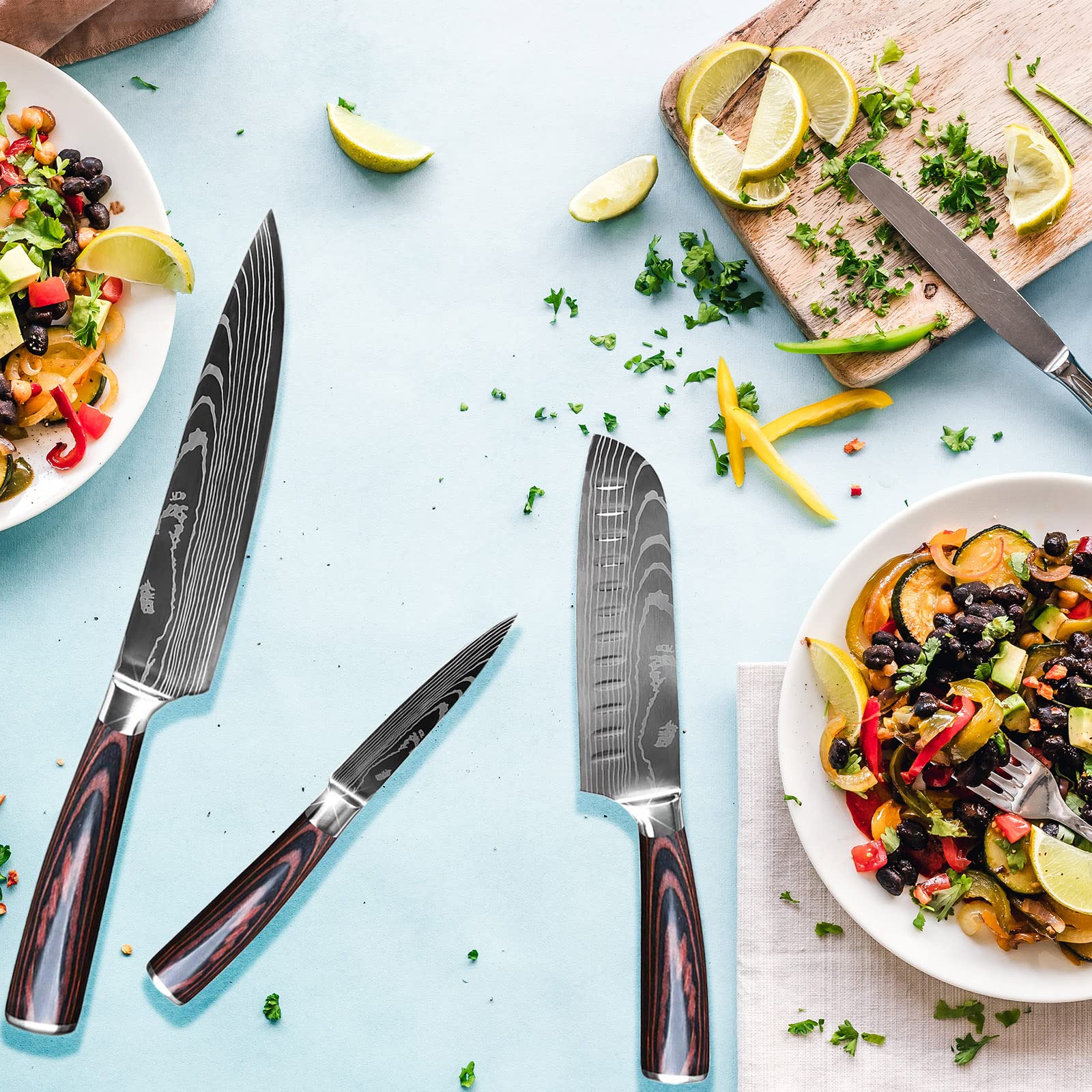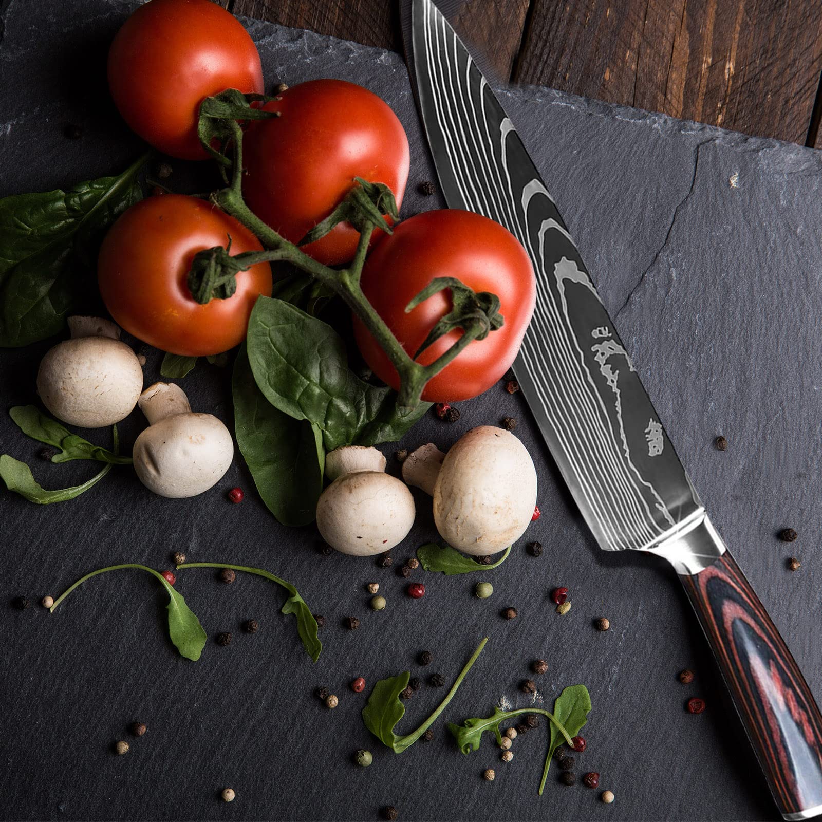 ["8-piece multipurpose kitchen knife set: The knife set includes 1 * chef's knife, 1 * bread knife, 1 * nakiri knife, 1 * utility knife, 2 * santoku knives, 1 * boning knife, 1 * vegetable knife. This professional knife set can easily handle all your kitchen tasks such as chopping, slicing, dicing for vegetables, fruits, and meats. Great for all your daily kitchen needs.","Super premium steel: The Gustrug kitchen knife is made of high-carbon stainless steel, which has high hardness, wear resistance, rust resistance, and excellent toughness performance. The oxidation coating is easy to clean and can be used for a long time. Very suitable for professionals and beginners.","Sharp edge: Each knife blade is carefully sharpened to achieve the perfect balance between ultra-thin cutting and maximum durability for smooth cutting. You can easily slice your meat, vegetables, and fruits as thin as you want. Make your kitchen work easy and efficient.","Ergonomically shaped handle: The handle is made of Pakkawood. The integrated blade is integrated into the soft and comfortable handle, providing a perfect grip to minimize wrist tension. Even after prolonged use, your palm and wrist will not fatigue. It offers you a secure and comfortable user experience. This is an ideal choice for cooking enthusiasts.","7/24H customer service: Each knife is backed by superior quality assurance and can be purchased with confidence. Great gift idea for family and friends. If you have any questions or concerns regarding the Gustrug knife set, please do not hesitate to contact us, we will respond within 24 hours."]