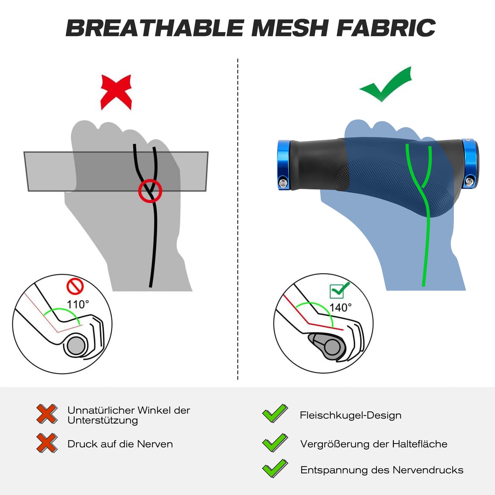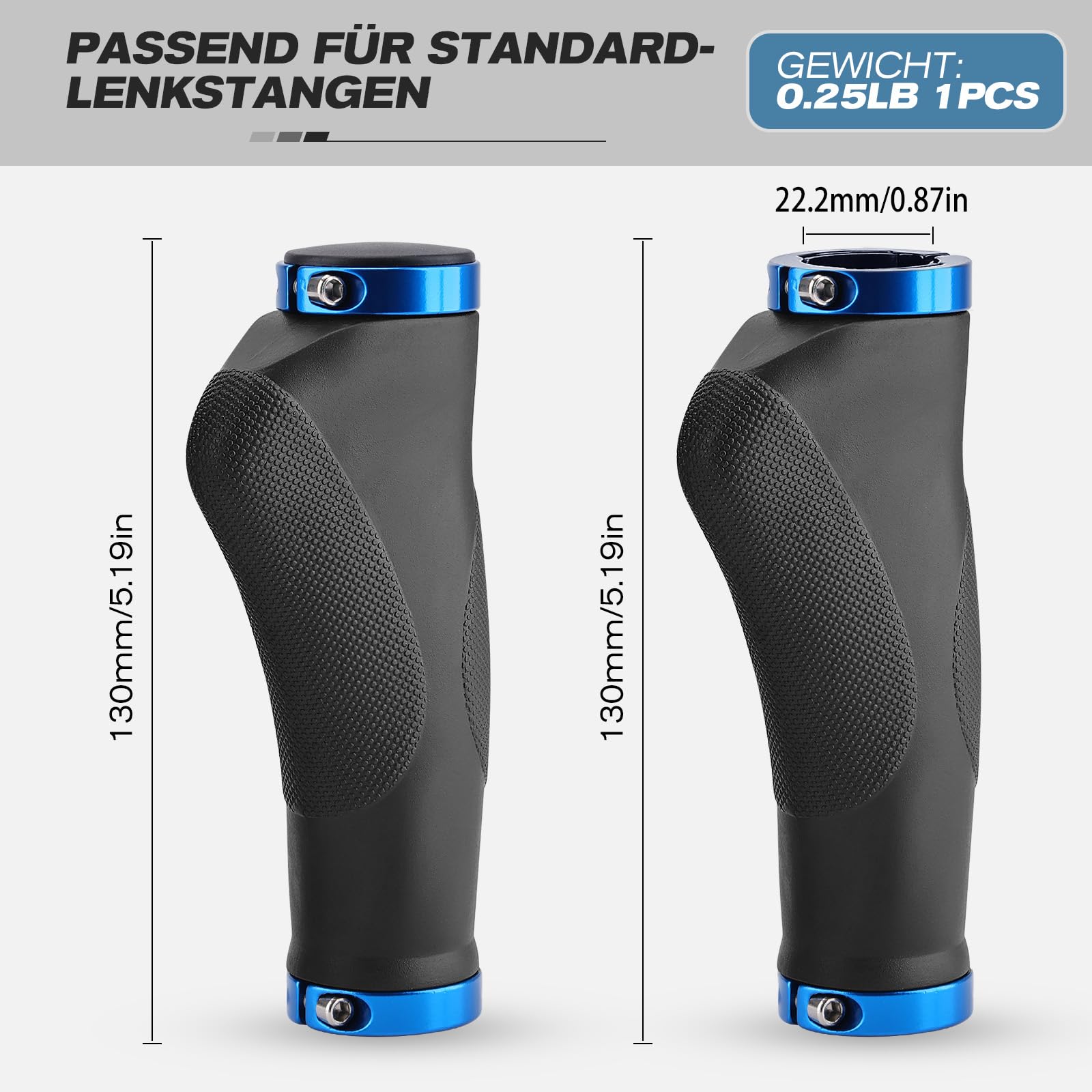 ["ANTI-SLIP DOT DESIGN: High-quality rubber surface with textured dots for maximum grip, ideal for bicycle handles even in wet conditions", "ERGONOMIC SHAPE: Anatomically shaped handles reduce hand fatigue during long rides, suitable for mountain bikes and city bikes", "SHOCK ABSORPTION: Integrated damping layer absorbs vibrations, protects wrists, and improves riding comfort", "SAFETY LOCKING: Side click-locking mechanism prevents sliding, perfect for MTB and sports use", "130MM LENGTH: Universal fit for all standard handlebars, lightweight rubber material without compromising control"]