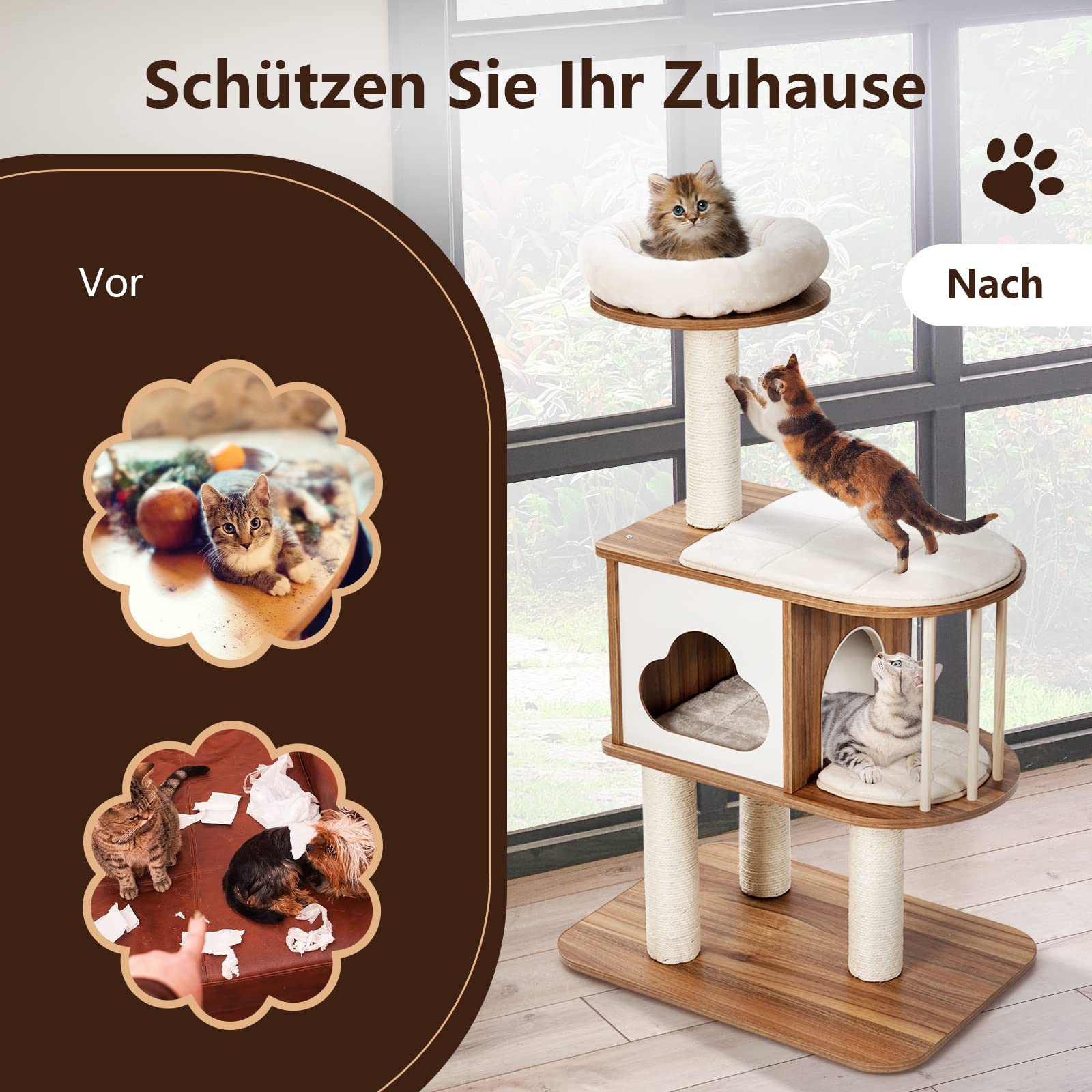 "﹟😸 Beautiful Appearance & Easy Assembly ﹟ This climbing tree is kept in brown or grey throughout, giving you an elegant and sophisticated look that can be easily integrated into spaces with different decorating styles. With detailed instructions, your installation process has never been easier."]
