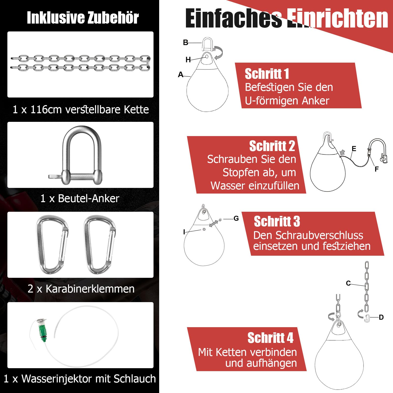 "﹟🥊 COMPLETE ACCESSORIES ﹟ The complete set includes a water punching bag, a chain, two lifting hooks, a U-shaped buckle, and a hose. The length of the chain is adjustable, allowing you to find a suitable height."]