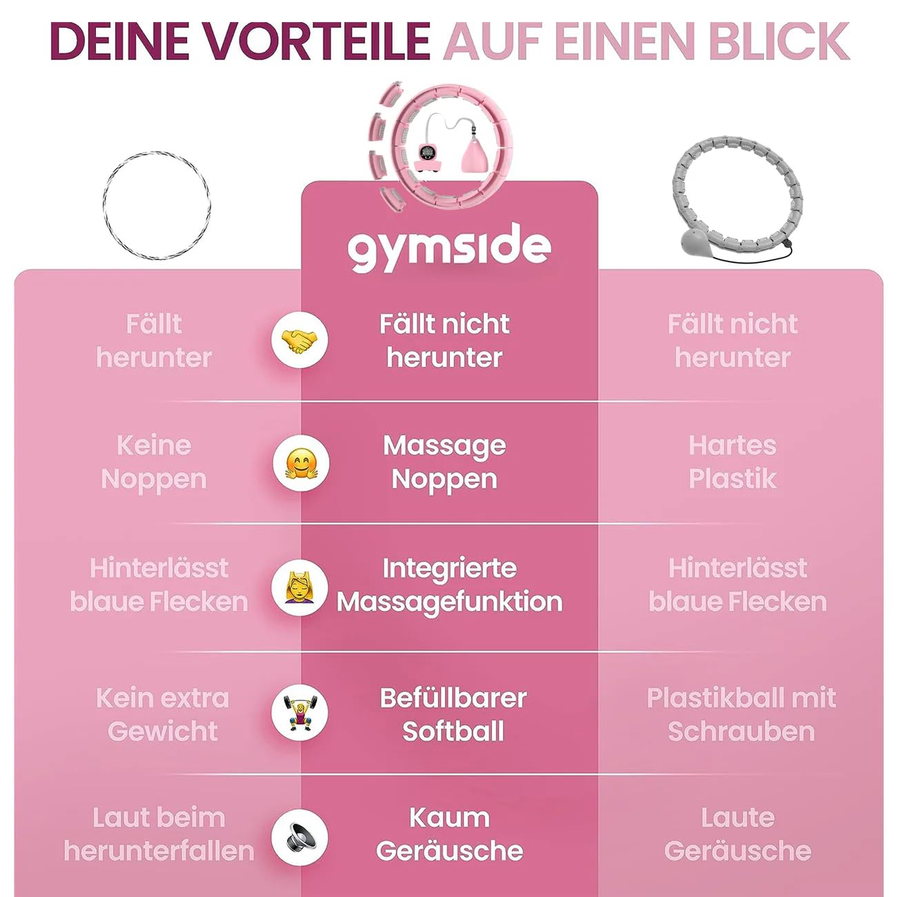 ["Home Workout - With the Gymside Hoopside Pro, you can easily burn fat and lose weight from home. In 30 minutes, you can burn up to 800 calories. Hooping shapes your waist, targets belly fat, cellulite, helps build muscles in the abdomen and glutes, and works directly on problem areas.","Continuous Hooping - Our Smart Hula Hoop fits snugly around your waist and won't fall off. This allows for uninterrupted hooping. The weighted ball takes your workout to the next level. The hoopside can be used anytime, anywhere.","Suitable for Everyone - With detachable links, it is suitable for both young and adult individuals. The size ranges from XS to XXL, with a waist circumference of 65-135cm. Hooping with Gymside Hoopside does not cause bruises like traditional Hula Hoops.","Quiet Hooping - The Gymside Hula Hoop is very quiet, so you can watch TV or listen to music while hooping. You can even hoop while the kids are asleep because it is very quiet. The built-in massage knobs provide optimal grip and relaxation. Have more fun hooping with Gymside.","Top Quality - The high-quality construction of the Hoopside Pro ensures long-lasting durability. The wheels are made of stainless steel, making them sturdy and stable. The ball is made of silicone and comes pre-filled for optimal vibration. The string is strong and won't damage your surroundings. Gymside ensures quality.","German Company - Gymside is a young startup company specializing in women's health and fitness. Our vision is to revolutionize the fitness experience by offering innovative Hula Hoop hoops designed to support and inspire women on their fitness journey."]