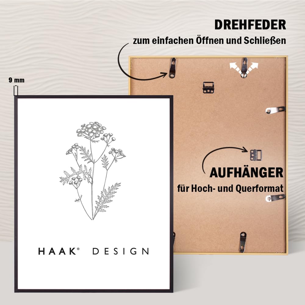 ["9 mm Aluminum picture frame made of aluminum, anodized or powder coated depending on color choice, for posters, pictures, and puzzles with acrylic glass, MADE IN GERMANY", "Includes MDF back panel with swivel springs and hangers in portrait and landscape format, and 1 millimeter thick acrylic glass pane for long-term durability with UV stability", "Slim aluminum frame is either anodized or powder coated to achieve a uniform color result, the narrow and angular profile allows the frame to perfectly blend in with any interior style", "Frame interior dimension is equal to picture size, available in 97 sizes and also customizable for posters, pictures, puzzles, cloths, and other objects with 5 millimeter thickness", "Versatile interchangeable frame suitable for puzzles, posters, movie posters, certificates, photo prints, and more, perfectly protected by acrylic glass, ideal as a gift idea, suitable for any interior style and aesthetic, can be used horizontally or vertically, WITHOUT MATBOARD OR INSERT SHEET!"]