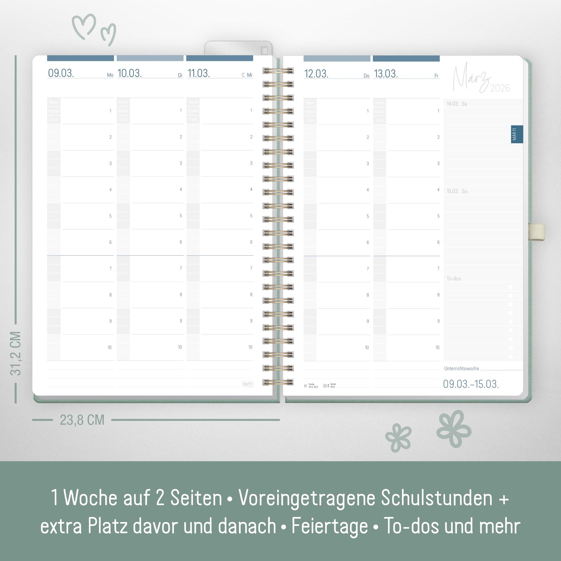 Häfft® Teacher Planner 2025/2026 A4 + Deluxe "Green Canvas" Hardcover Teacher Planner, large school year planner with spiral binding, school planner - sustainable & environmentally friendly.