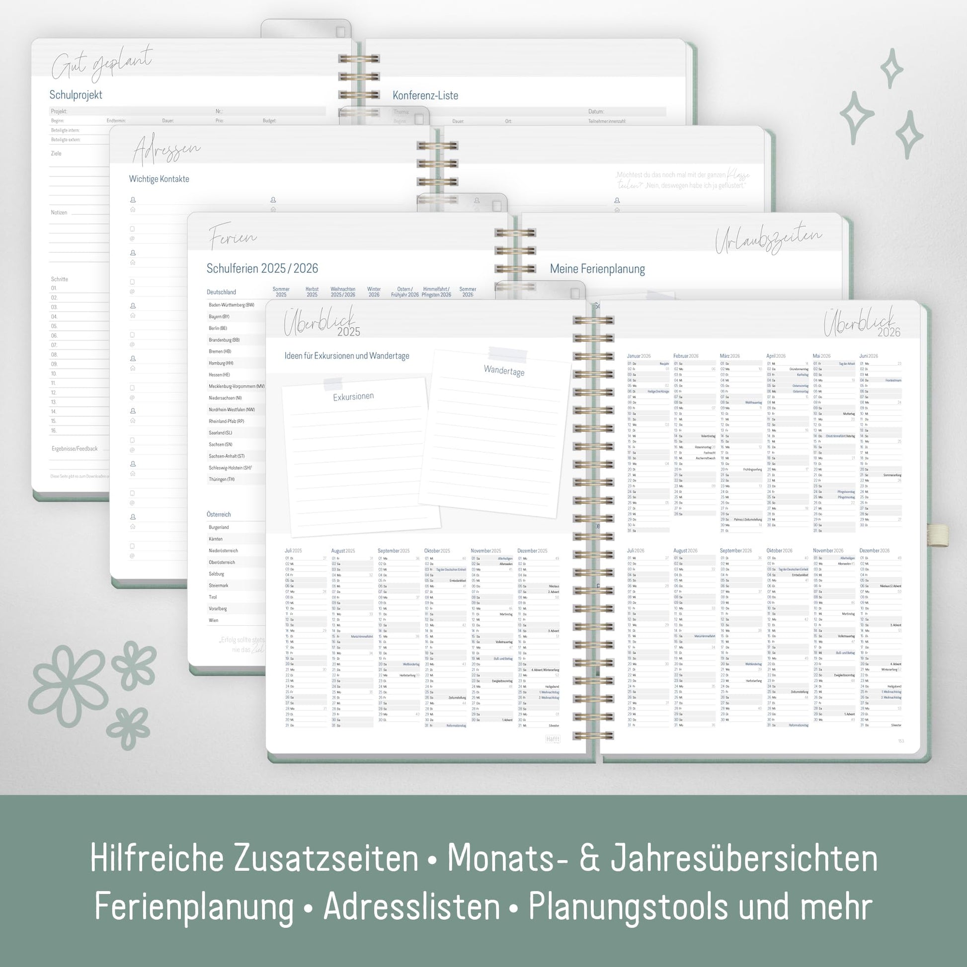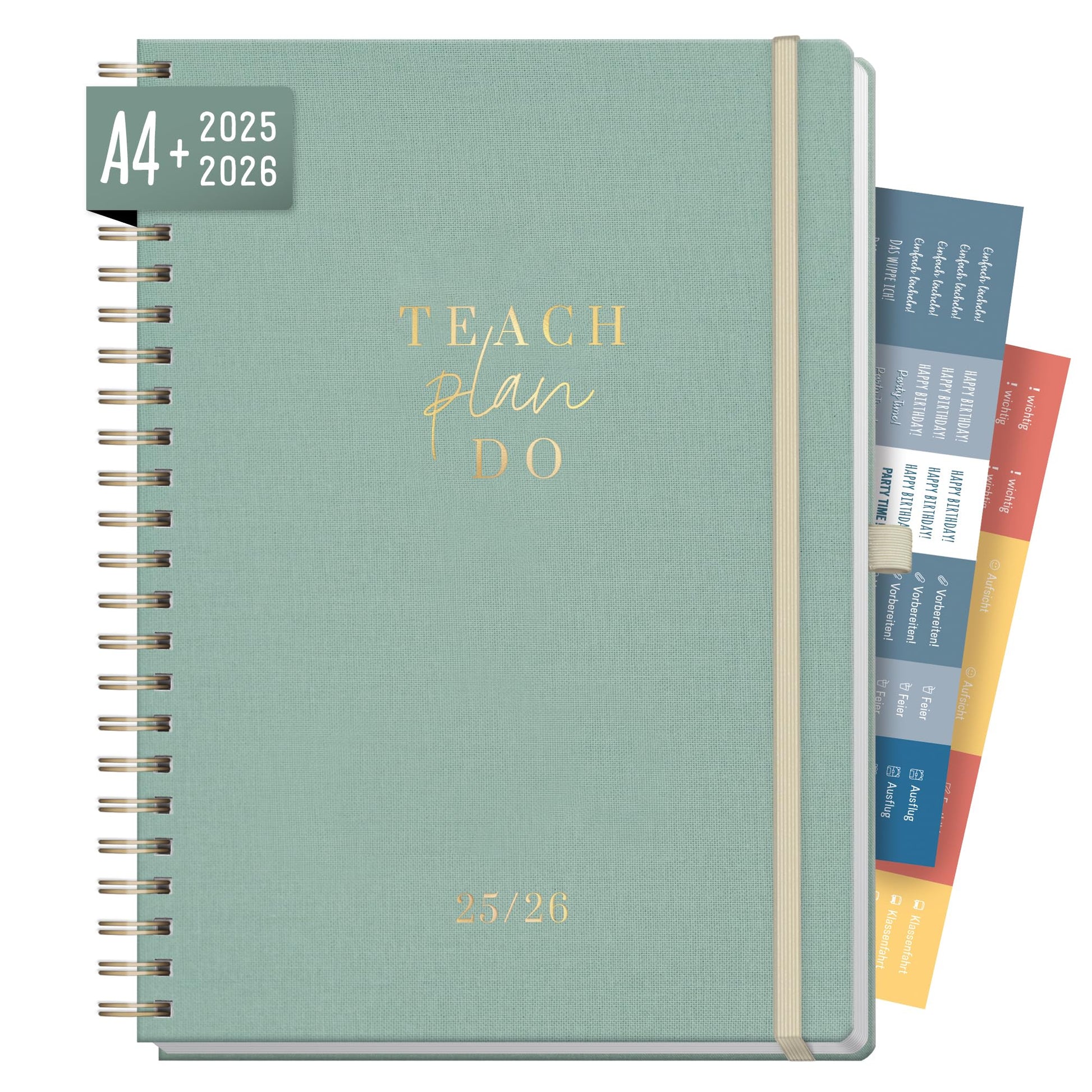 "INSPIRING TEACHER PLANNER 2025/2026 A4 - Double-sided weekly calendar from August 2025 - July 2026, with stickers & quotes. IN DELUXE COMFORT: Metal spiral, shiny foil embossing, rounded corners, elastic band, pen loop, bookmark for hanging.