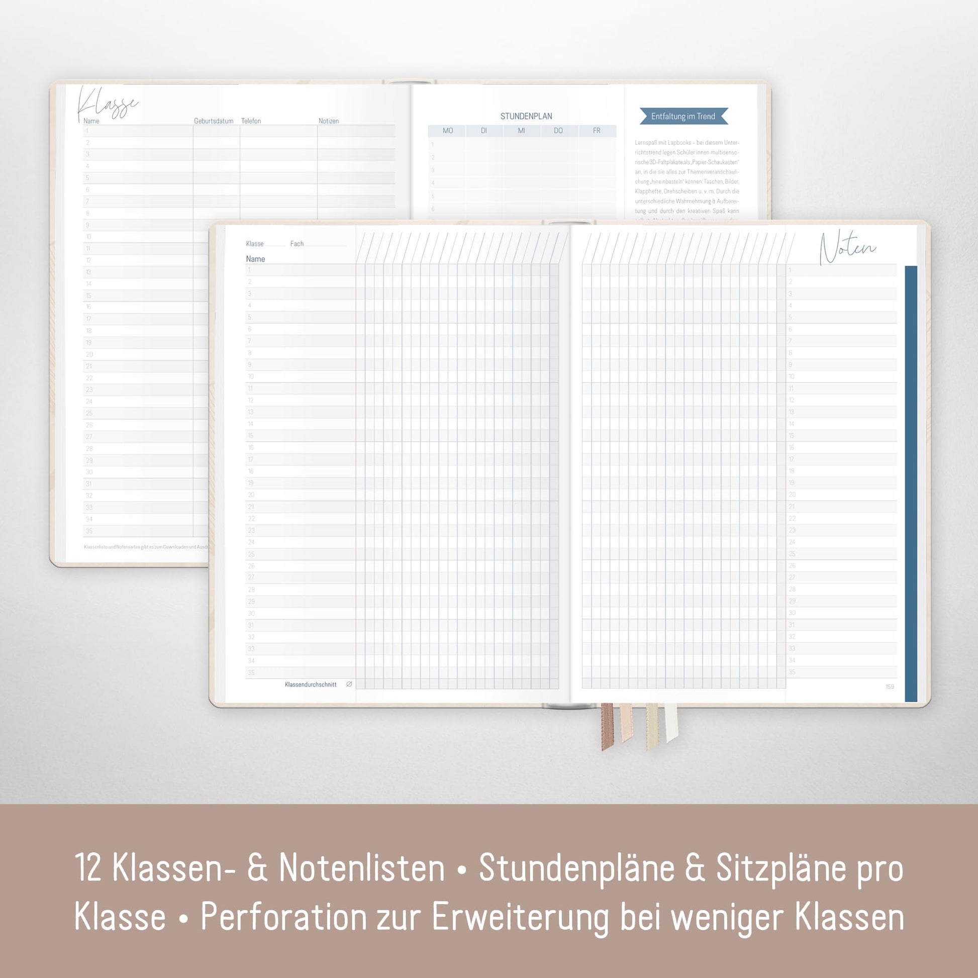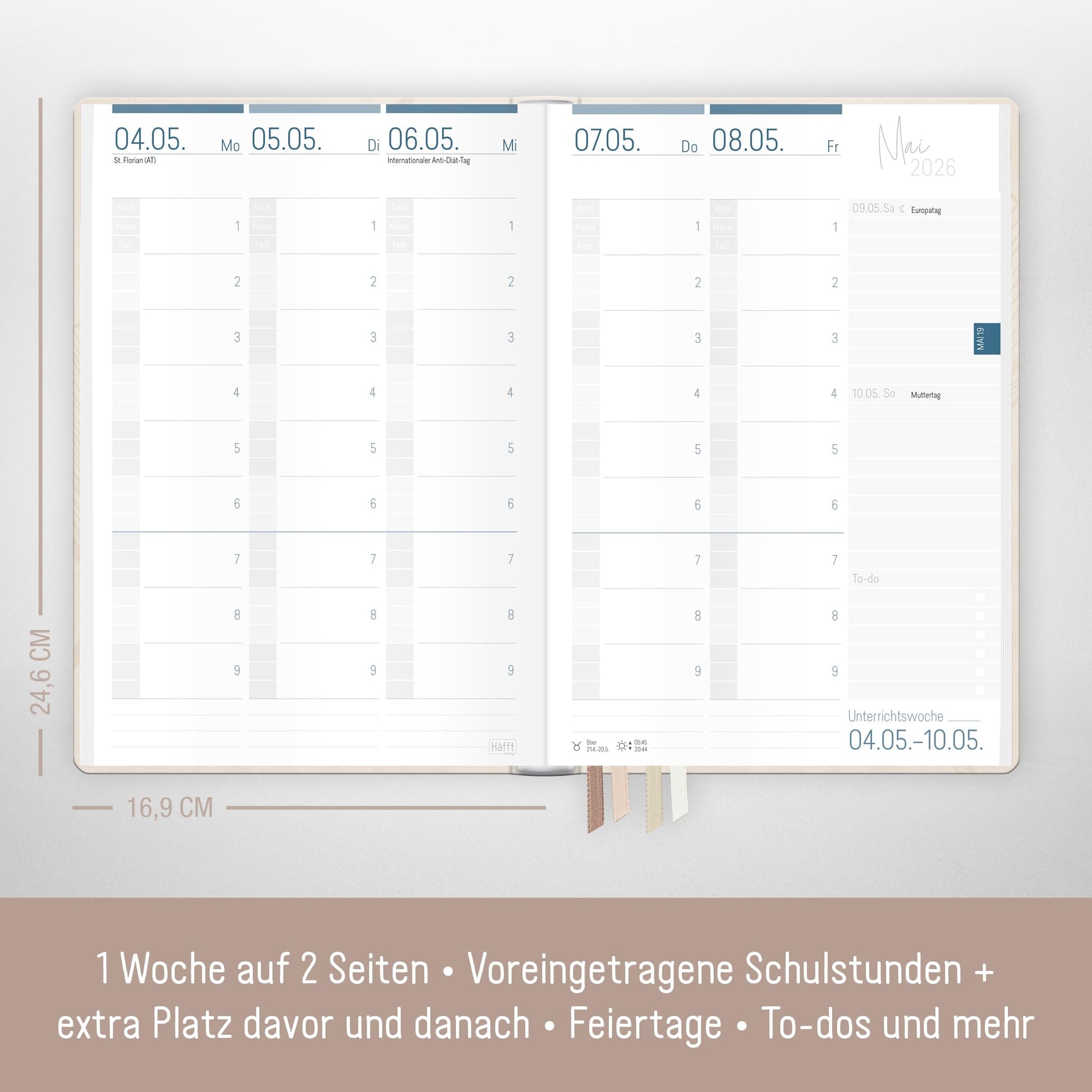 "MOTIVATING TEACHER PLANNER 2025/2026 A5 - Duration August 2025 - July 2026: Weekly planner with one week on two pages, practical stickers, small pocket, 4 bookmarks as quick finders for the most important pages & helpful extras.