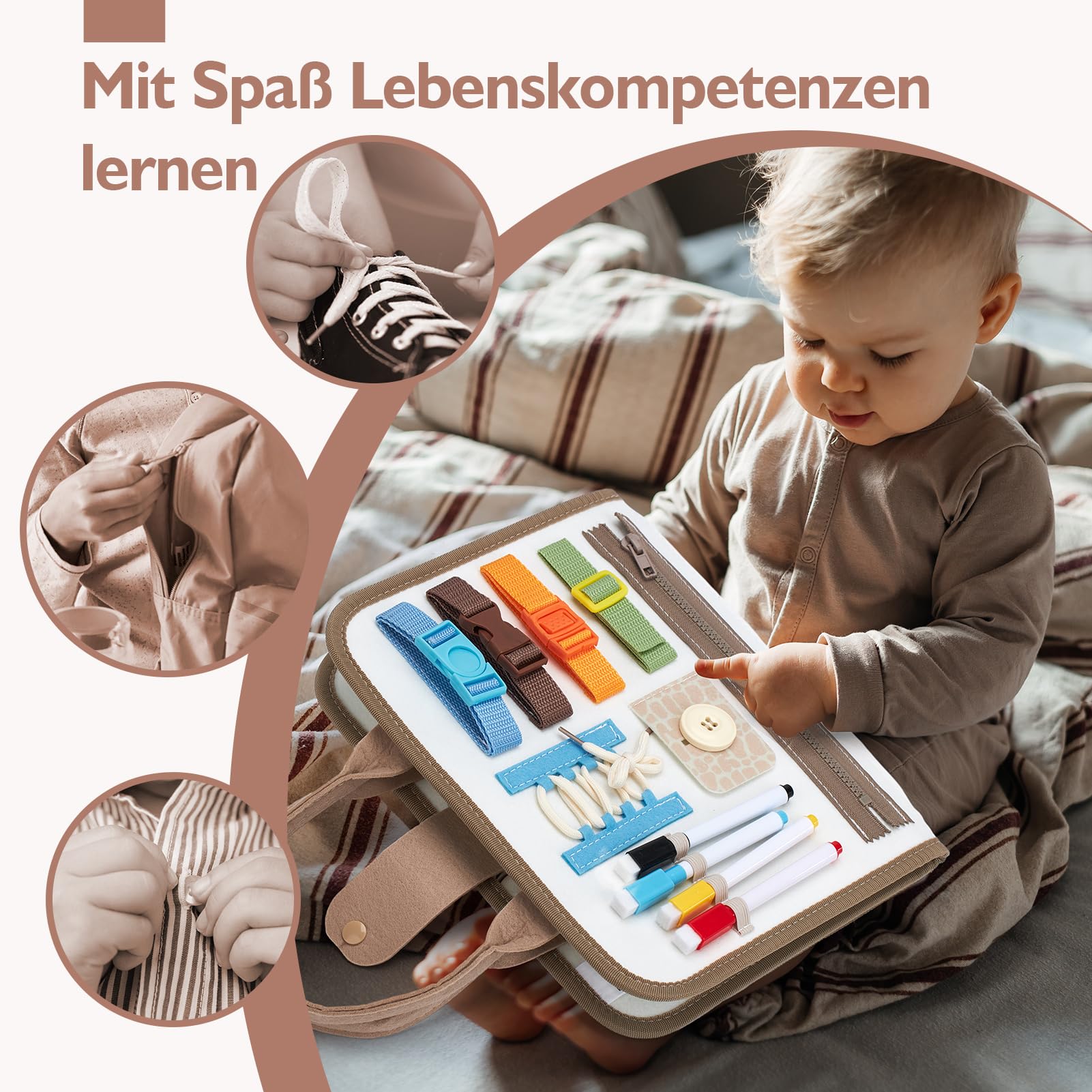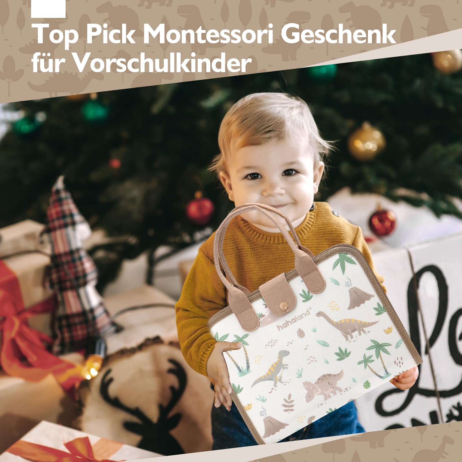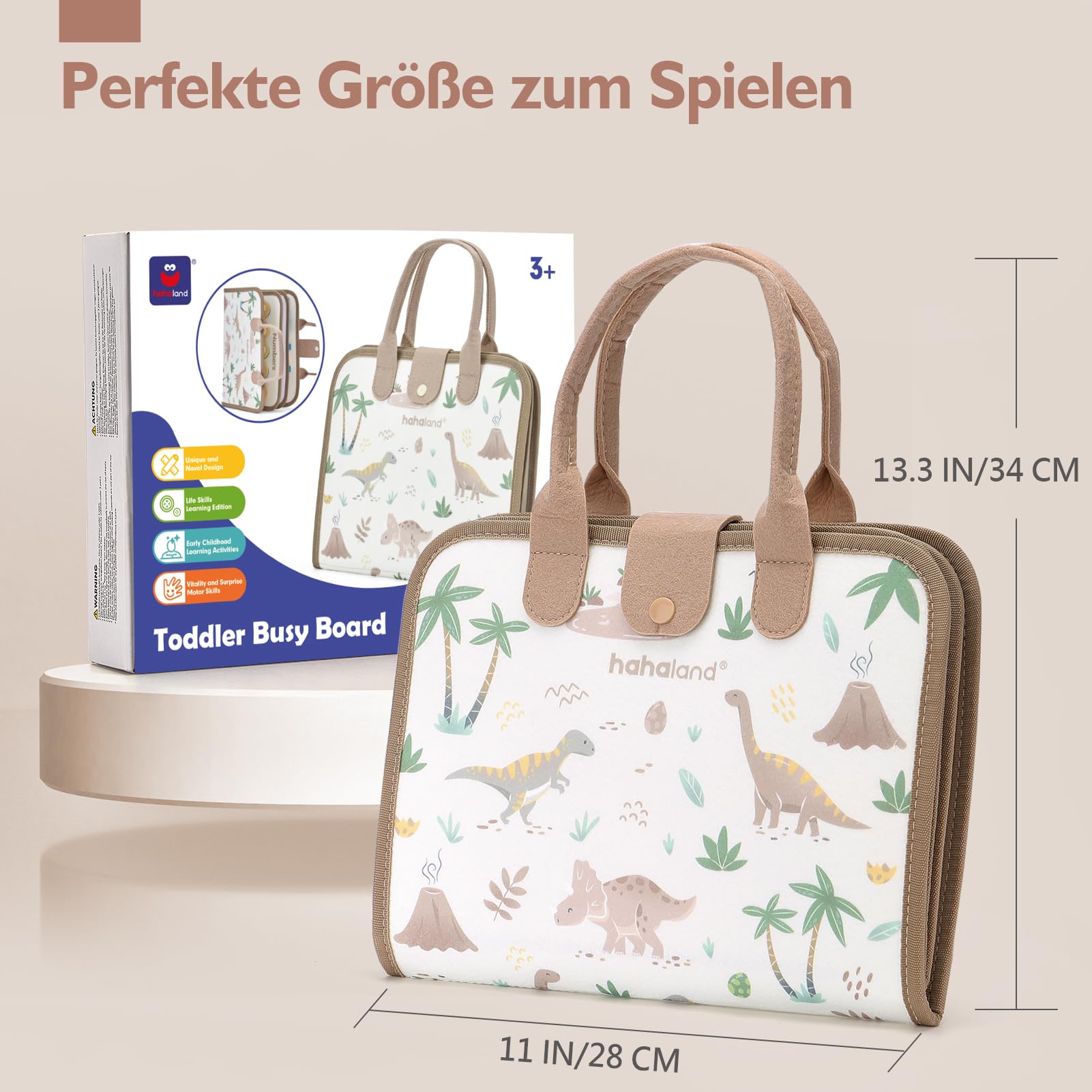 ["🦖【6 IN 1 DINOSAUR THEMED BUSY BOARD】Embark on a prehistoric adventure with our Dinosaur Activity Board! The 6 in 1 Busy Board features exciting themes such as dinosaurs, numbers, shapes, alphabet, drawing, and life skills to engage little ones and provide interactive learning experiences.","🎨【CREATIVITY & VERSATILITY】Quiet Book includes a drawing board with 4 colored markers for endless drawing. With 5 dinosaurs, 10 numbers, 9 shapes, and 26 letters, the Montessori motor skills toy is ideal for promoting creativity and a love for learning.","💡【PROMOTES LIFE SKILLS】While promoting learning of letters and numbers, it also teaches practical life skills such as tying shoelaces, buckling, buttoning, and zipping. The Montessori toy 3 years old enhances fine motor skills and hand-eye coordination.","♥️【PRACTICAL STORAGE】No more lost pieces! Our toys for 3 year olds feature convenient zipper pockets where your child can easily store accessories. This thoughtful feature ensures all components stay together.","🚗【TRAVEL-FRIENDLY & EDUCATIONAL】hahaland Montessori Toy 3 4 5 years old is made of soft felt, has a portable handle, and is small enough to fit easily in a backpack, making it perfect for travel. It offers a fun and educational alternative to screen time to keep kids entertained on the go"]