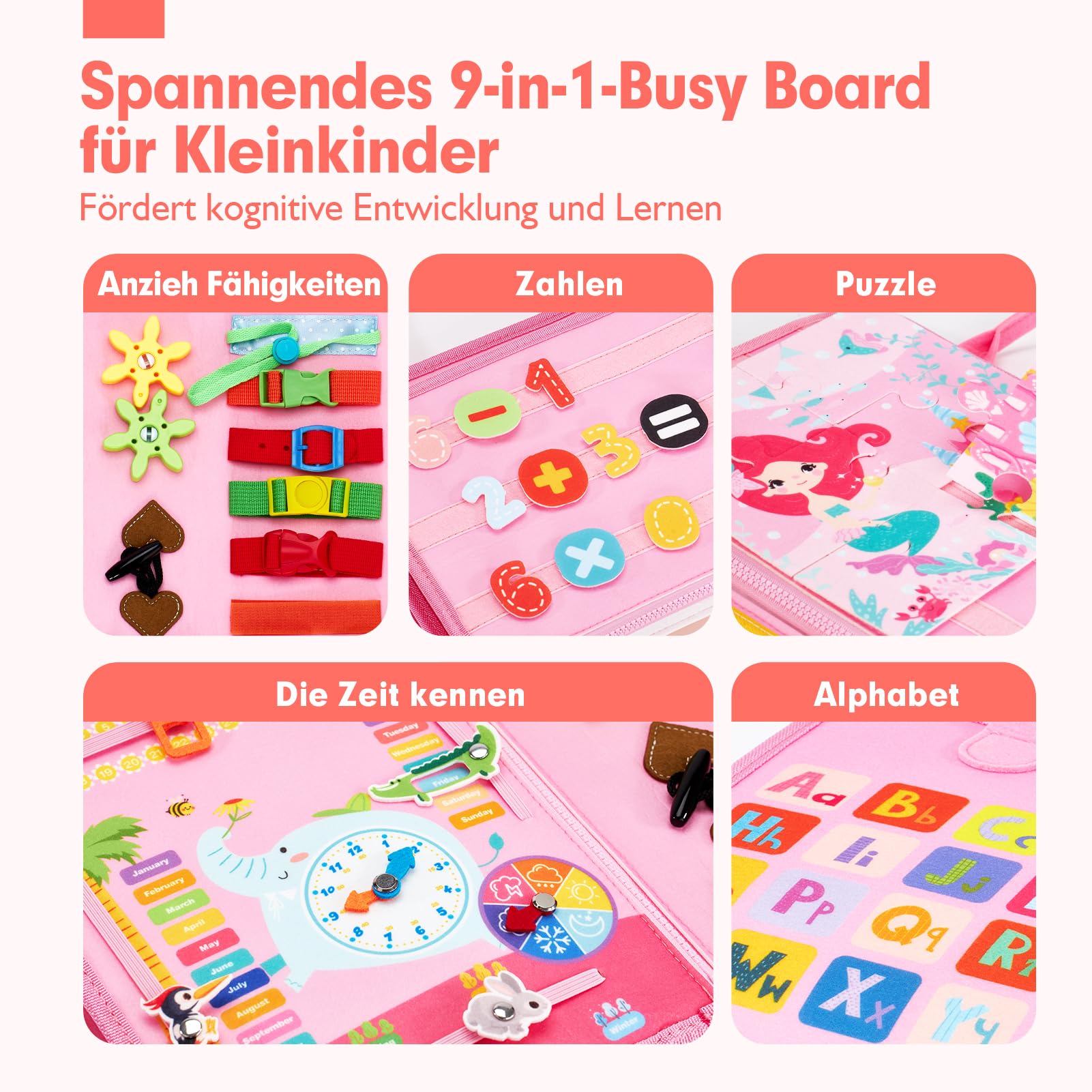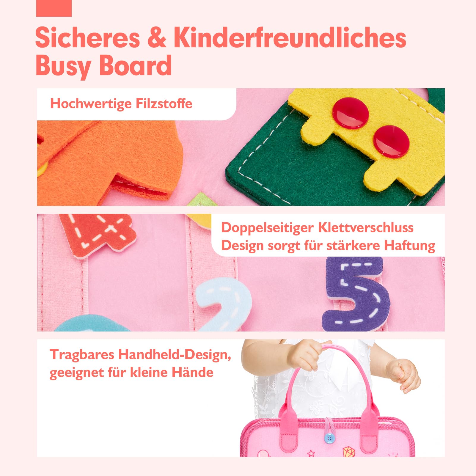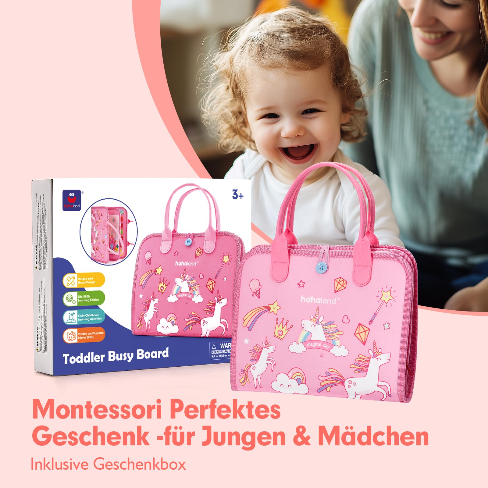 ["💯 【9-IN-1 MONTESSORI TOY】The hahaland Busy Board is a specially designed Montessori baby toy that promotes children's development holistically. Children's toys with exciting activities such as letters, numbers, time, weather, puzzles, animals, and clothing pique the interest of little ones while also supporting cognitive, linguistic, and motor skills.","💡 【CREATIVE AND INTERACTIVE ACTIVITY BOARD】Busy board offers a variety of interactive games, including number-letter combinations, removable puzzles, weather and time learning modules, and everyday scenarios. These elements stimulate your child's creativity and promote parent-child interactions. Perfect for children looking for a versatile motor skills toy!","🧦 【15 LEARNING AND LIFE SKILLS】Montessori Busy Board offers 15 everyday games, including tying shoelaces, buttoning, and Velcro closures. These activities enhance fine motor skills, problem-solving abilities, logical thinking, hand-eye coordination, and cognitive skills. It is an ideal learning toy for children and provides hours of fun.","💡 【HIGH-QUALITY AND SAFE DESIGN】Made of soft premium felt, the Busy Board is lightweight, non-toxic, and skin-friendly. All parts are securely attached, so no small parts are lost or hazards arise. A reliable choice for parents looking for a high-quality quiet book.","🚌 【IDEAL FOR TRAVEL & AS A GIFT】Activity book is lightweight, portable, and equipped with a convenient handle - perfect for car rides, outdoor activities, or outings. It replaces screens, entertains children, and promotes their learning development. As a birthday or Easter gift, this Busy Book is an excellent choice for boys and girls alike."]