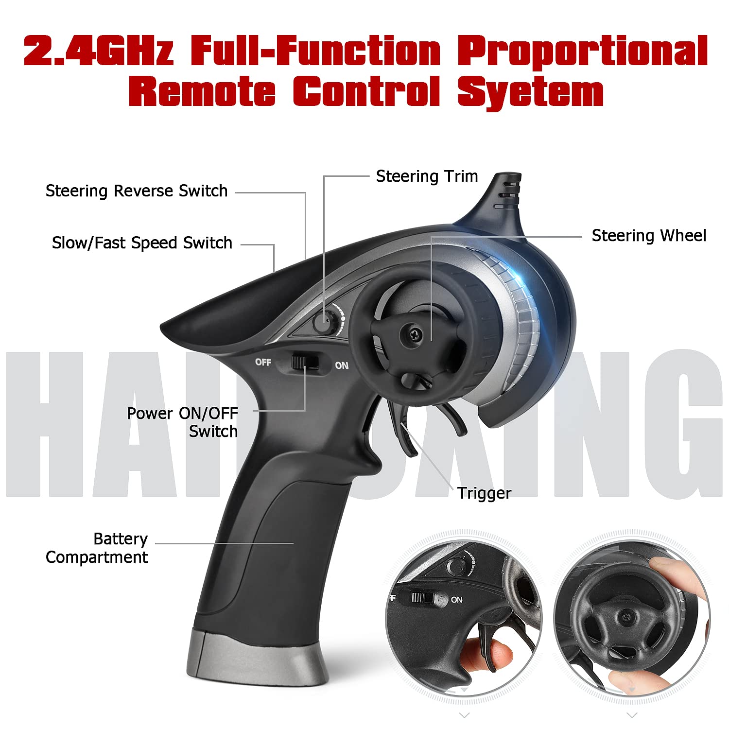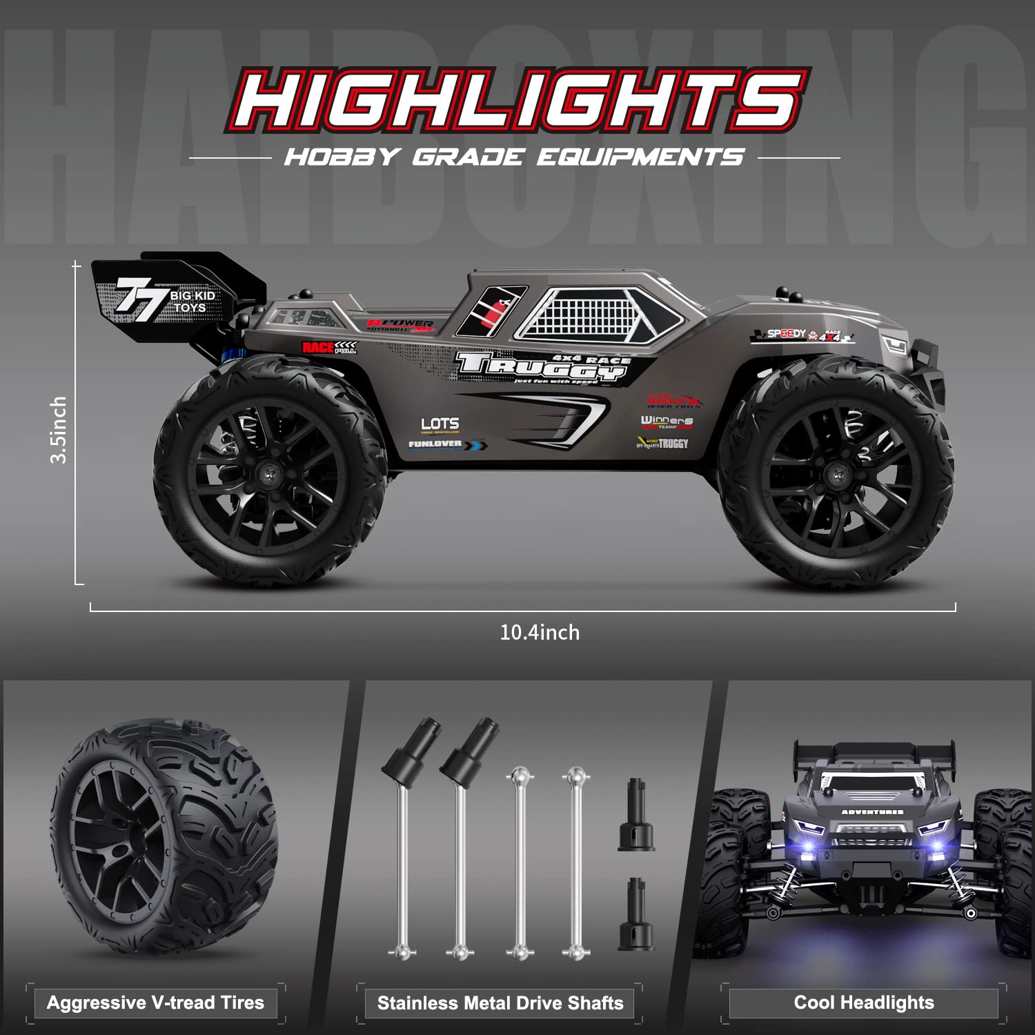 ["【OFFROAD CHASSIS IN HOBBY QUALITY】 This truggy is designed for hobby RC and features front/rear independent suspensions, metal drive shafts, gear differentials, 9g 3-wire metal gear servo, and 16 ball bearings throughout the drivetrain. Easy to drive and performs well on short grass, gravel, and concrete roads.","【POWERFUL & AMAZINGLY FAST】 Powered by a 380 motor and driven by 7.4V 850mAh 25C softpack LiPo batteries, this RC truck reaches speeds of up to 36 km/h. Chassis and suspensions are made of flexible PA materials to protect RC trucks from collisions and impacts. Proportional steering and throttle control provide stable acceleration and precise steering performance. High/low speed switch on the remote control for beginner practice.","【WATERPROOF ESC QUALITY PROTECTION】 The fully functional 2.4GHz radio control reaches a range of 280 feet and allows multiple players to play simultaneously without signal interference. Waterproof electronics allow 4WD RC cars to drive through puddles or on a rainy day. Excellent and durable electronics embody technical anti-lock protection, overcurrent and overheat protection, and low battery voltage cutoff.","【RELIABLE BRAND EXQUISITE CRAFTSMANSHIP】 With over 20 years of experience in manufacturing professional RC vehicles, our trucks benefit from enhanced precision, maneuverability, and durability. The user-friendly, wide-open chassis design allows for quick access to parts or exchanging of upgrade parts. Aggressively looking, grippy rubber tires, a flexible PA material off-road wing, and a vibrant screen-printed PVC body with DIY stickers bring your off-road RC car to life.","【PERFECT HOLIDAY TOY GIFTS】 This fast RC car is an entry-level hobby RC truggy designed for experienced beginners and kids. This remote control car will be a gift for your friends or children. On your marks. Get set. Start with Haiboxing RC Cars."]