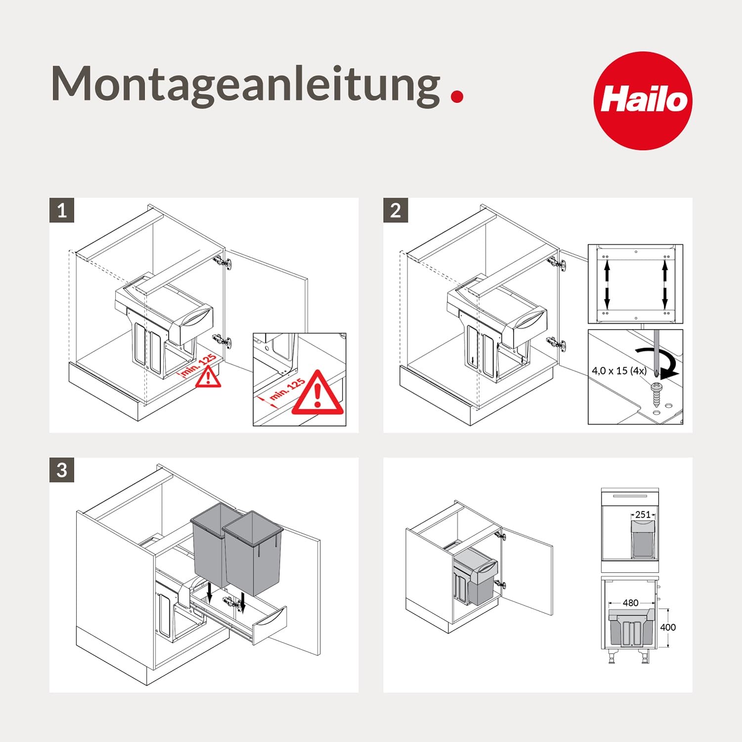 ["WASTE COLLECTION SYSTEM TANDEM WITH 2-PART SEPARATION - The Hailo waste system allows for efficient separation of garbage. With two separate bins, your kitchen stays clean and organized.","GARBAGE COLLECTOR WITH 2x 15 LITRE CAPACITY - The system offers two inner buckets with 15 liters each. Ideal for simultaneous separation of different types of waste such as residual waste and recycling.","BUCKETS EQUIPPED WITH STURDY METAL HANDLES - Each bucket is equipped with robust metal handles that allow for easy removal and carrying. This ensures easy and hygienic handling.","BALL-BEARING TELESCOPIC RAILS WITH FULL EXTENSION - The telescopic rails allow for a smooth and complete extension of the waste system. This makes it easier to access the buckets, even in narrow cabinets.","MOUNTABLE FROM A CABINET WIDTH OF 30 CM - The waste system can be installed in base cabinets from 30 cm width. It flexibly adapts to different kitchen cabinets.","SIMPLE AND FAST FLOOR INSTALLATION - The installation is done directly on the cabinet floor and can be completed with just a few simple steps. All necessary mounting materials are included in the delivery.","COMFORTABLE DELIVERY CONTENTS - The product comes complete with all necessary screws and an assembly instruction. This makes installation easier in various installation situations.","STURDY LID CAN ALSO BE USED AS A SHELF - The lid of the system remains in the cabinet and can be used as a practical shelf for smaller utensils."]