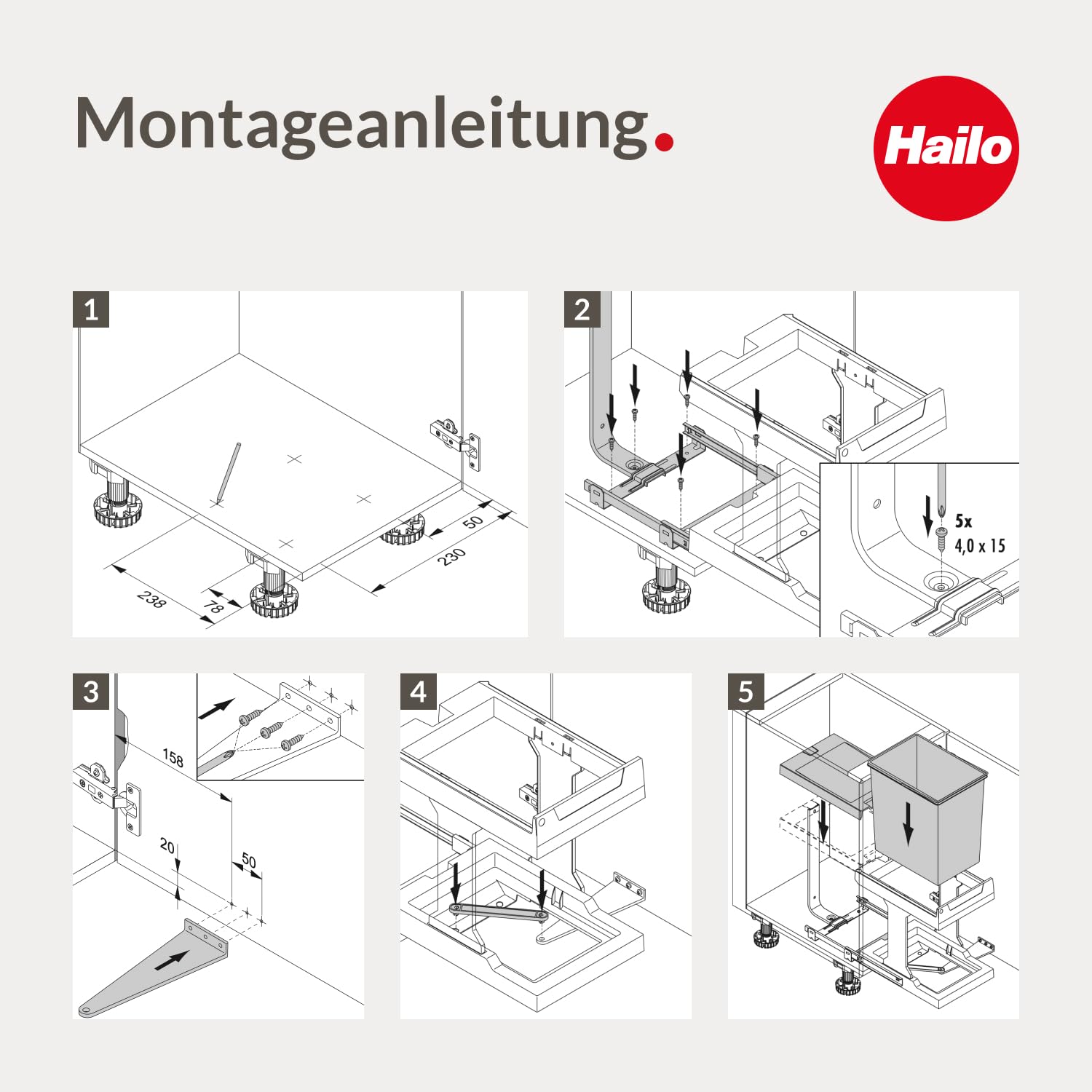 ["Hailo Waste Collector Solo 20 Liter Automatic","for cabinets with right / left hinged door","Dimensions (WxDxH): 245 x 427 x 396 mm","easy floor installation with included screws","equipped with an inner bucket with handle"]