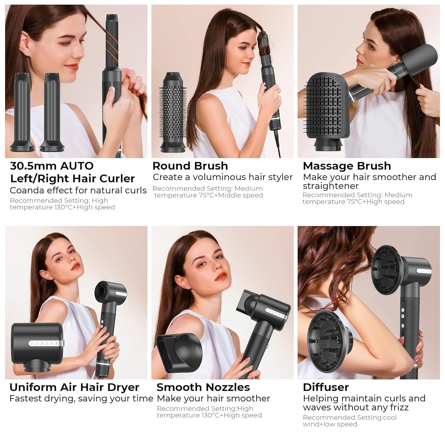["【Curly All In One Air Styler】A strong airflow flows from the curling rod attachment, continuously forming an airflow in a clockwise direction around the curling iron, enhancing the Coanda effect and ensuring that the hair automatically sticks to the surface. Creates voluminous, smooth, and natural curls without extreme heat. Meet all your styling needs. Please download the product method: product threads and documents User manual (PDF).","【Airstyler - Hair Styler 7 in 1】This 7 in 1 hot air brush set includes 1 * hair dryer, 1 * round brush hairdryer, 2 * Air Curling Iron, 1 * straightening brush, 1 * diffuser, 1* styling nozzle, making drying, straightening, curling, volumizing, and massaging the scalp a breeze. This Air Styler offers the perfect way to create different hairstyles for different hair lengths. Gloves when changing the detachable attachments to avoid burns.","【110,000 RPM High-Speed Motor】The UKLISS self-developed high-speed motor with up to 110,000 RPM generates a fast and powerful airflow at a speed of up to 20 M/s, which is 6 times stronger than a conventional hair dryer hot air brush. For ultra-fast drying without heat damage, reducing your styling time by half. The airflow with negative ions acts on the hair, volumizing it and making it look stronger and more elegant.","【3 Temperature - 3 Wind Speed】To turn on, you must press and hold for 3 seconds, ➤ 1: Low temperature, for dry hair / fine hair, suitable for summer. ➤ 2: Medium temperature 75℃, for semi-dry hair / normal hair, suitable for styling. ➤ 3: High temperature 130 ℃, for wet hair / thick and curly hair, suitable for winter use, drying hair quickly.","【Unique Design】The hair styler set 7 in 1 Set combines an ion hair dryer with the popular airwrap curling iron head design. You can combine it with different brush heads to create trendy looks. The exquisite packaging also allows you to use it as a gift for friends, family, or other people you love. If you have any doubts about the product, please contact us in time."]