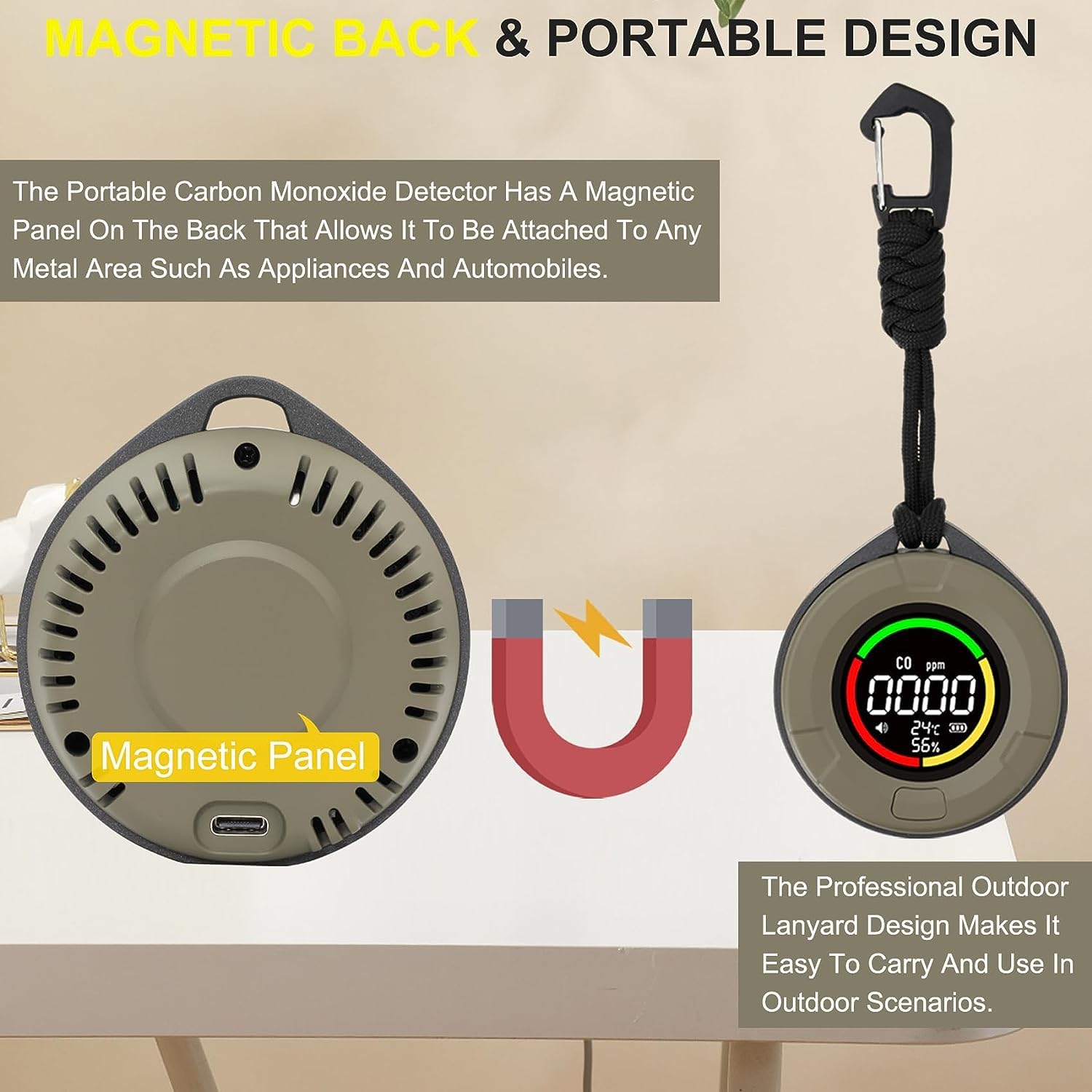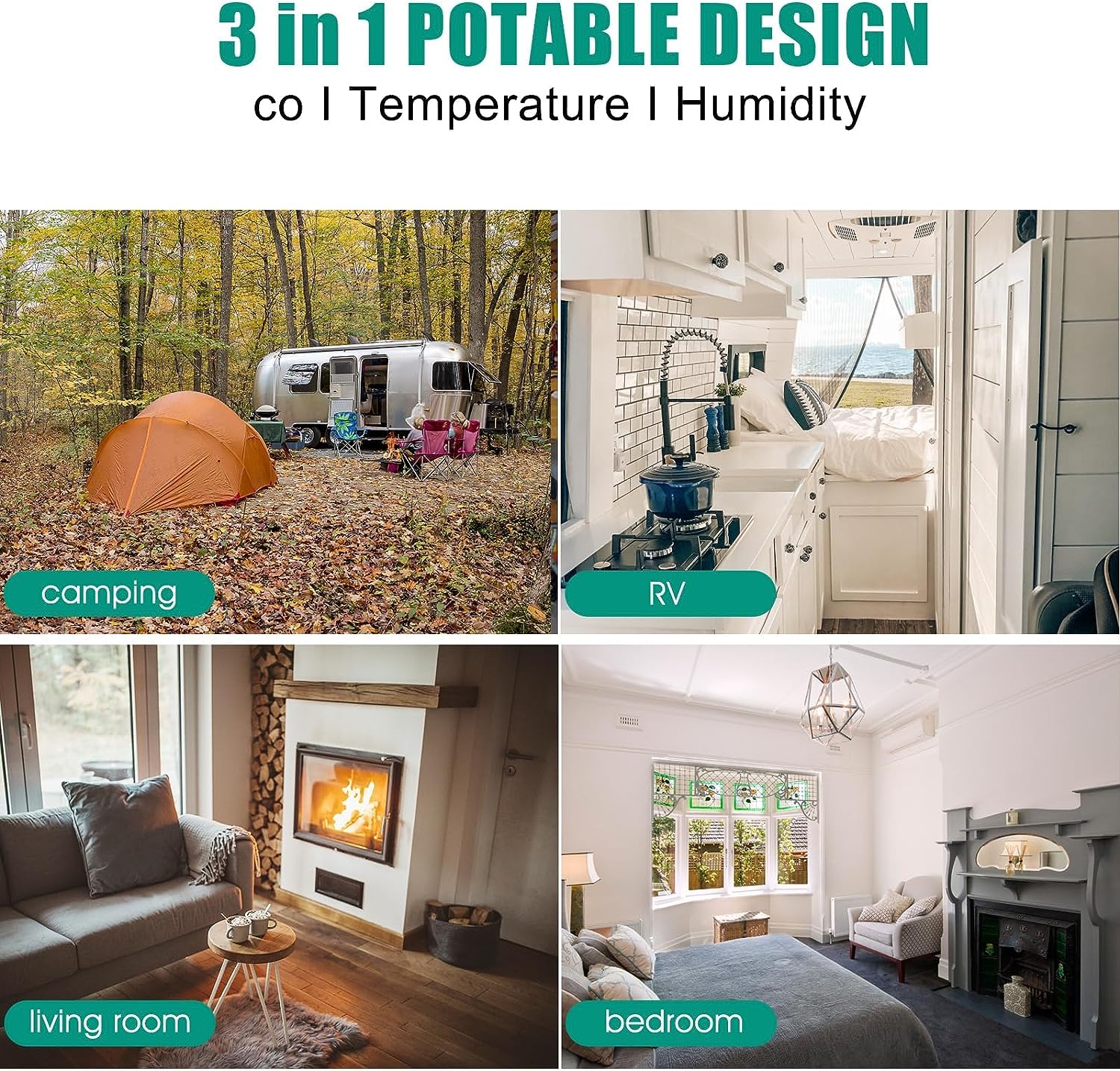 ["Multifunctional & Portable: This CO detector is a 3-in-1 combined device for carbon monoxide, temperature, and humidity. The compact and portable design makes this CO detector very suitable for use in cars, RVs, or while traveling. It can protect you from carbon monoxide poisoning anytime, anywhere.","High-Precision Carbon Monoxide Sensor: This CO detector uses the principle of electrochemical reaction to quickly and accurately measure the CO concentration. The built-in carbon monoxide sensor has high accuracy and a long lifespan. It is certified with EN-50291 (EU standard for CO detectors) and provides high reliability.","LCD Screen & Audible Alarm: All measurements are updated every two seconds and displayed on a high-resolution LCD screen, making the CO concentration visible and easy to read. When the CO concentration exceeds 50 ppm, this CO detector emits an audible alarm.","Built-In Rechargeable Lithium Battery: The built-in 1000 mAh battery can keep this CO detector operating continuously in standby mode for approximately 100 hours. It supports various fast charging protocols, including QC2.0, PD3.0, AFC, FCP, SCP, etc. You can also keep this CO detector connected to a USB charger at all times to continuously monitor the CO concentration when needed.","Standby Mode: After one minute of inactivity, this CO detector automatically turns off the screen backlight and enters standby mode for energy saving. In standby mode, the CO sensor continues to work and continuously monitors the CO concentration.","ATTENTION: This is a carbon monoxide (CO) detector, not a carbon dioxide (CO2) detector. When you turn on this detector in a normal indoor environment with clean air, it is normal for the carbon monoxide display to show 0, as there is no carbon monoxide in clean air."]