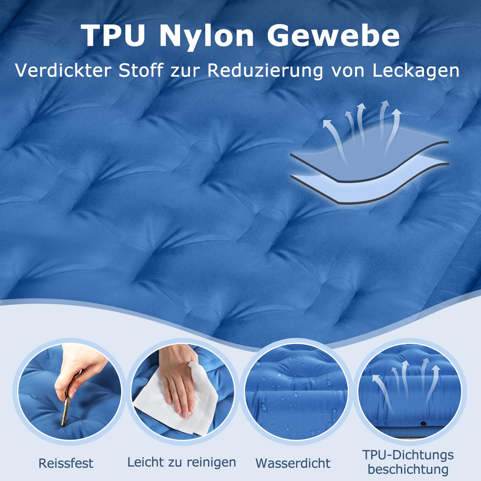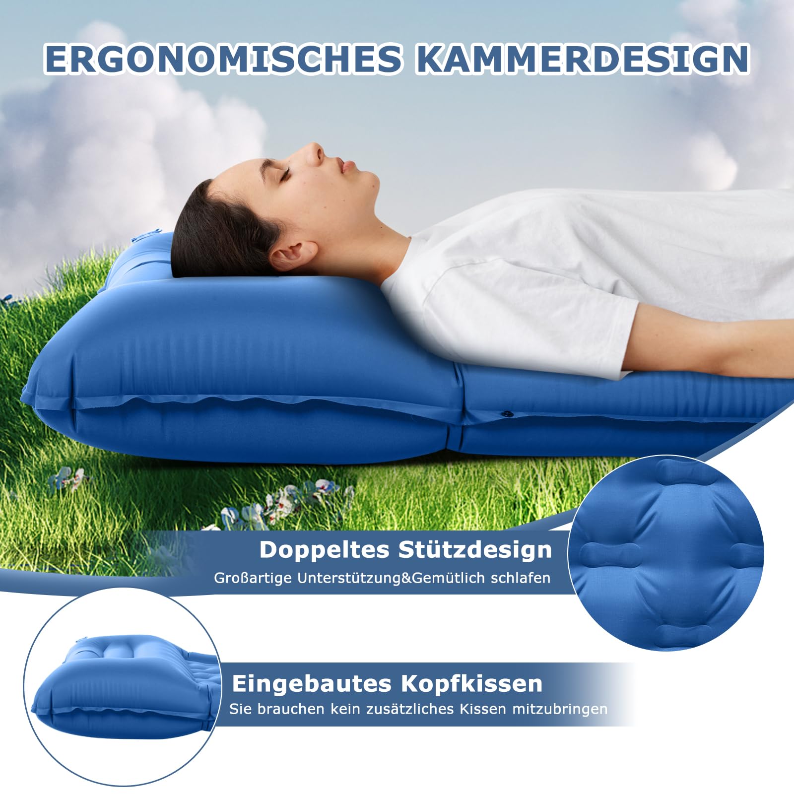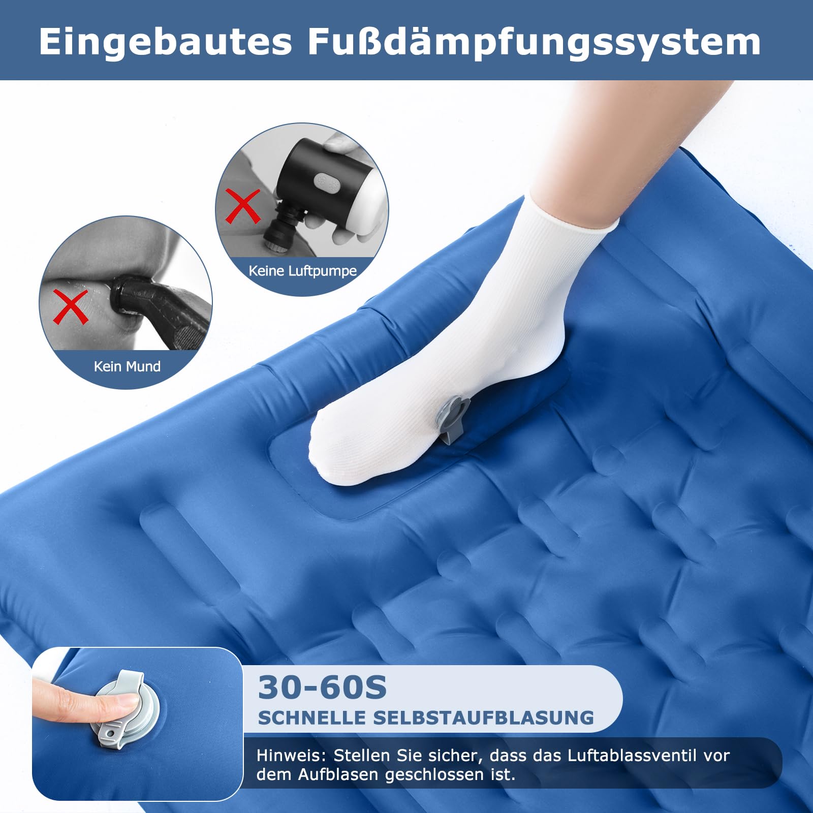 ["12cm thick Insulating sleeping pad for Ultra comfort - Improved design since 2024, inflatable air mattress, fully inflated with a thickness of up to 12cm, width up to 72cm, without worrying about sleeping on the ground! For a deeper and more restful sleep compared to typical camping mattresses. Maximum sleeping comfort, sleep just as well outdoors camping as at home.","Foot inflatable camping mattress - fully inflated in 30 - 60 seconds: Save time and effort inflating, No pump or blowing needed. Our air mattress has two valves, one for easy inflation within 1 minute with the included pump sack and one for quick deflation in 1 minute.","High-quality air mattress - This inflatable camping mattress is made of a puncture-resistant, up to 40D nylon and premium TPU material. In addition, the material is highly durable and sturdy. The top is very soft, creating a comfortable sleeping experience. Versatile - not only for outdoor but also for home. Your guests will love you for this bed. Our Air Mattress has a sophisticated two-layer compression rubber process, strong load-bearing, pressure-resistant and burst-proof.","Curved pillow area for better ergonomics and comfort: - The structure and height support the body in the lying position. When the interior is filled with air pressure, the support straps built into the chamber are taut and can also provide support. You will lie comfortably and your spine will be supported. The water-repellent sleeping surface provides a dry sleeping area. The air mattress achieves the same comfort as a conventional mattress through the use of the air chamber system. An integrated pillow provides additional neck relief.","One-Touch Patchwork to Double Bed - With buttons on the side, you can easily connect two air mattresses and transform them into a double bed. Perfect for the whole family or a couple. The maximum load can be up to 300 kg. A very practical gift idea for families and friends.","Lightweight & Portable Insulating sleeping pad - Inflated size: 200*72*12cm, folded size: 30*16*10cm. The sleeping pad with box weighs only 1kg, making it easy to carry. Therefore, this sleeping pad is perfect for outdoor activities or mountain tours, biking, hiking or camping. Note: Please avoid sharp stones and thorns so that the inflatable air mattress is not punctured and the air escapes."]