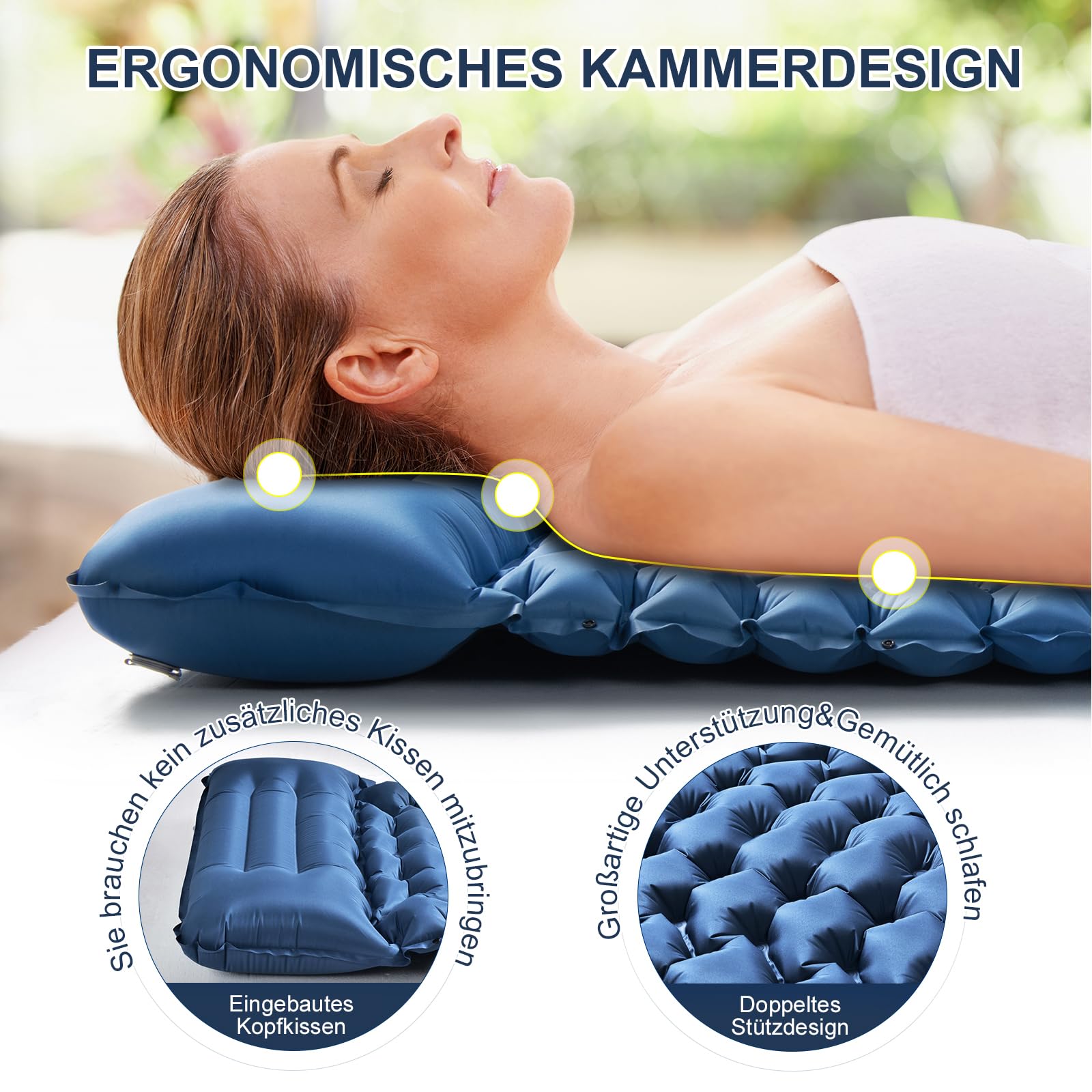 Curvature of the pillow area for better ergonomics and comfort: - The structure and height support the body in the lying position. When the interior is filled with air pressure, the support straps built into the chamber are tight and can also provide support. You will lie comfortably and your spine will be supported. The water-repellent lying surface ensures a dry sleeping place. The air mattress achieves the same comfort as a conventional mattress due to the air chamber system used. An integrated pillow provides additional neck relief.