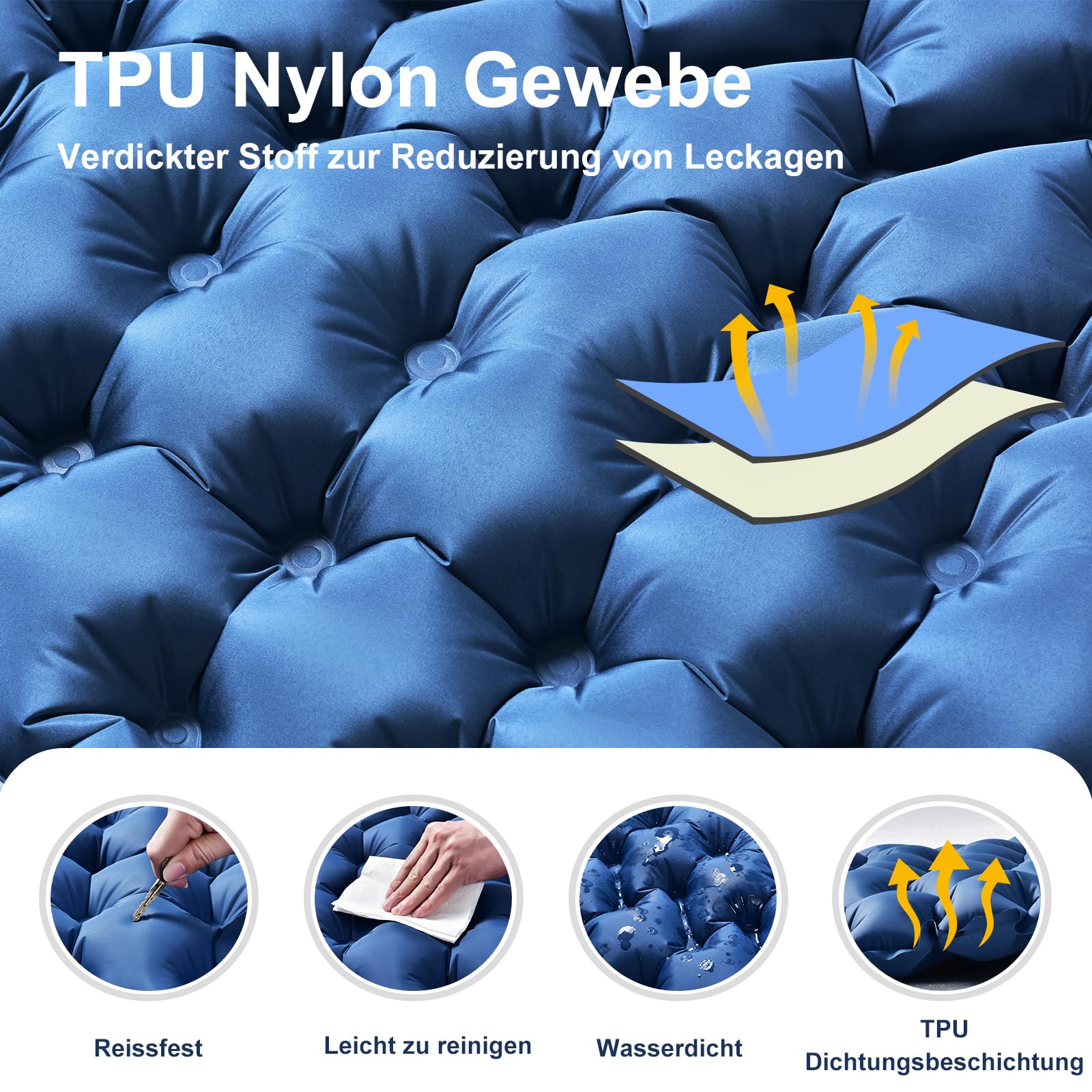 "High-quality Air Mattress - This inflatable camping mattress is made of a puncture-resistant, up to 40D nylon and premium TPU material. One side nylon, one side Pongee + TPU. If you are a sensitive sleeper and afraid of noise, you can use the Pongee side so that it doesn't rustle when you sleep on it. The material is extremely durable and sturdy. The top is very soft, creating a pleasant sleeping comfort. Versatile - not only for outdoor use but also for home. Your guests will love this bed.