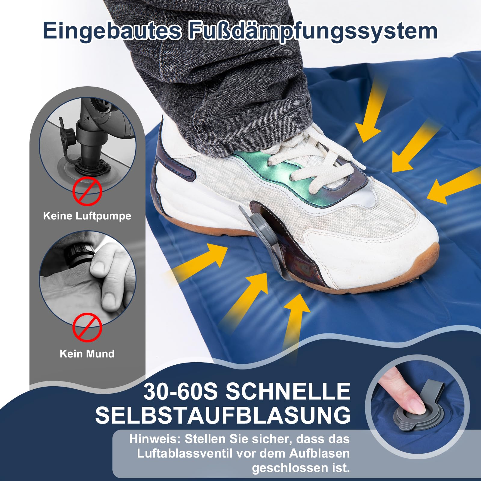 Per foot inflatable camping mattress - completely inflated in 30 - 60 seconds: Save time and effort, No pump or inflation needed. Our air mattress has two valves, an inflation valve for easy inflation within 1 minute with the included pump sack and an exhaust valve for quick deflation in 1 minute.