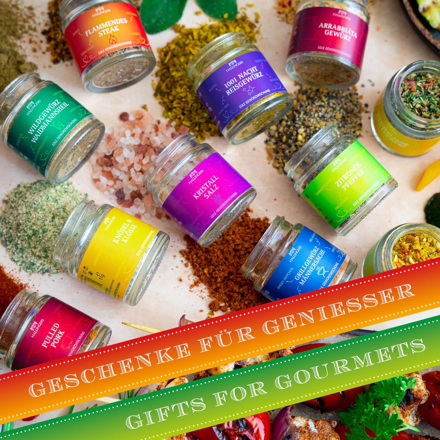 "Finest gourmet spice set from Hallingers - in 12 mini jars airtight and resealable, refillable and long-lasting. Perfect spice gift for men and women!
