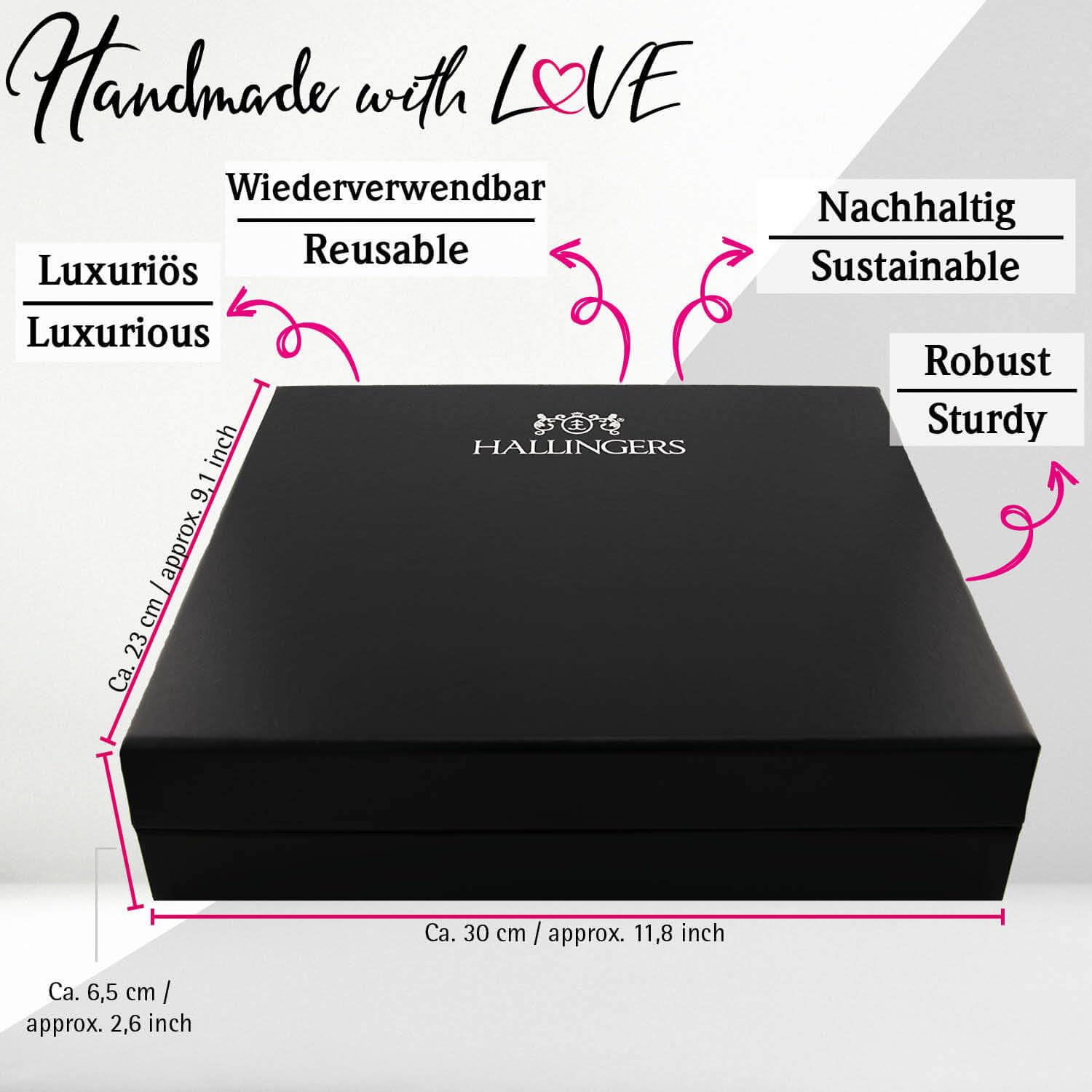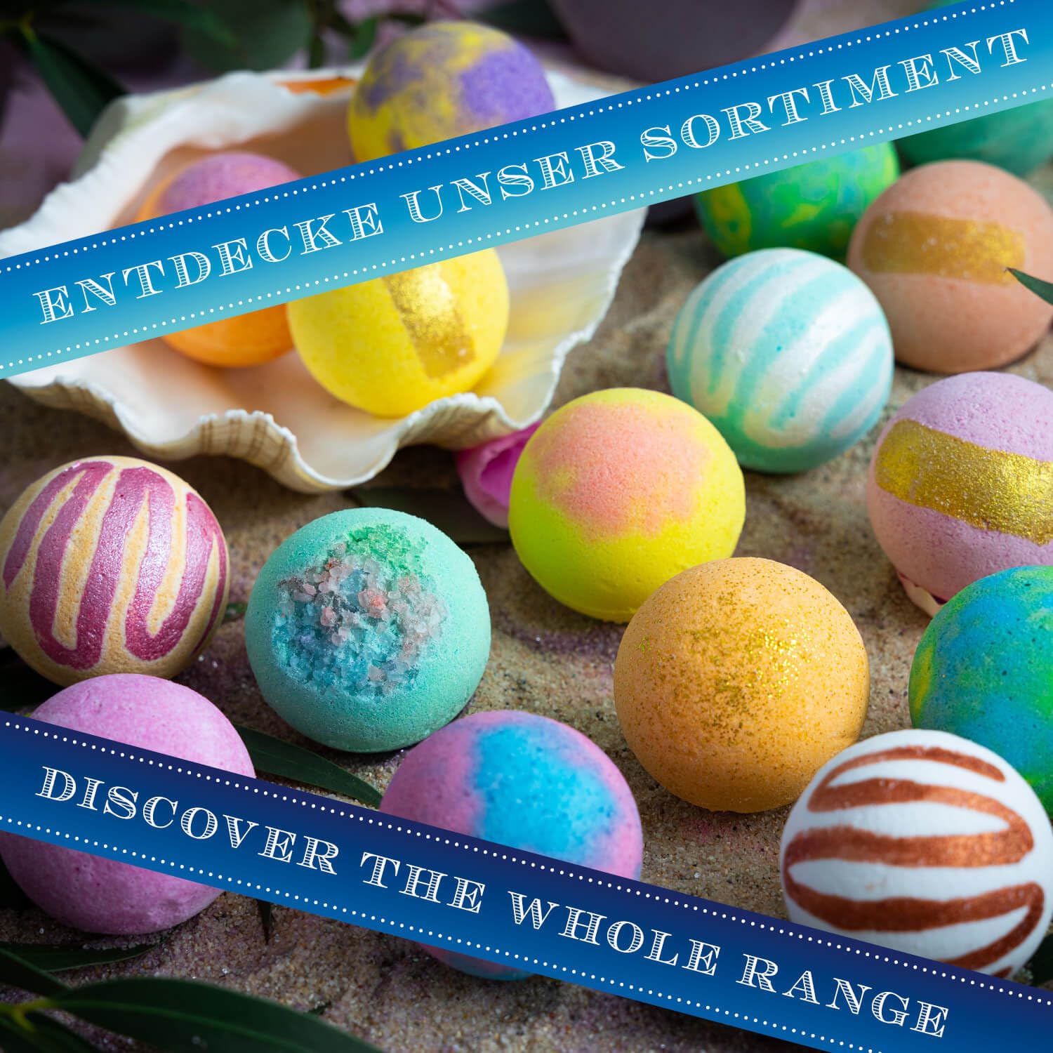 ["12 beautiful bath bombs enriched with high-quality flavors and oils", "Can be gifted right away - the box is very high-quality and chic!", "A great gift idea!", "Make yourselves beautiful!", "Hand-filled and packed with love ALLERGENS: May contain traces of gluten and nuts. --- Note on primary ingredient(s): Salt not sourced from Bavaria/DE"]