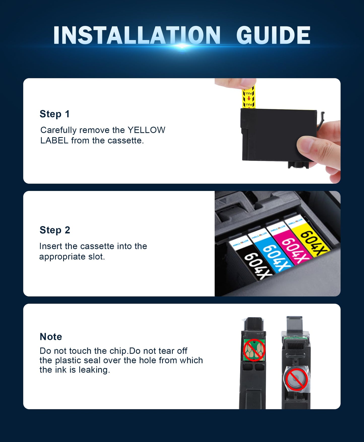 ["Content: 10-pack set of 604 cartridges for Epson 604 XL 604 cartridges 604 XL multipack for Epson 604 cartridges (604 XL Black, 604 XL Cyan, 604 XL Magenta, 604 XL Yellow)", "Printer cartridges 604 604 XL cartridges compatible for Epson Expression Home XP-2200 / XP-2205 / XP-3200 / XP-3205 / XP-4200 / XP-4205 for Epson Workforce WF-2910 / WF-2930 / WF-2935 / WF-2950 / WF2910DWF / WF2930DWF / WF-2935DWF / WF2950DWF series printers", "High page yield: 500 pages per 604XL 604 Black cartridges; 350 pages per 604 XL Cyan/Magenta/Yellow multipack printer cartridges for Epson 604 cartridges (at 5% coverage)", "Package contents: 4 Black, 2 Cyan, 2 Magenta, 2 Yellow, Compatible for Epson XP 2205 cartridges", "Product benefits: 604XL 604 XL multipack cartridges for Epson printer cartridges 604 produce with brilliant colors and sharp black printing effects"]